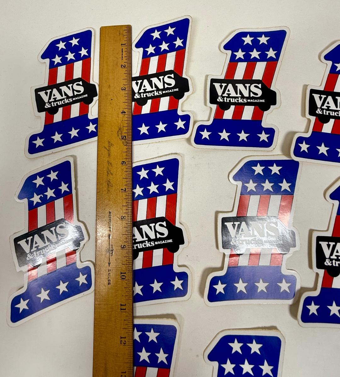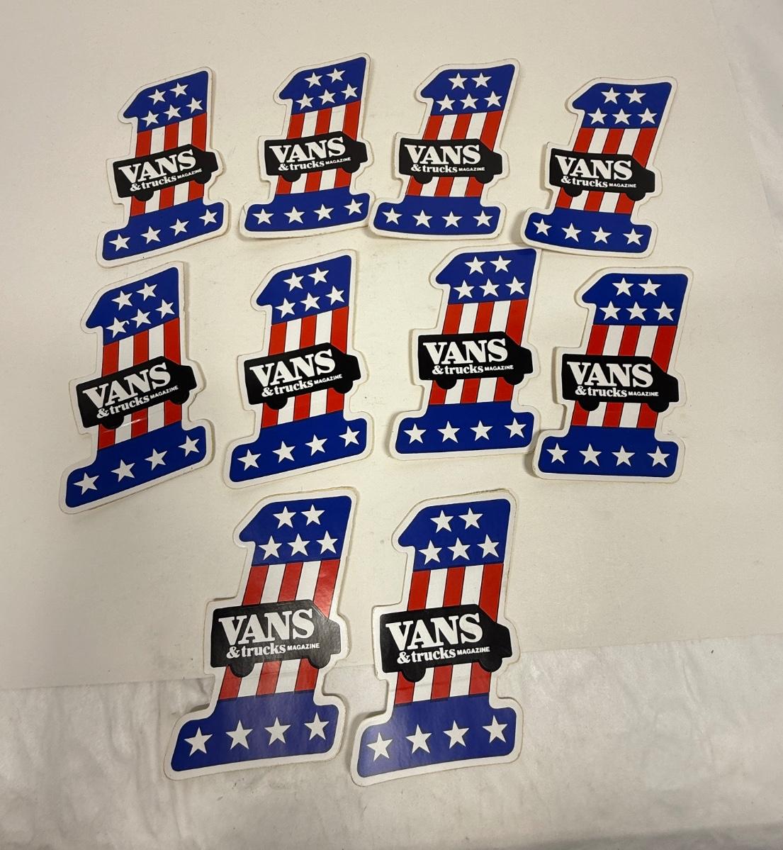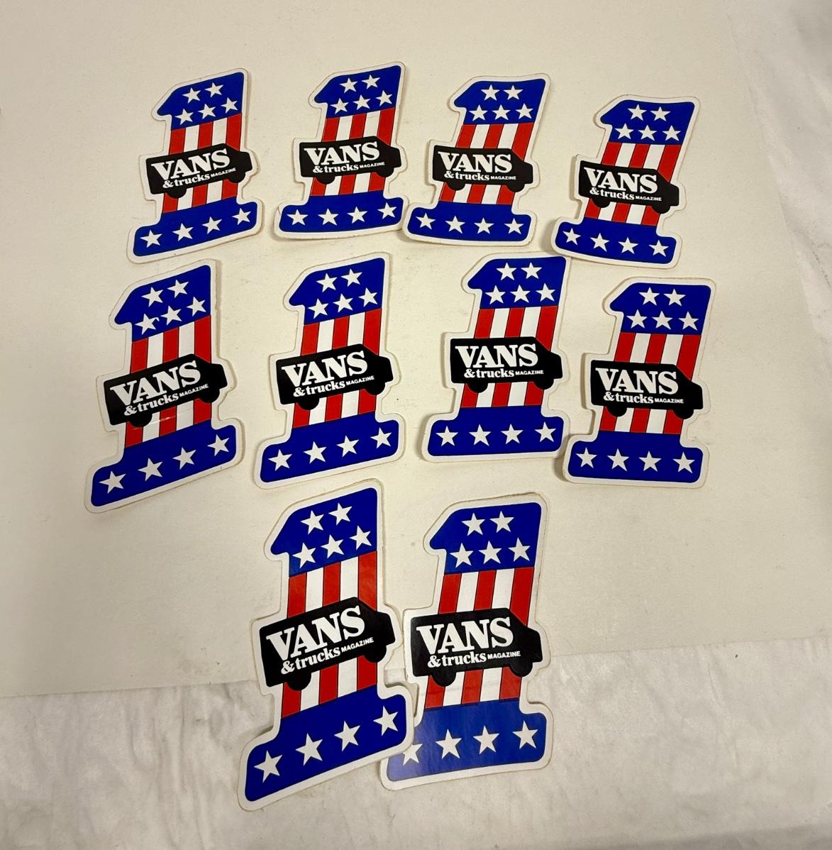 Collection of 10 vintage stickers, a red-white-blue American Flag-inspired numeral "1" with a back silhouette of a van, with the inscription "VANS & TRUCKS Magazine". All in good condition.
