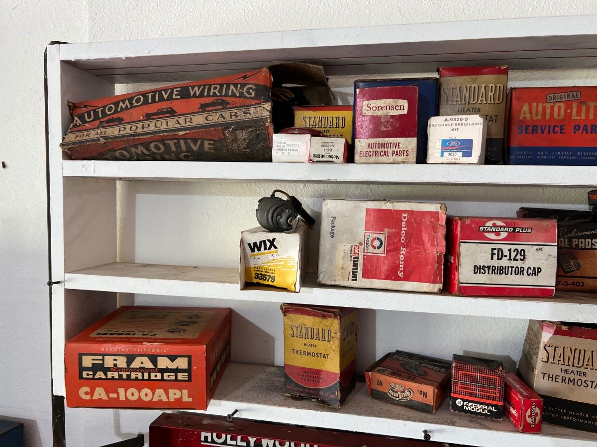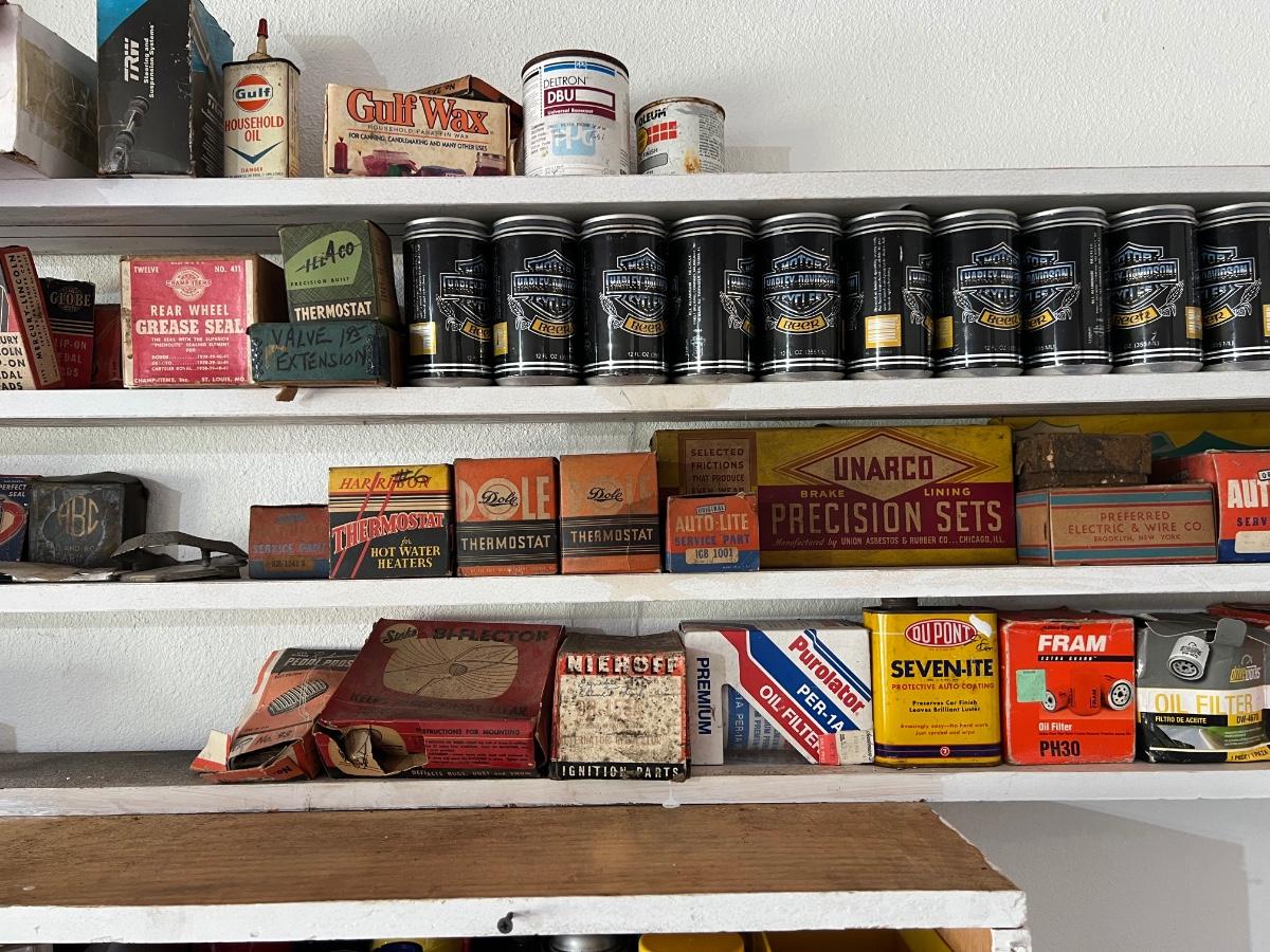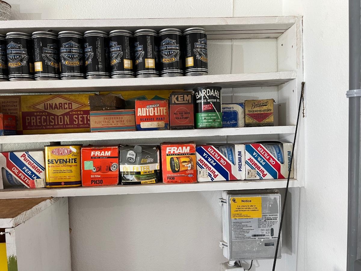 Includes Fram filters, Purolator filters, Harrison thermostats, Dole thermostats, Unarco brake lines, Harley-Davidson collector cans, metal hardware organizer, and more. White cabinet is not included. **WINNING BIDDER MUST TAKE ALL ITEMS IN LOT.**