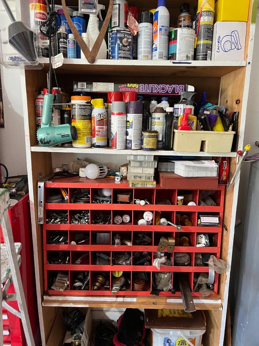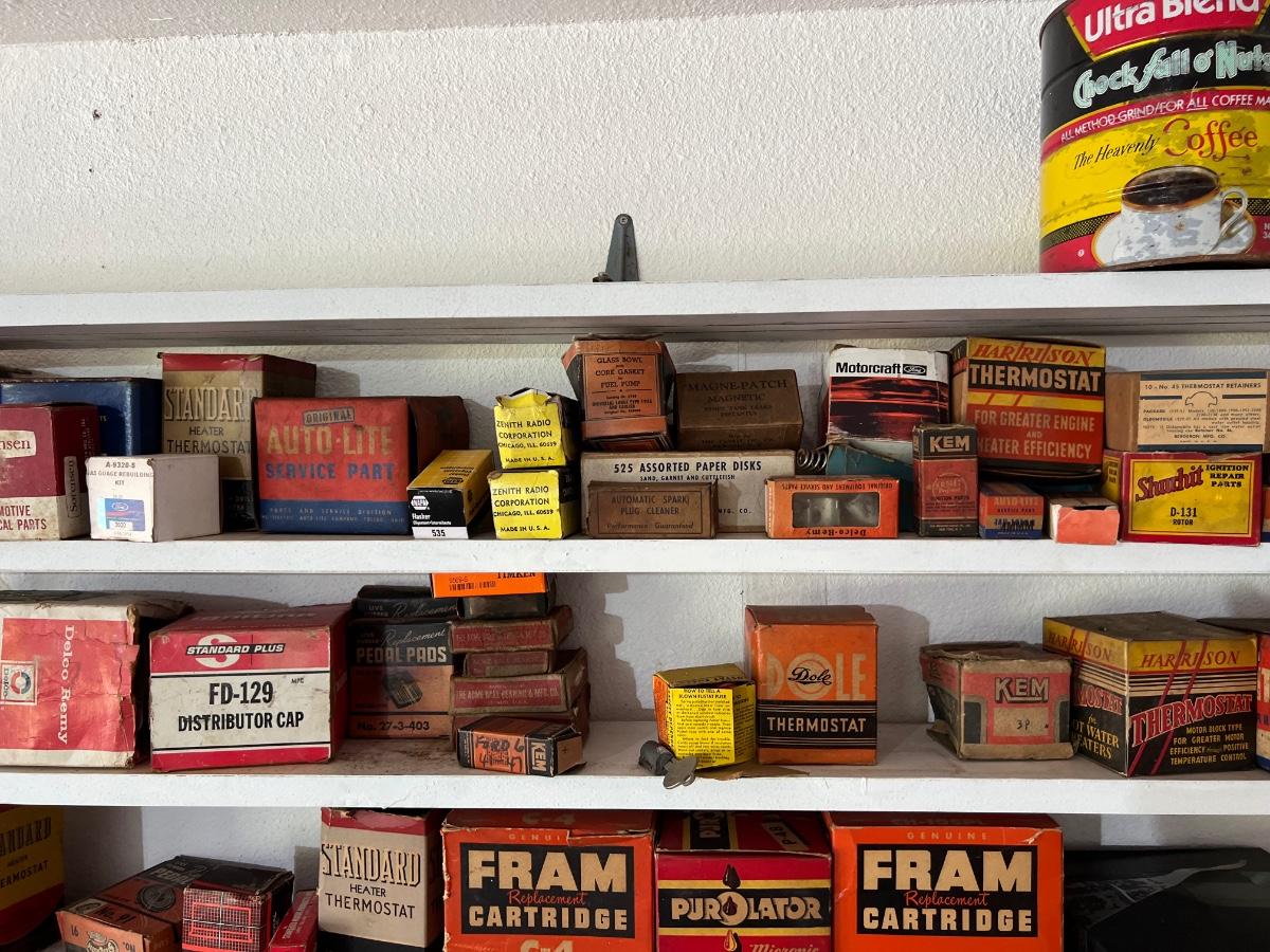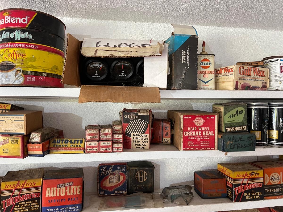 Includes Fram filters, Purolator filters, Harrison thermostats, Dole thermostats, Unarco brake lines, Harley-Davidson collector cans, metal hardware organizer, and more. White cabinet is not included. **WINNING BIDDER MUST TAKE ALL ITEMS IN LOT.**