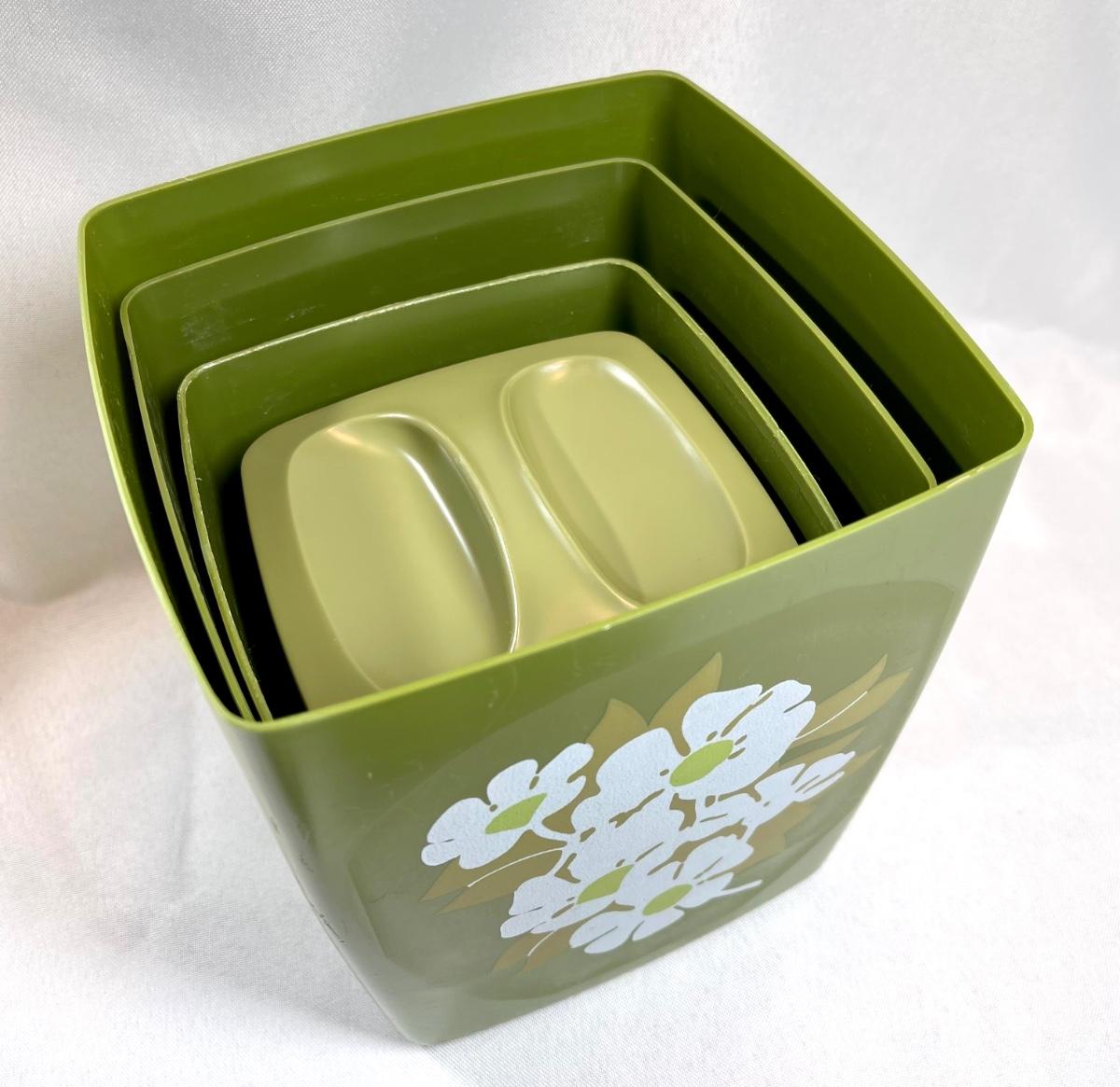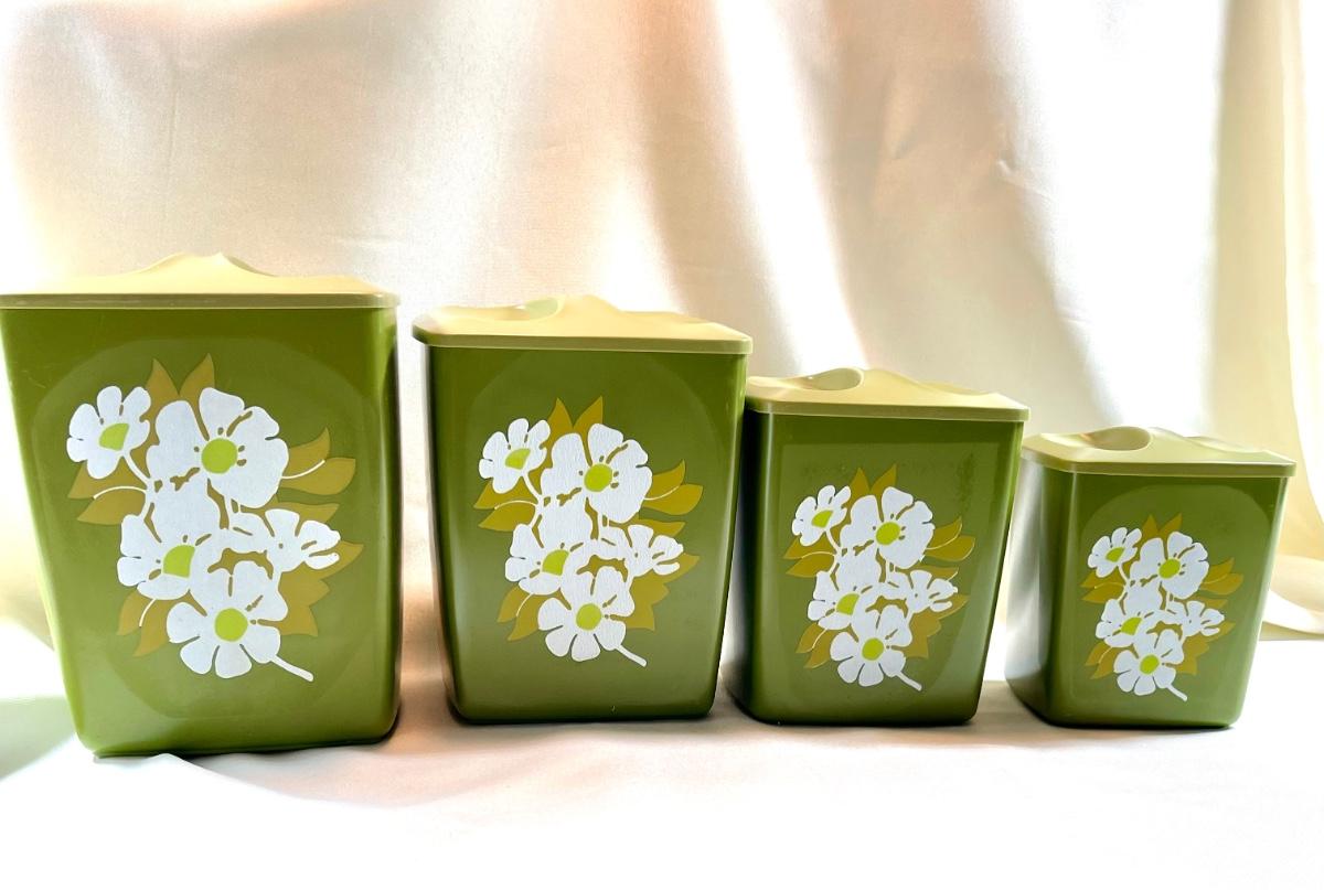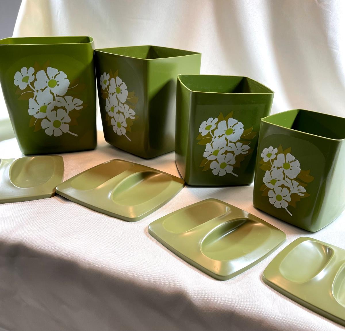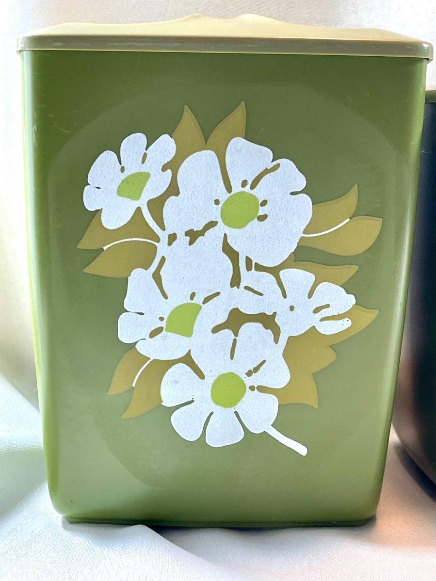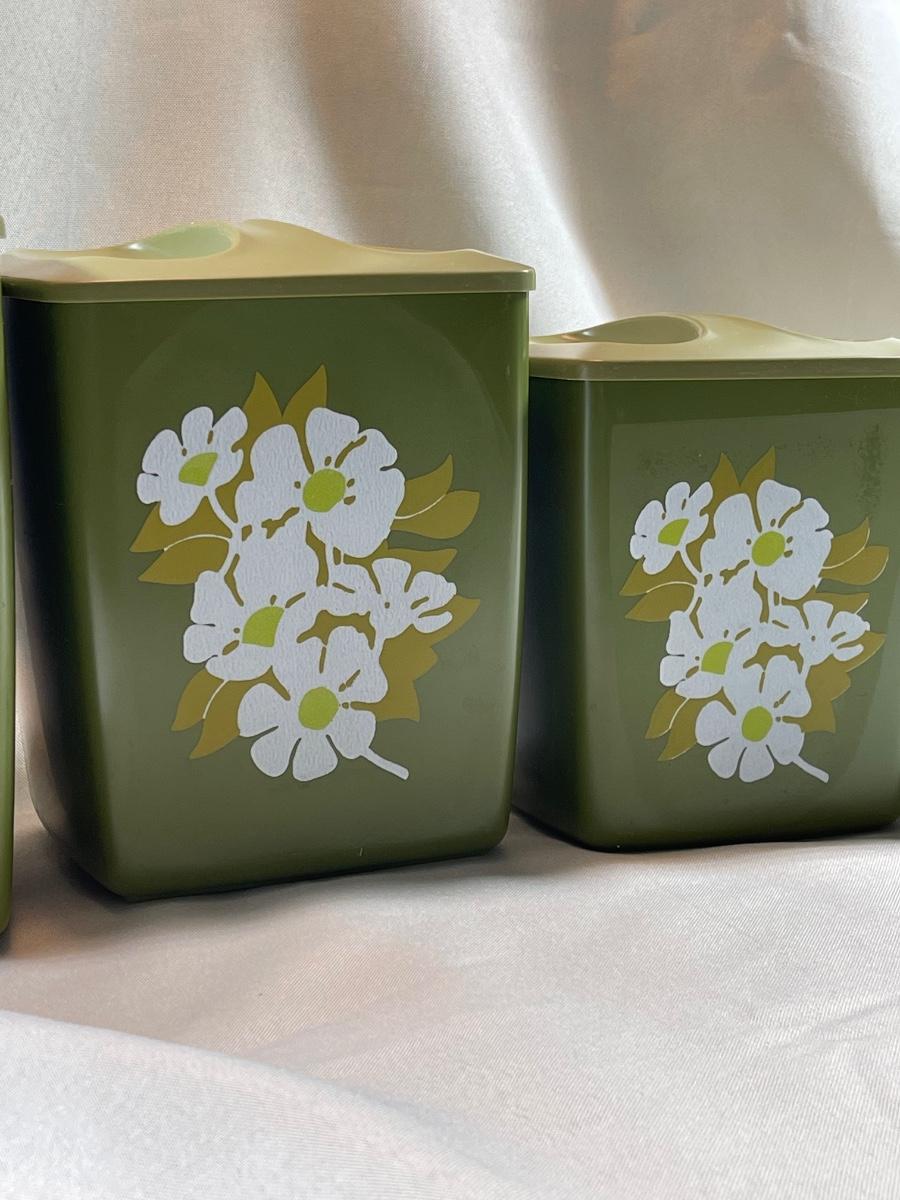 What a cute canister set for the vintage kitchen! These could actually be used anywhere! Use them to hold your sewing odds and ends, crafting materials, as a sorter for kids crayons and small toys, in the bathroom, you could even use them as planters on the patio if you like! Use this sweet functional set anywhere. These have never been used, but there are some scuffs on some of the containers. The fronts with the flowers look great. See pics.