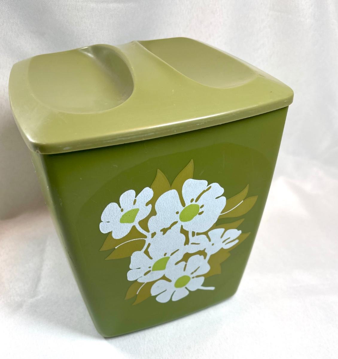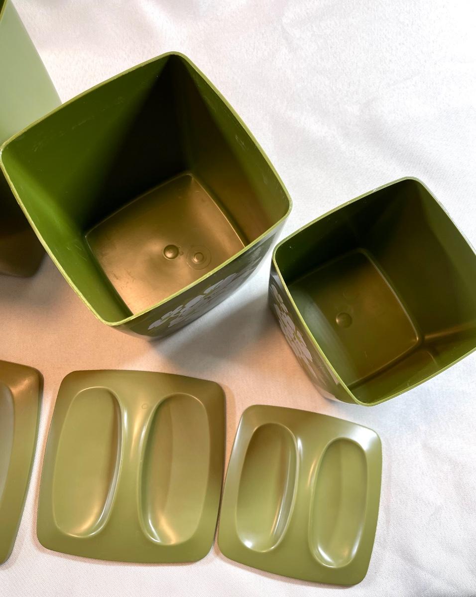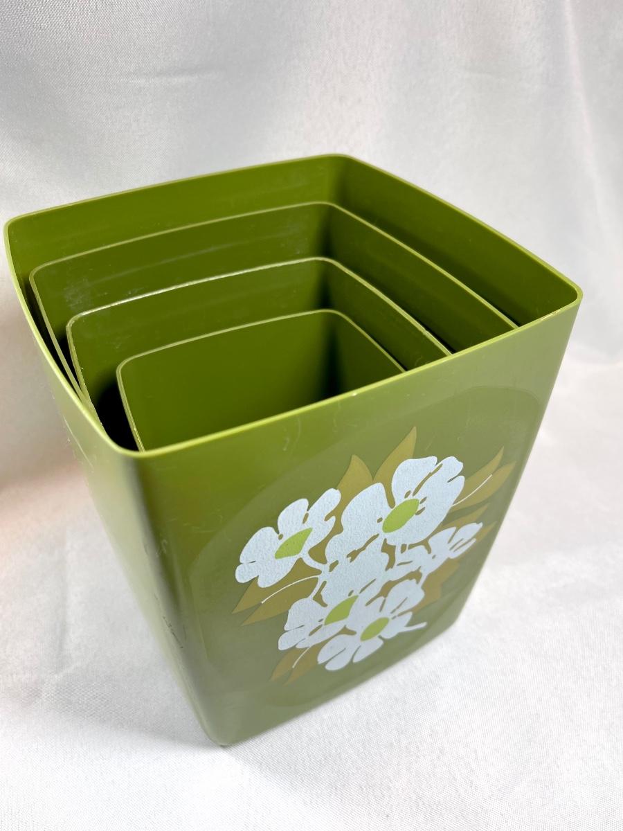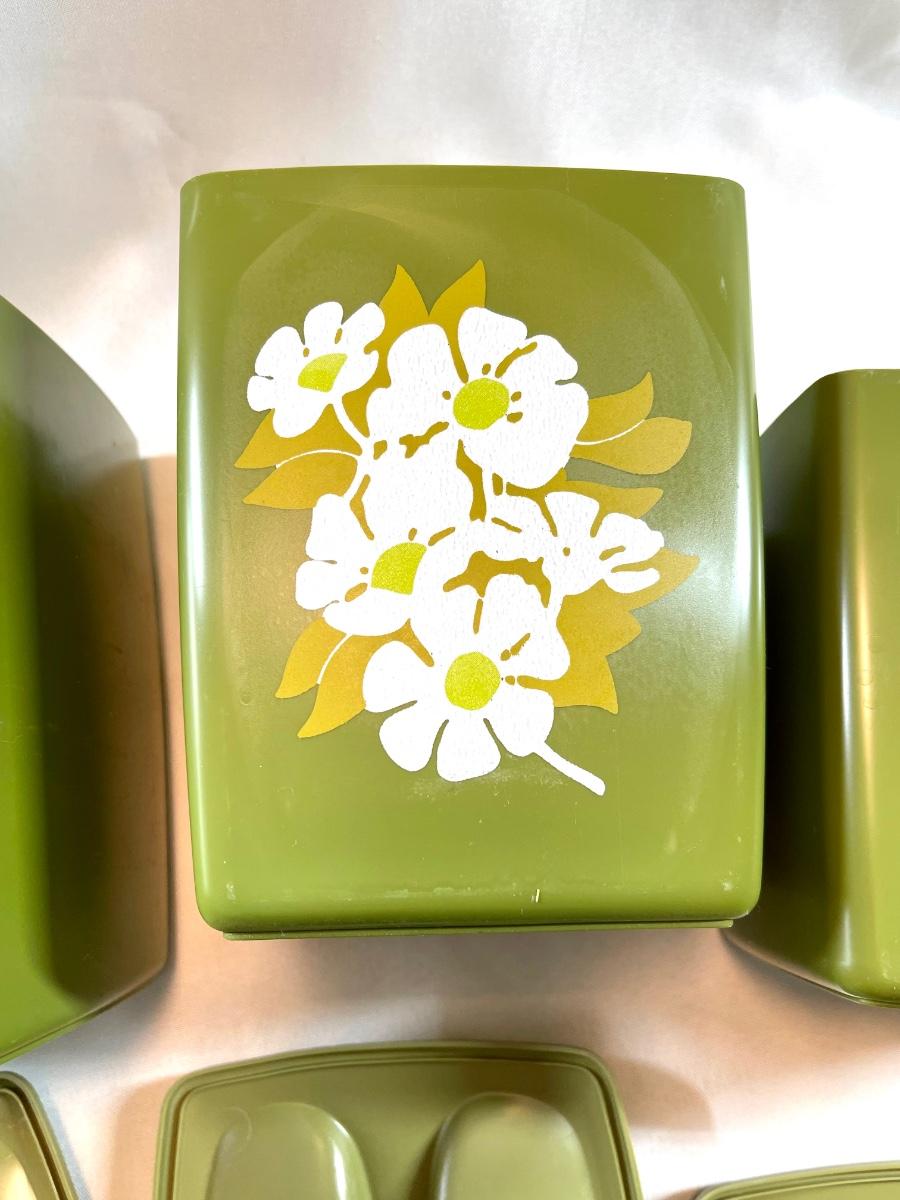 What a cute canister set for the vintage kitchen! These could actually be used anywhere! Use them to hold your sewing odds and ends, crafting materials, as a sorter for kids crayons and small toys, in the bathroom, you could even use them as planters on the patio if you like! Use this sweet functional set anywhere. These have never been used, but there are some scuffs on some of the containers. The fronts with the flowers look great. See pics.