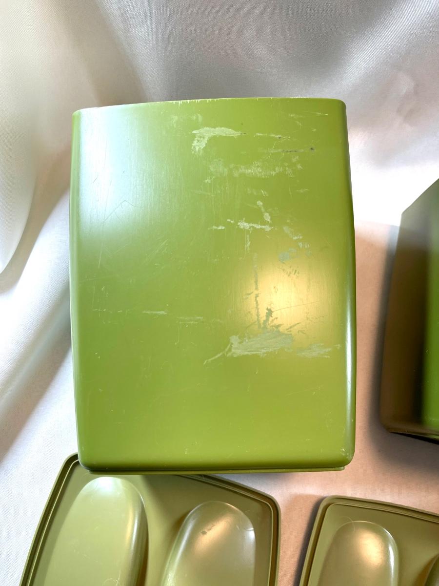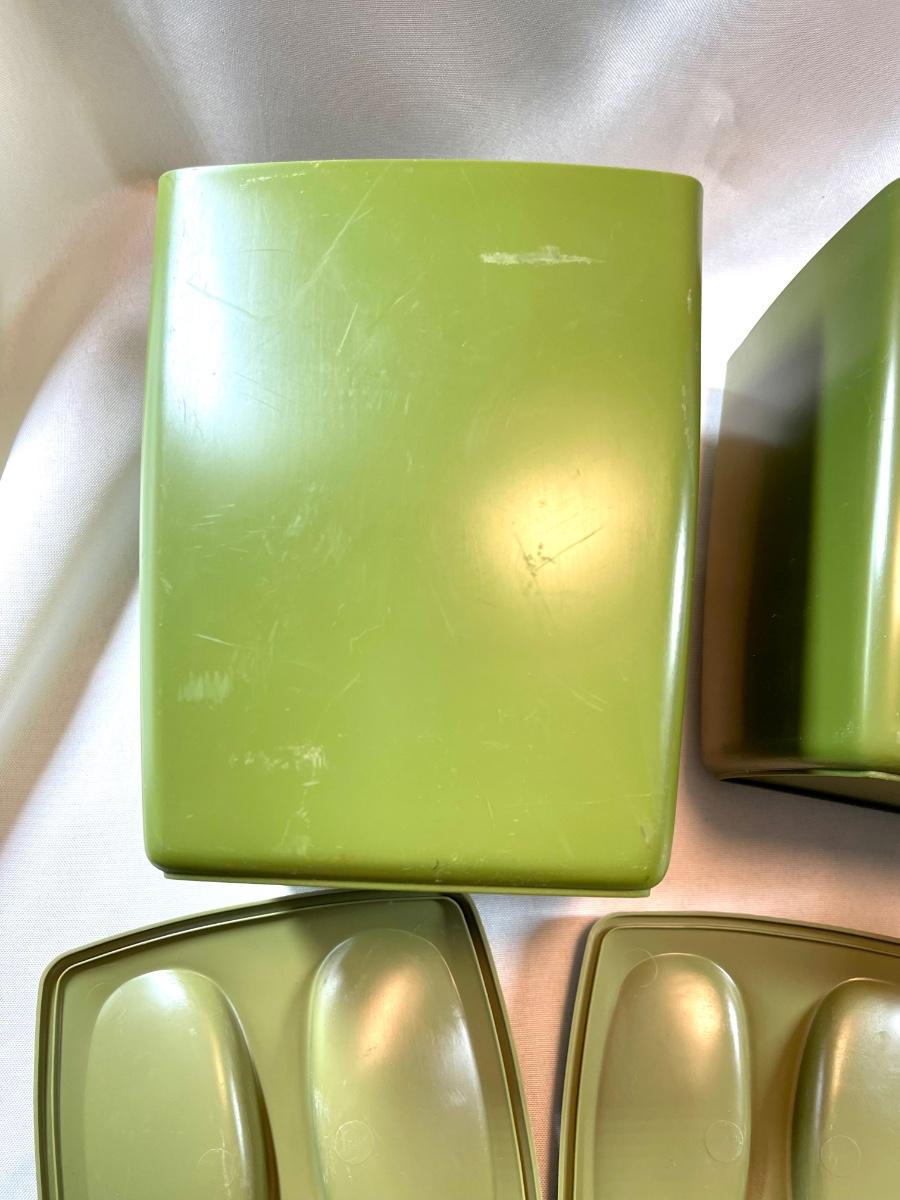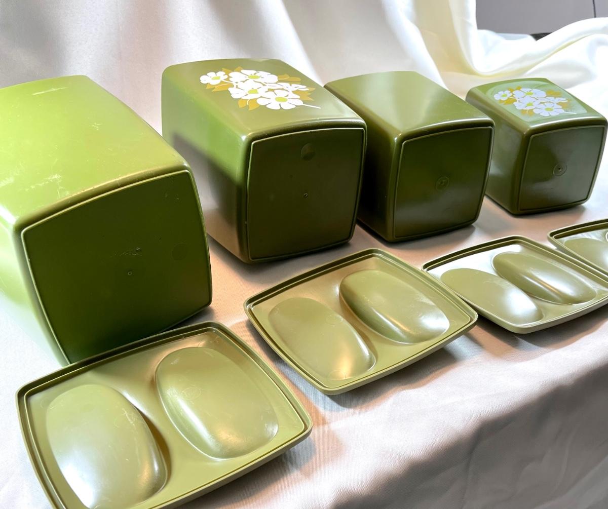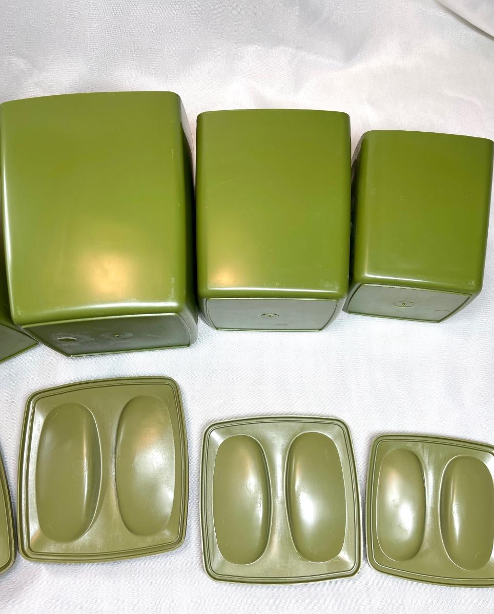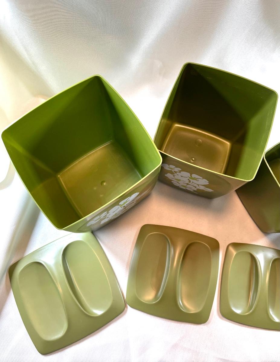 What a cute canister set for the vintage kitchen! These could actually be used anywhere! Use them to hold your sewing odds and ends, crafting materials, as a sorter for kids crayons and small toys, in the bathroom, you could even use them as planters on the patio if you like! Use this sweet functional set anywhere. These have never been used, but there are some scuffs on some of the containers. The fronts with the flowers look great. See pics.