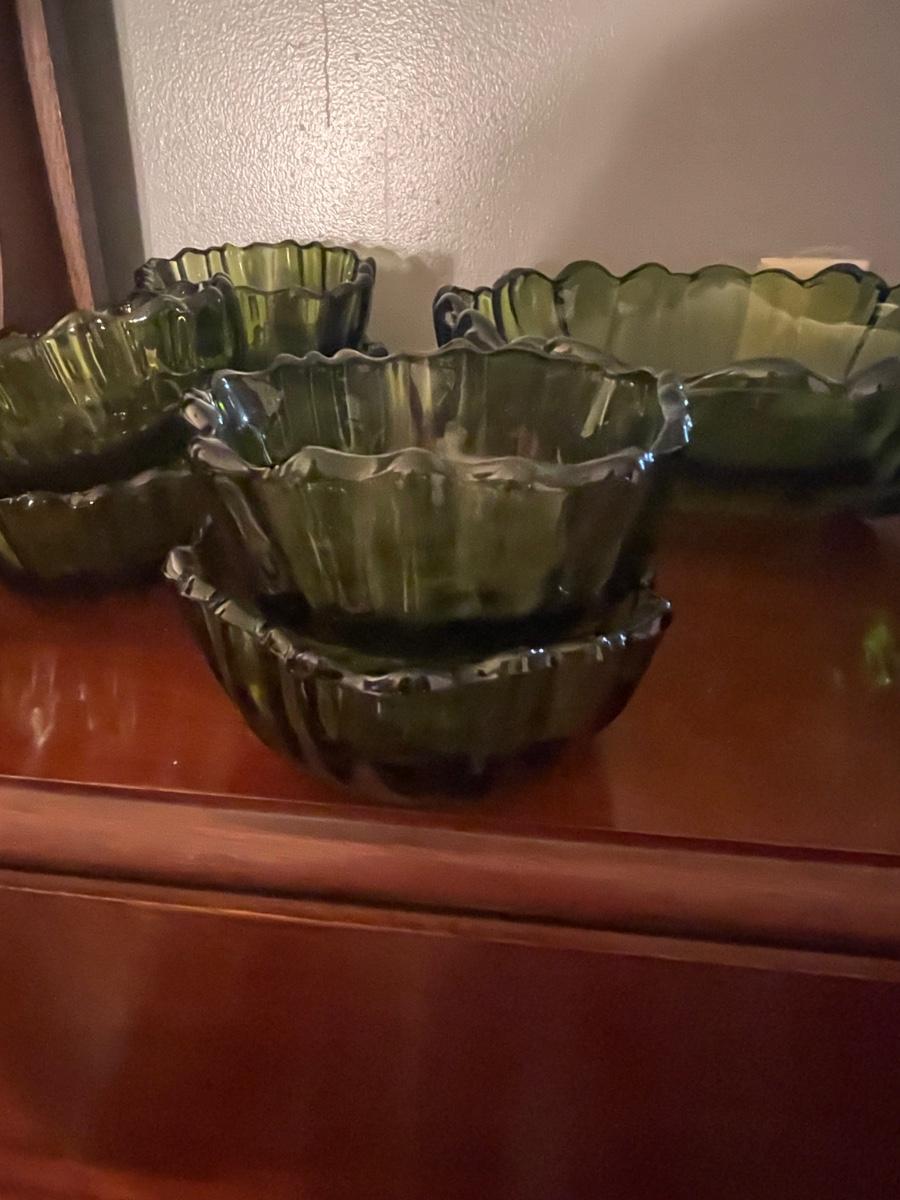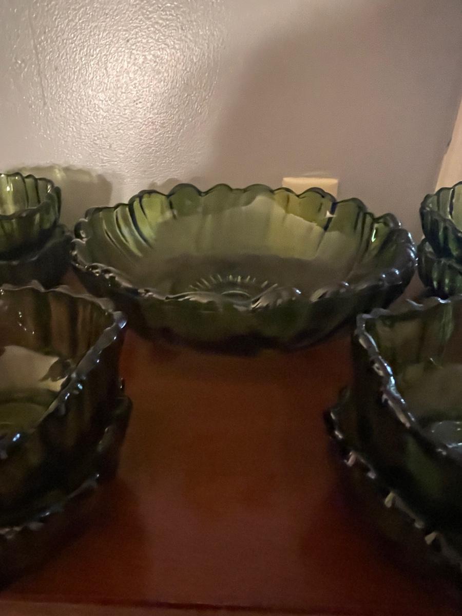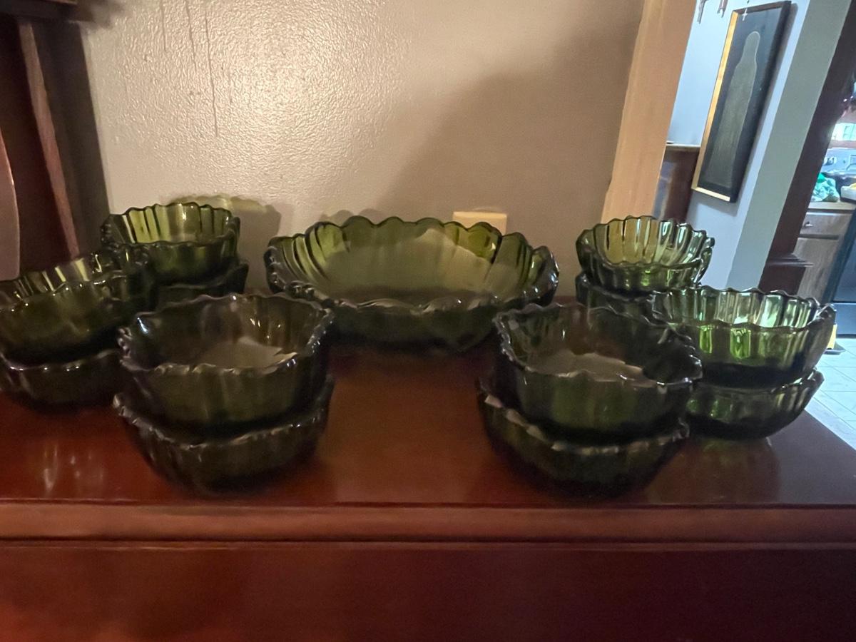 Vintage Avocado Large Berry Dish and 12 serving dishes Might be Indiana Glass not ’¯ sure