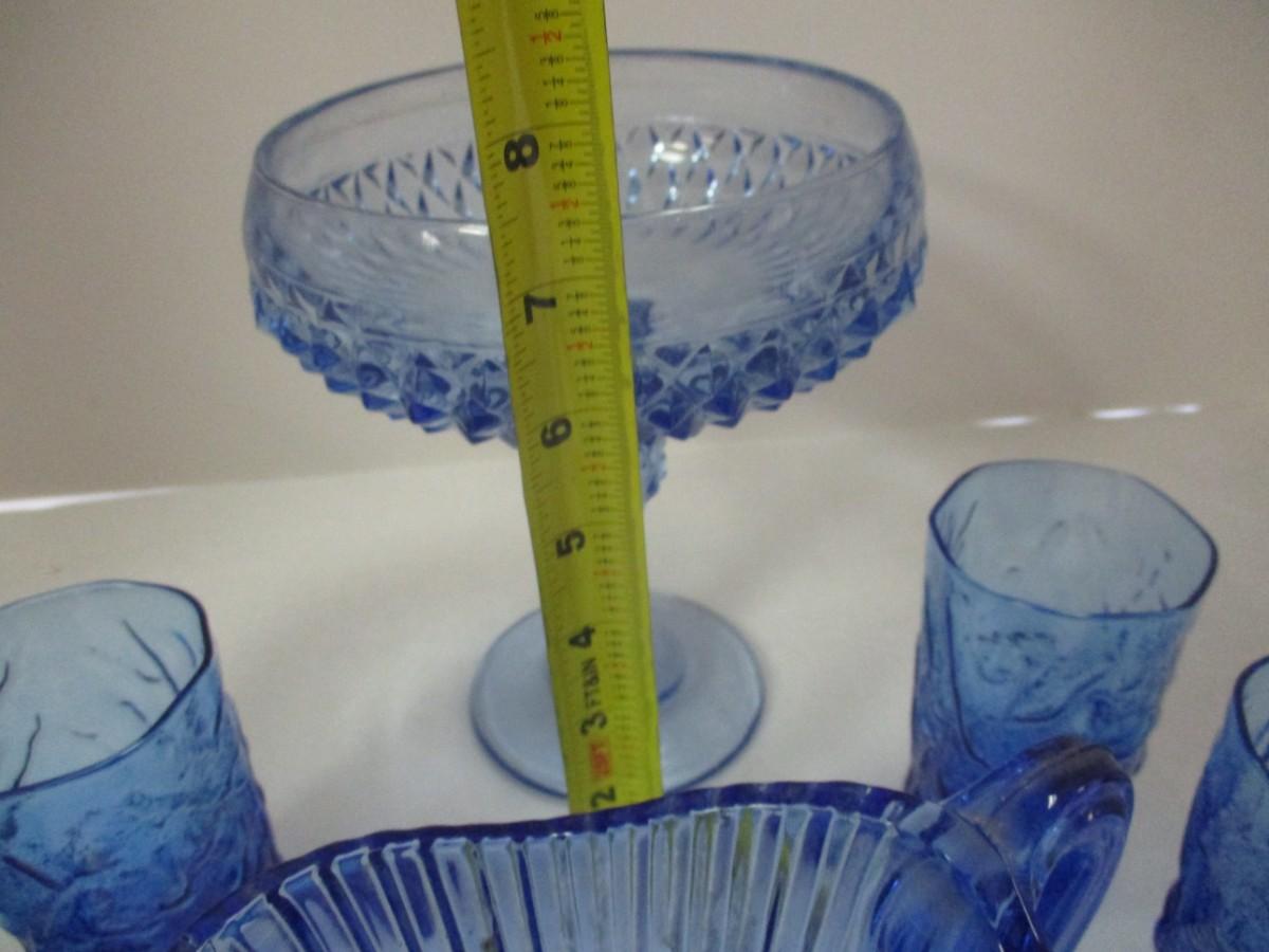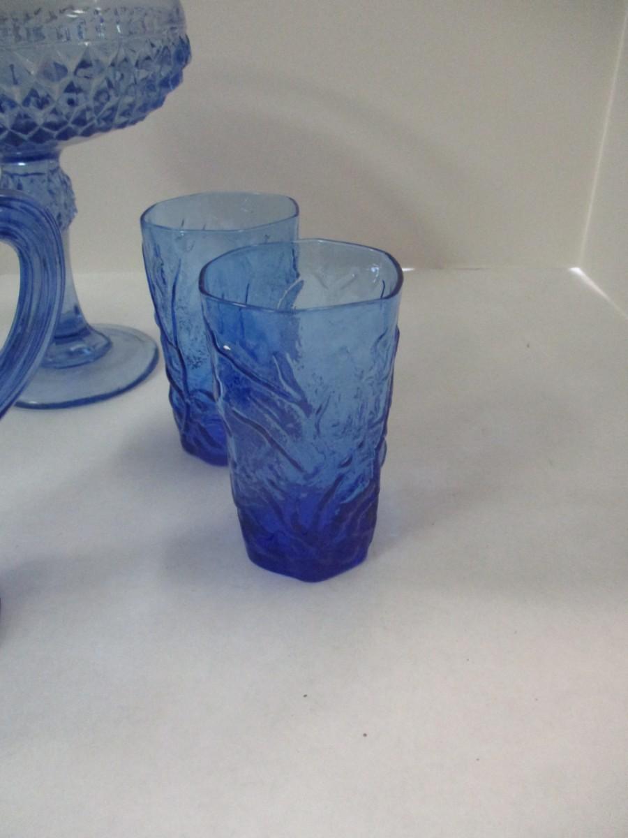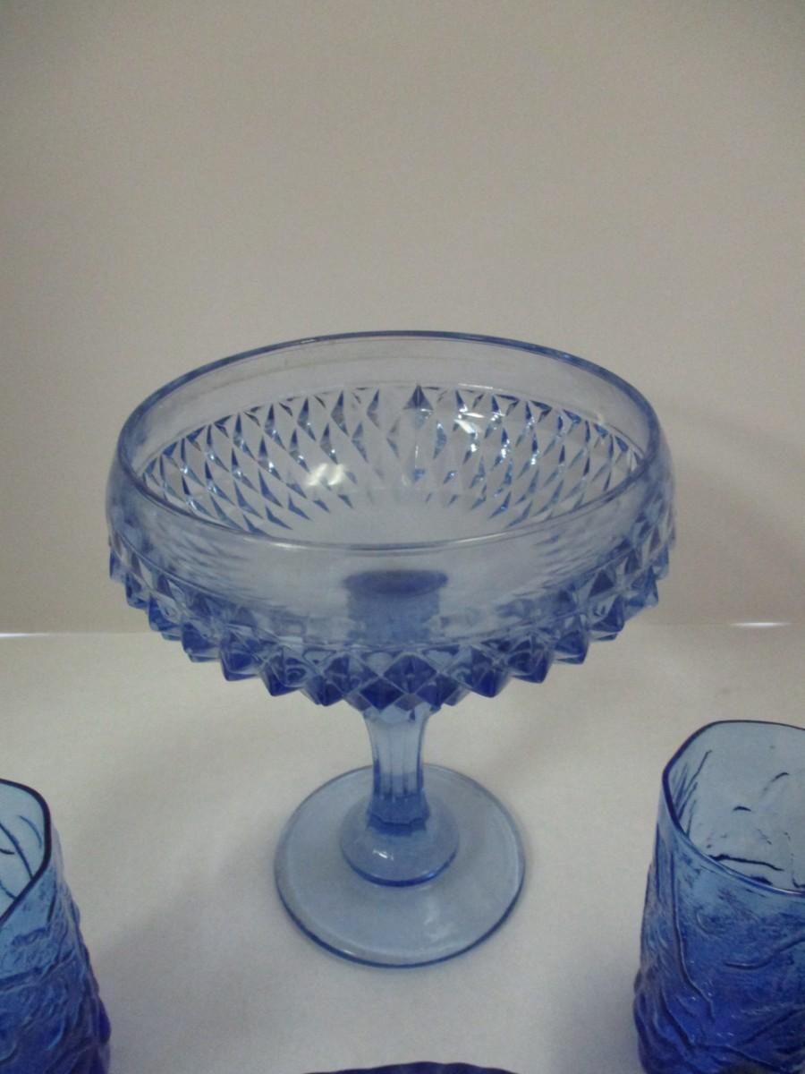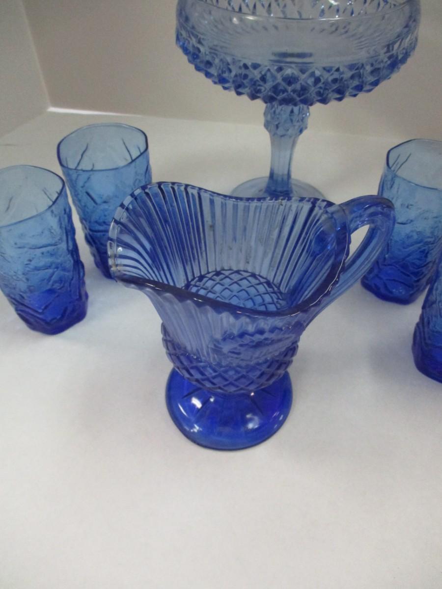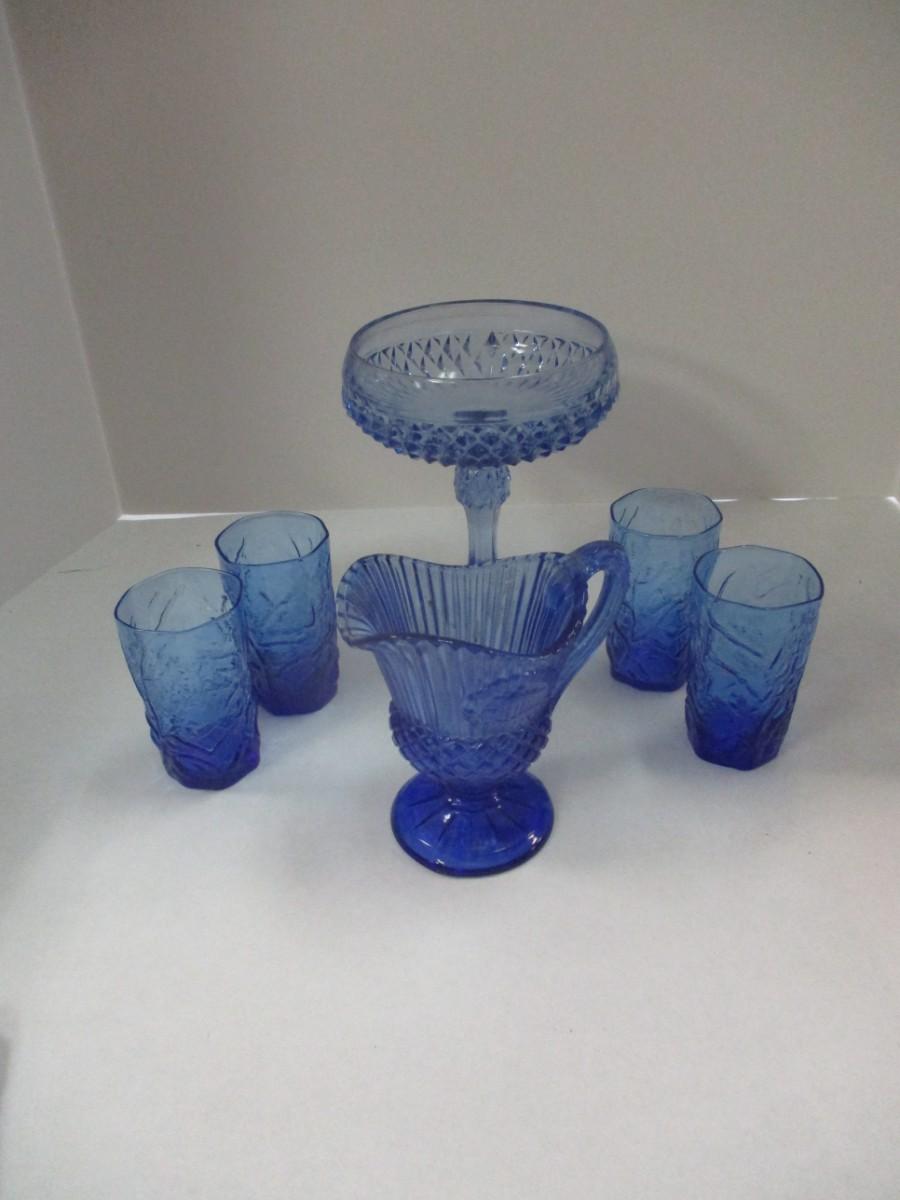 Vintage Avon Fostoria George/Martha Washington Cobalt Blue Pitcher - Diamond Point Regal Compote & Pedestal Bowl Indiana - The Seneca - Driftwood Delphine Blue Crinkle Tumblers Set Of 4
