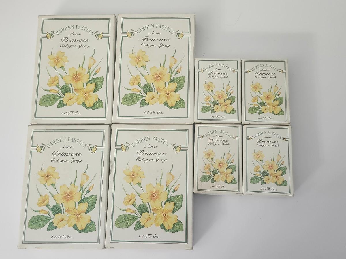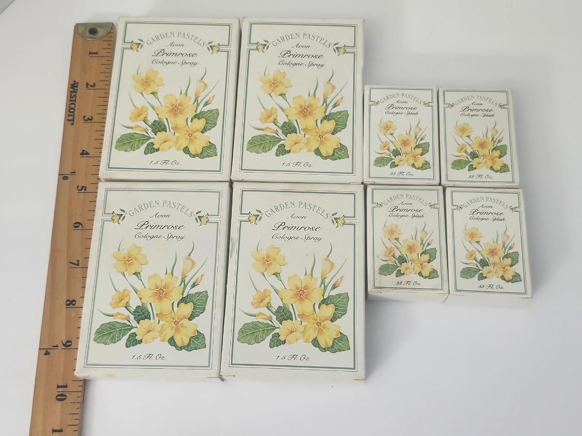 Eight piece vintage Avon Garden Pastels Primrose cologne lot all NEW and FULL. Includes five Primrose Cologne Sprays 1.5 fl oz and three Primrose Cologne Splash .33 fl oz. Boxes show age related wear as pictured while contents remain unused. Beautiful floral presentation for collectors and vintage fragrance lovers.