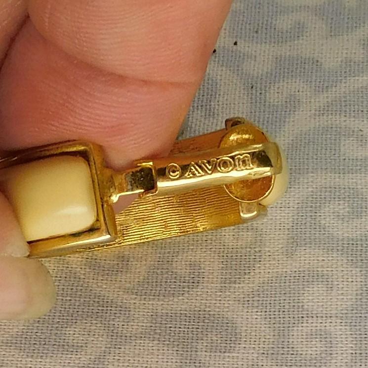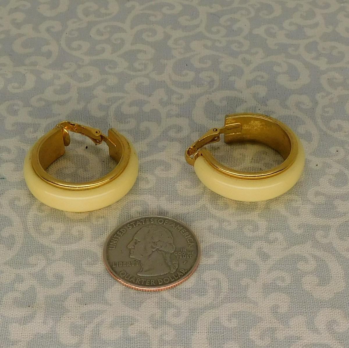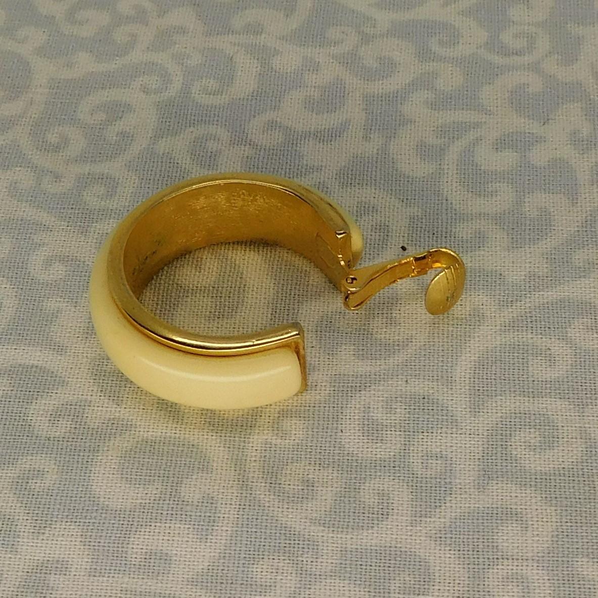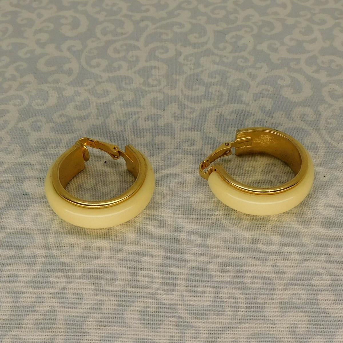 This is a vintage set of clip on earrings. These are ivory with gold edge hoop earrings by Avon. They are about 1 1/4" x 3/8" each.