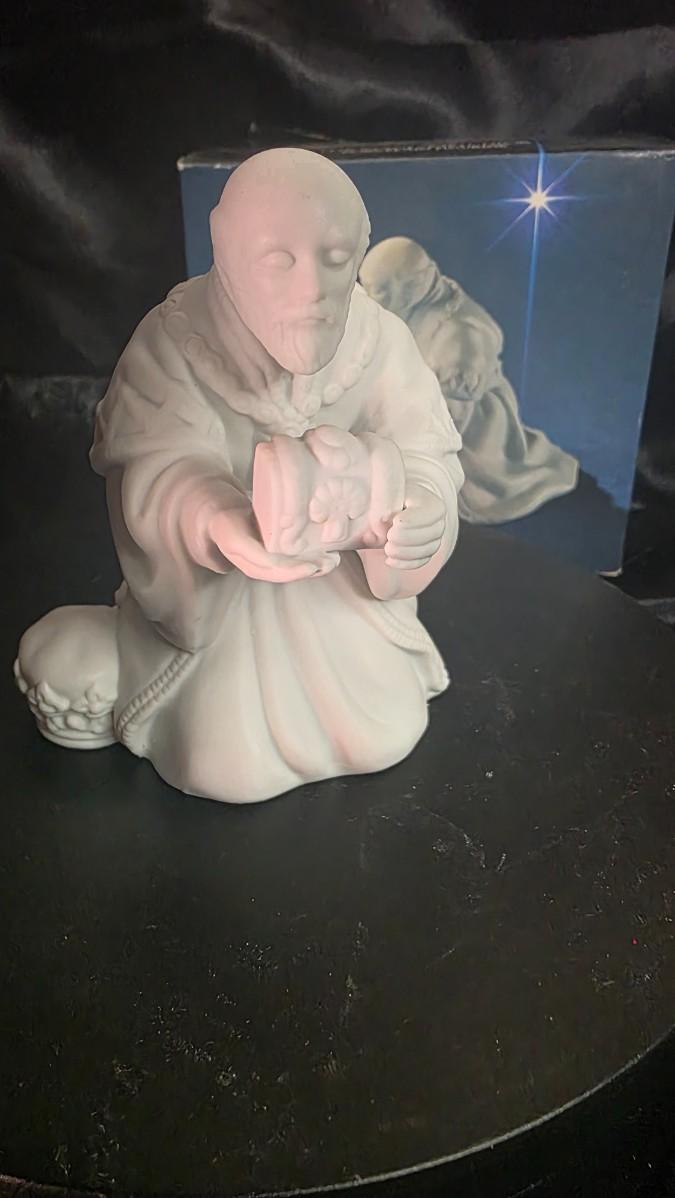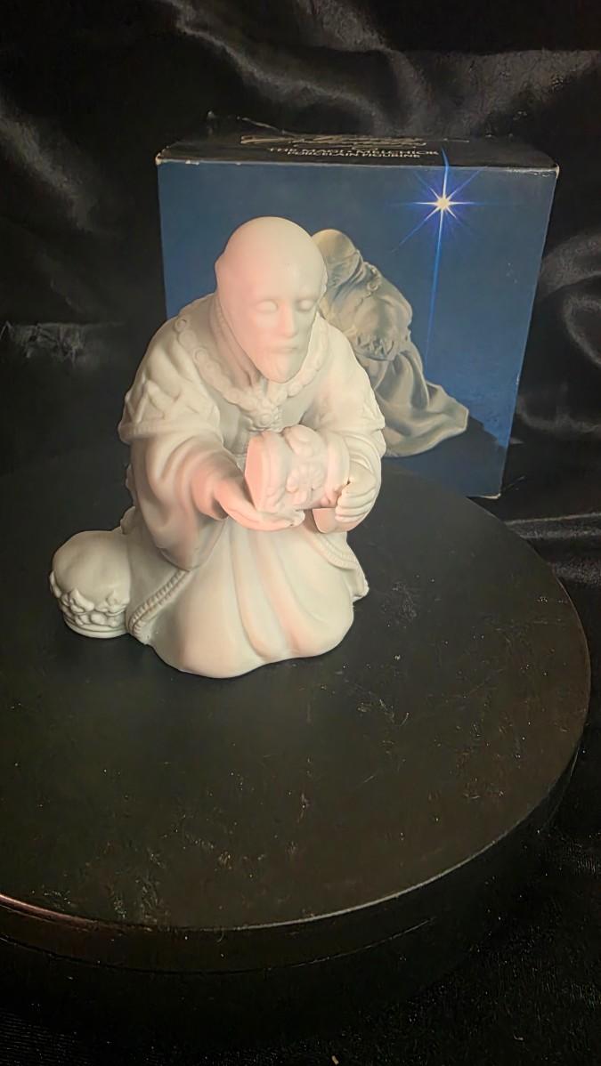 Among the Three Kings, Melchior is traditionally the bearer of gold—a tribute to royalty and worth. This vintage AVON Nativity sculpture renders that moment with quiet gravity: a king kneels, both hands extended, presenting his casket with reverence. The matte white porcelain reads like hand-carved alabaster; light drifts across the robe’s deep folds, settles along the edges of his sleeves, and softens the calm lines of his face.