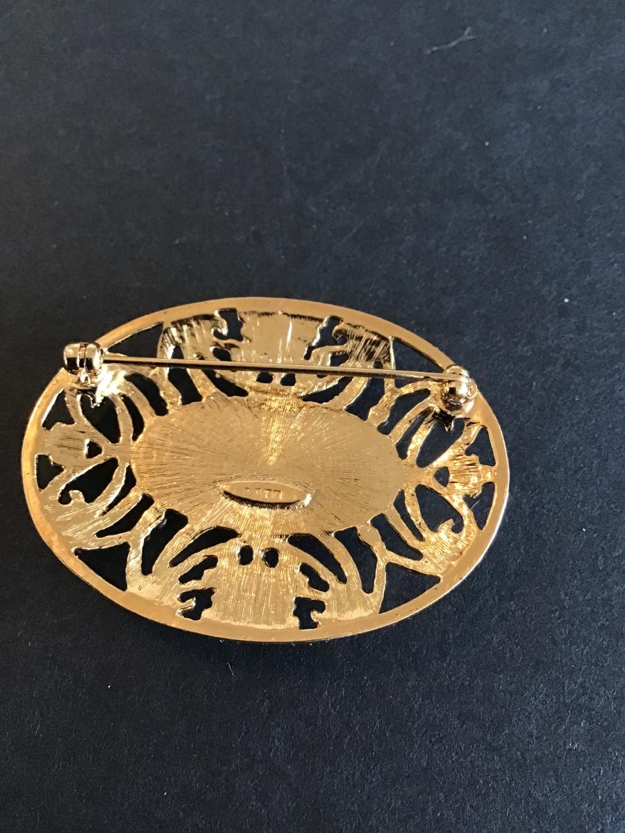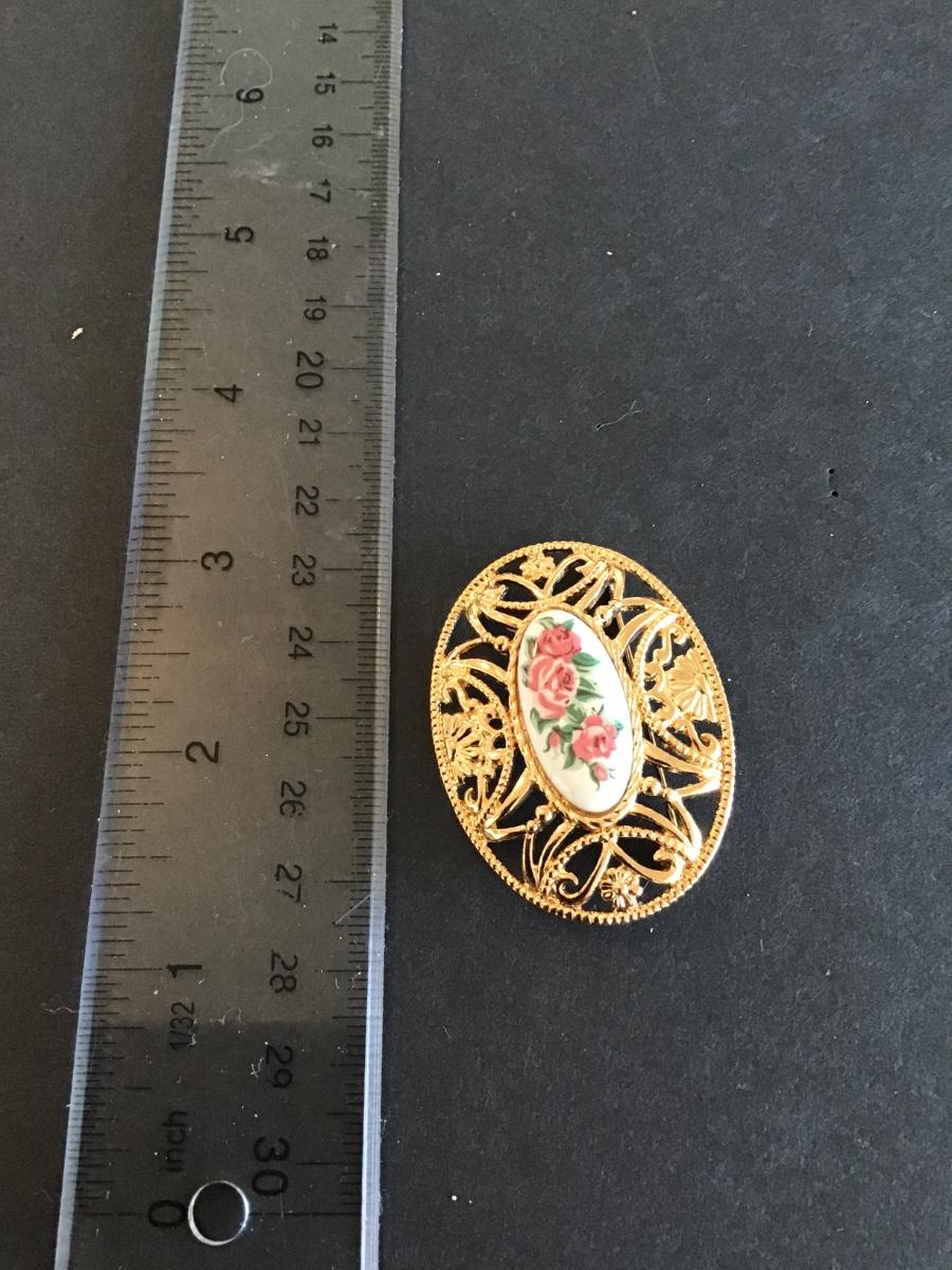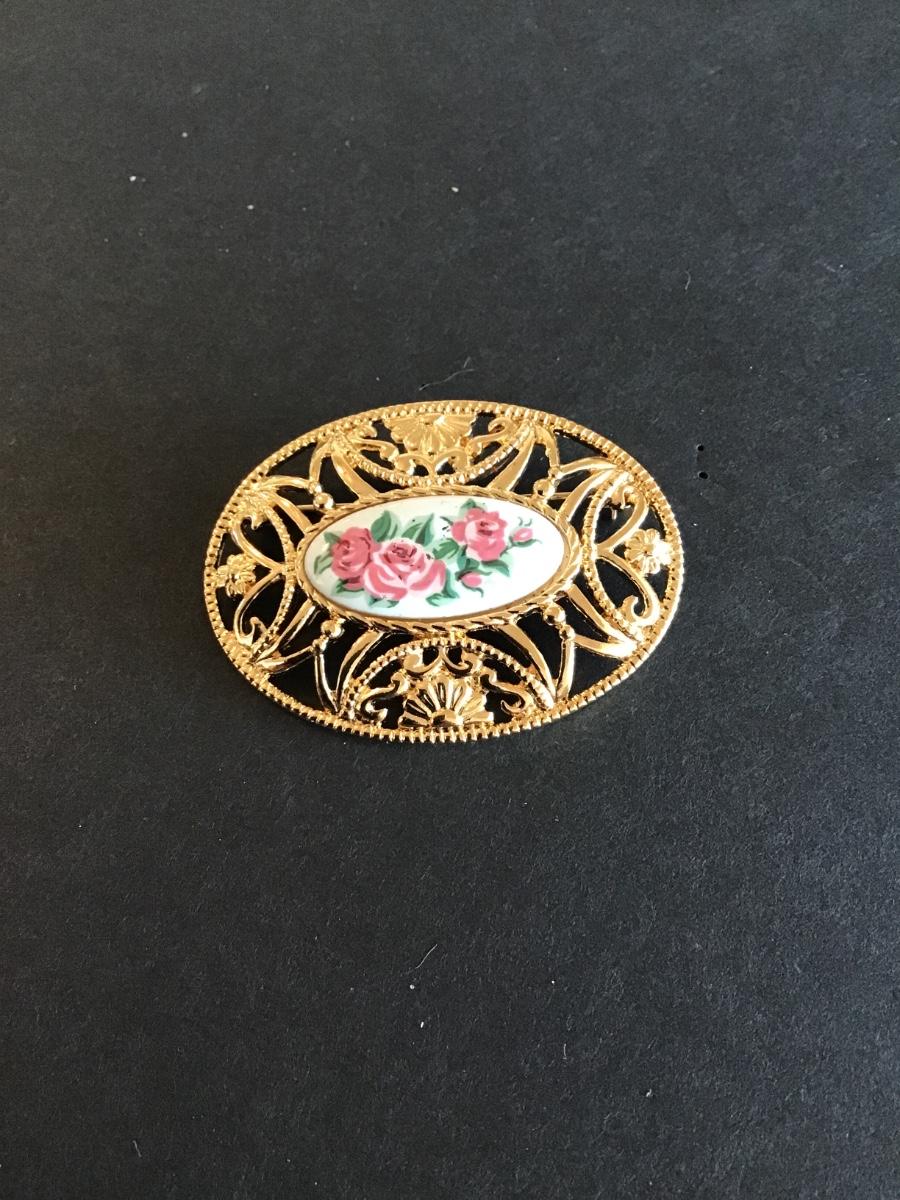 Vintage Avon pastel oval brooch with gold tone filigree and a white porcelain insert featuring pink roses Please see attached photos