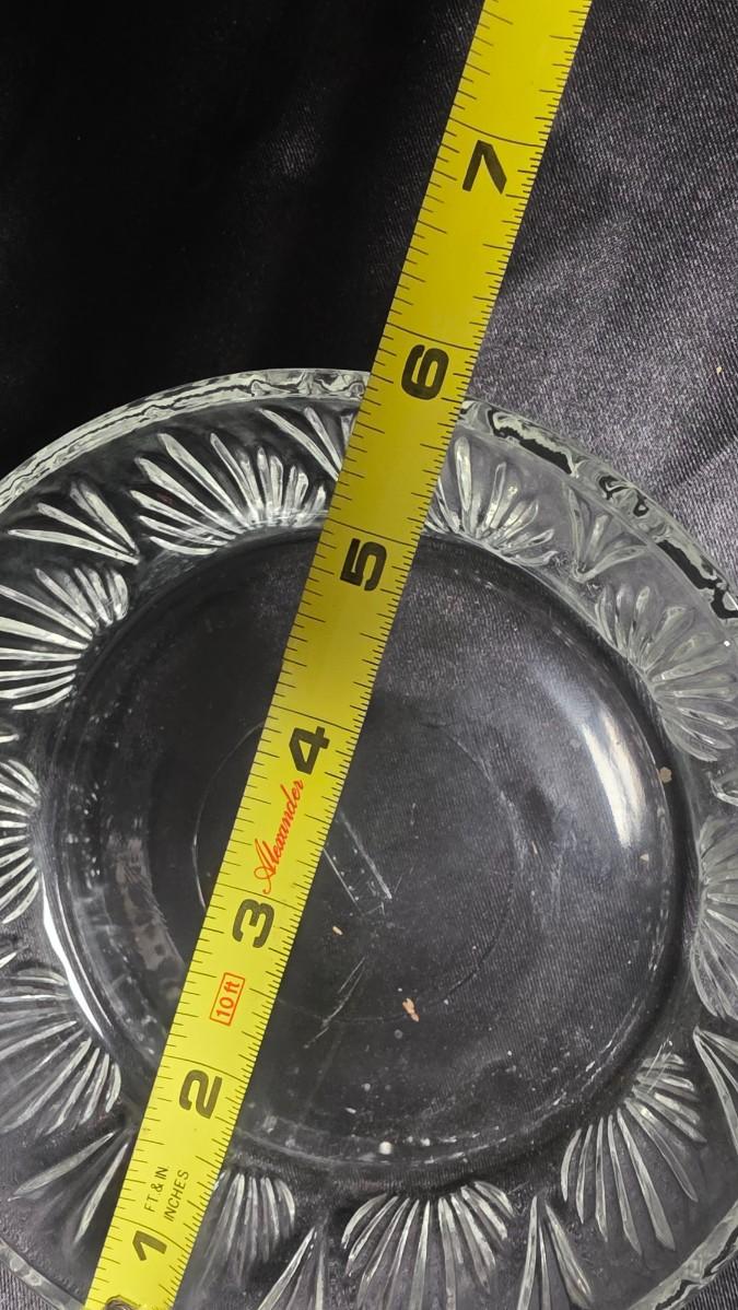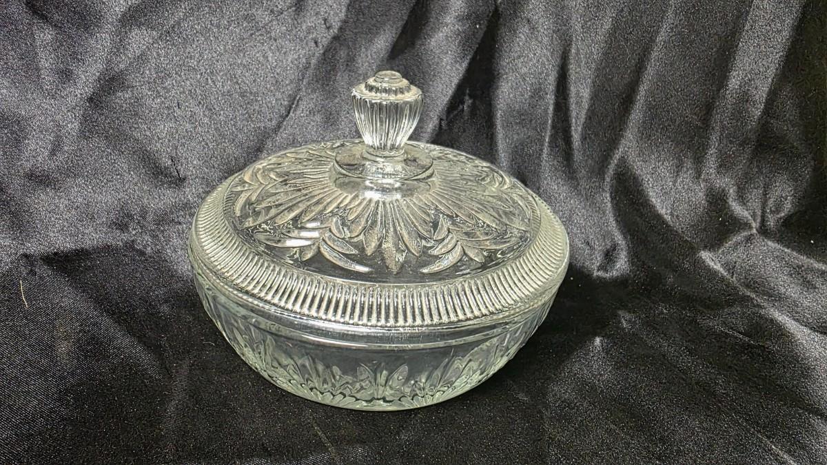 Graceful and timeless, this vintage pressed glass covered dish was produced for Avon and reflects the enduring elegance of classic American glass design. The crystal-clear form showcases finely detailed ribbed panels around the bowl, while the matching lid is crowned with a sculpted finial and layered botanical pattern that beautifully captures and reflects light from every angle.
