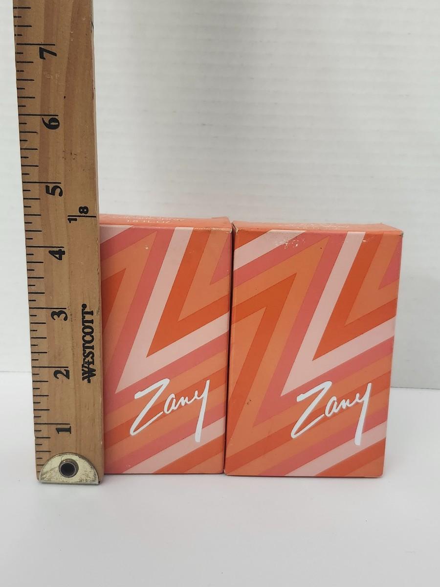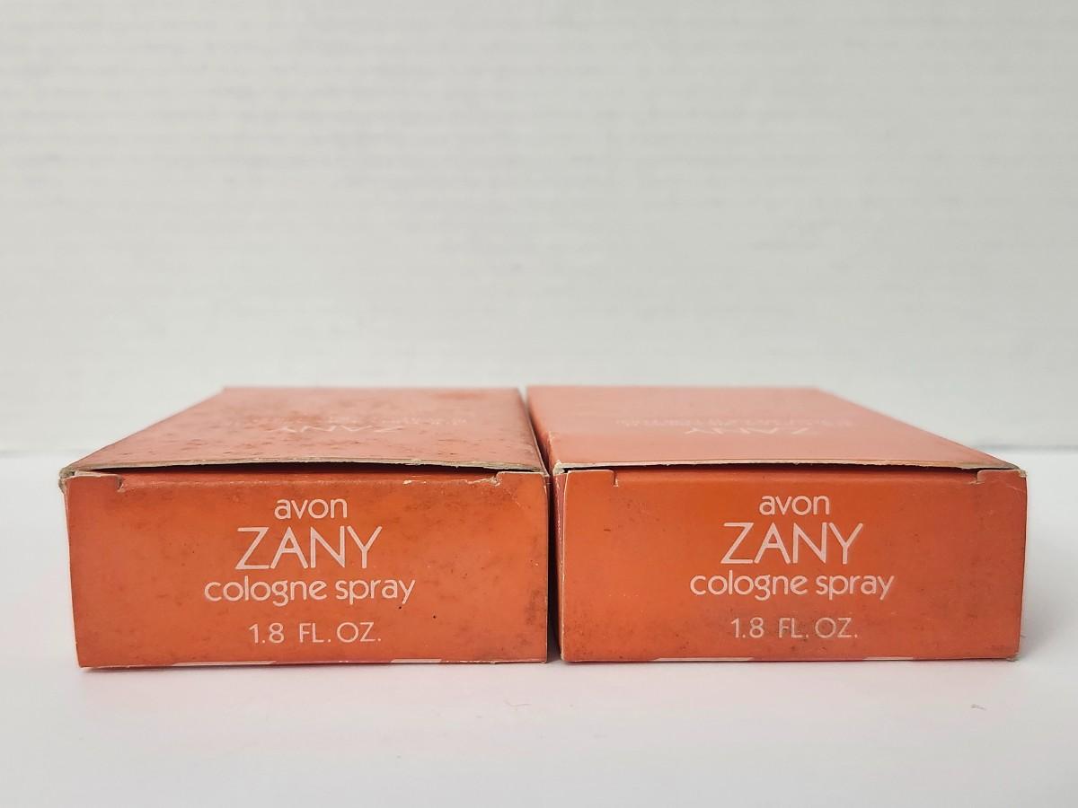 Two vintage Avon ZANY natural spray perfumes in original retro zig-zag boxes with bright orange pink geometric design. Fun nostalgic Avon fragrance set with playful packaging. Both boxes are present with visible age related wear shown in photos. Great addition for collectors, display or vintage vanity decor with bold 1970s to early 1980s aesthetic.