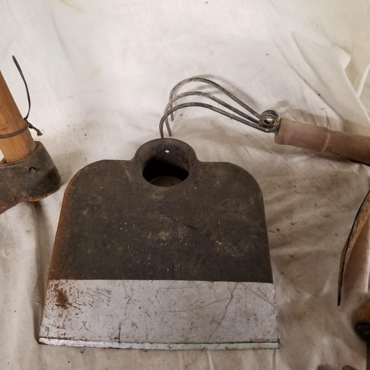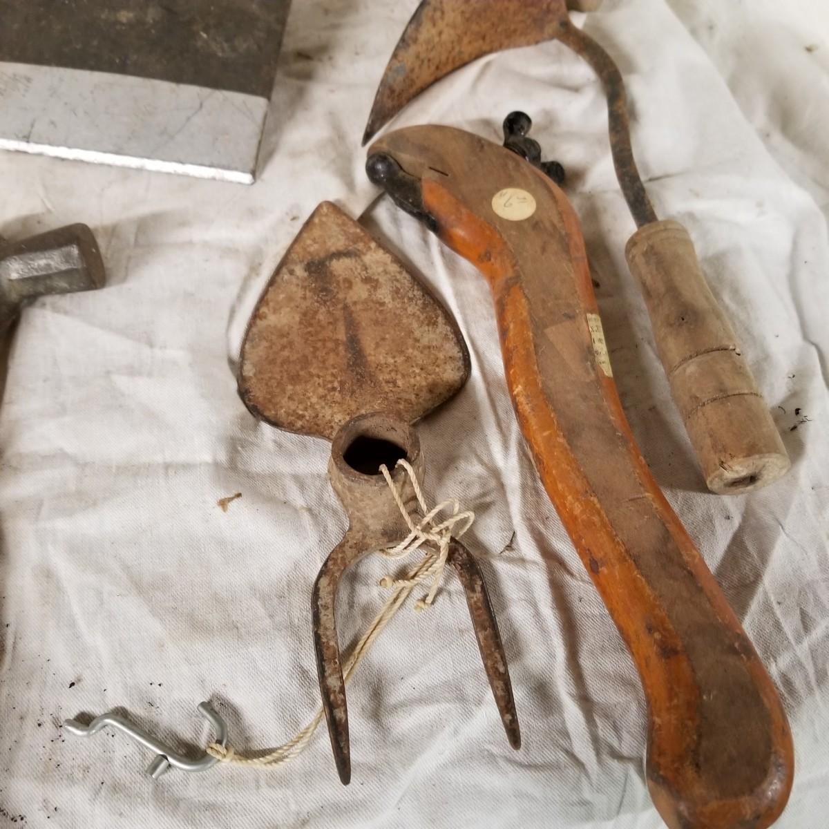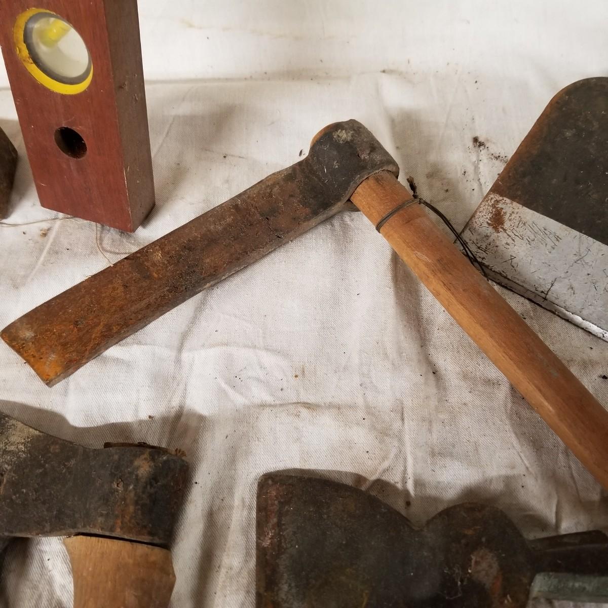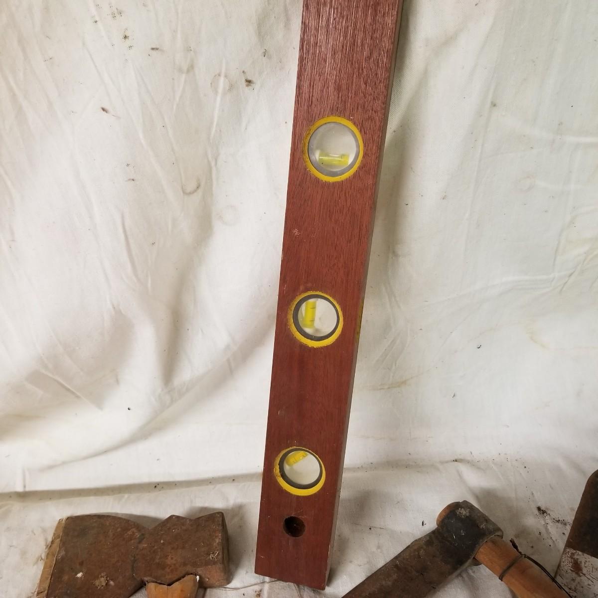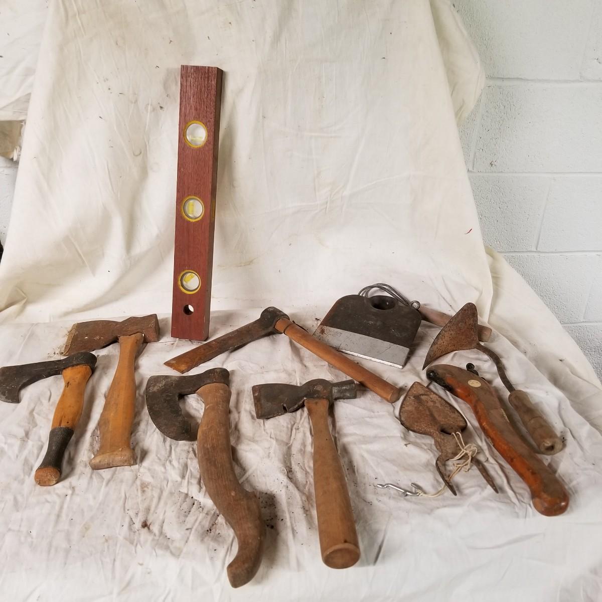 Some vintage hand tools and axes.  Two hatchets, two hand adze, and one 7" froe.  Also miscellaneous garden tool heads, two hoes and a weeding hook.  One hand adze appears to be hand forged.   17" toolbox level, all bubbles intact. Local pickup only.