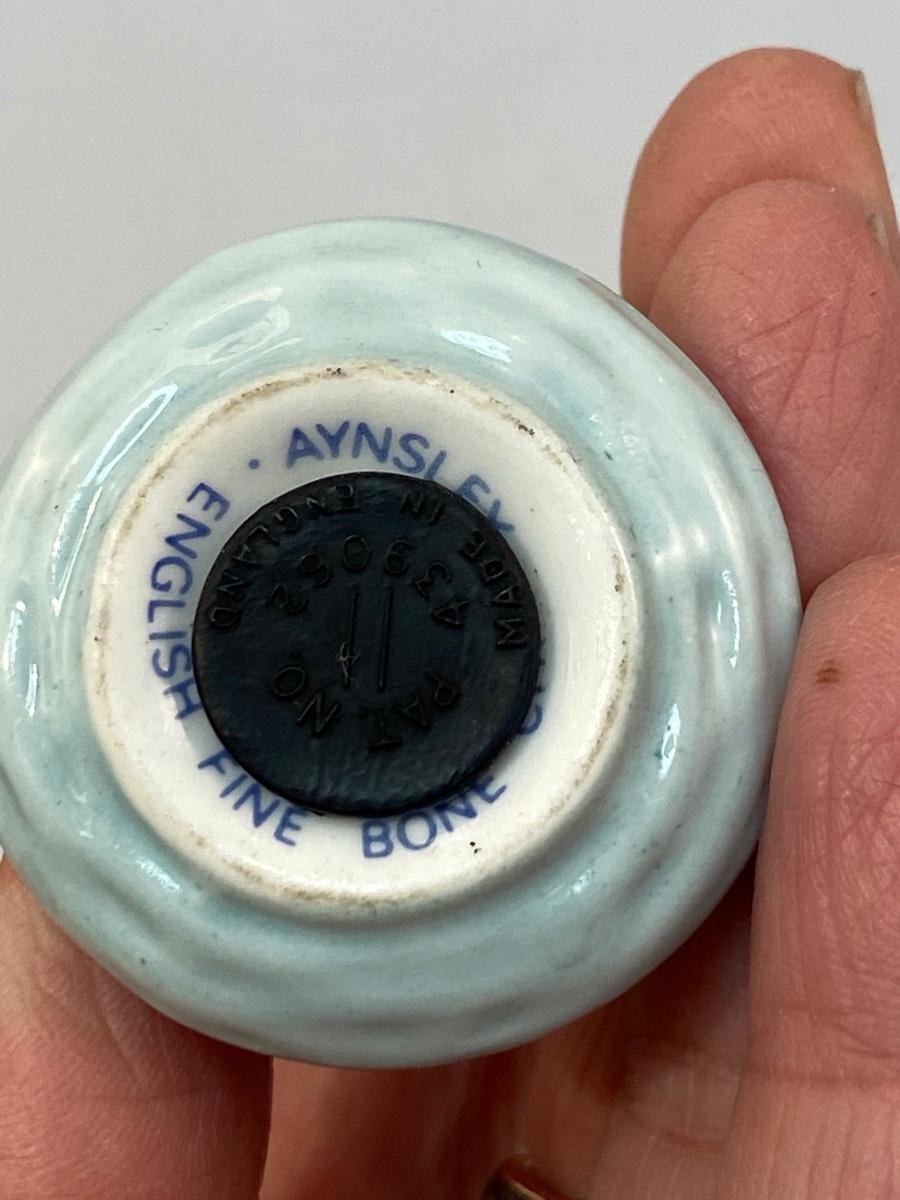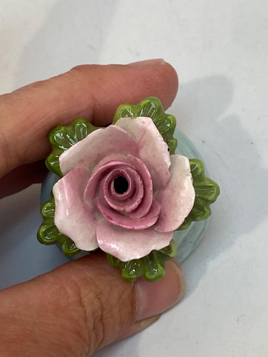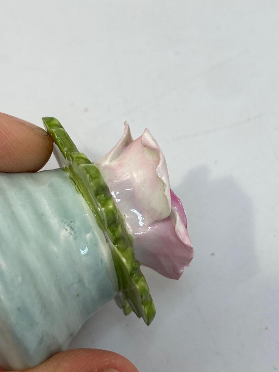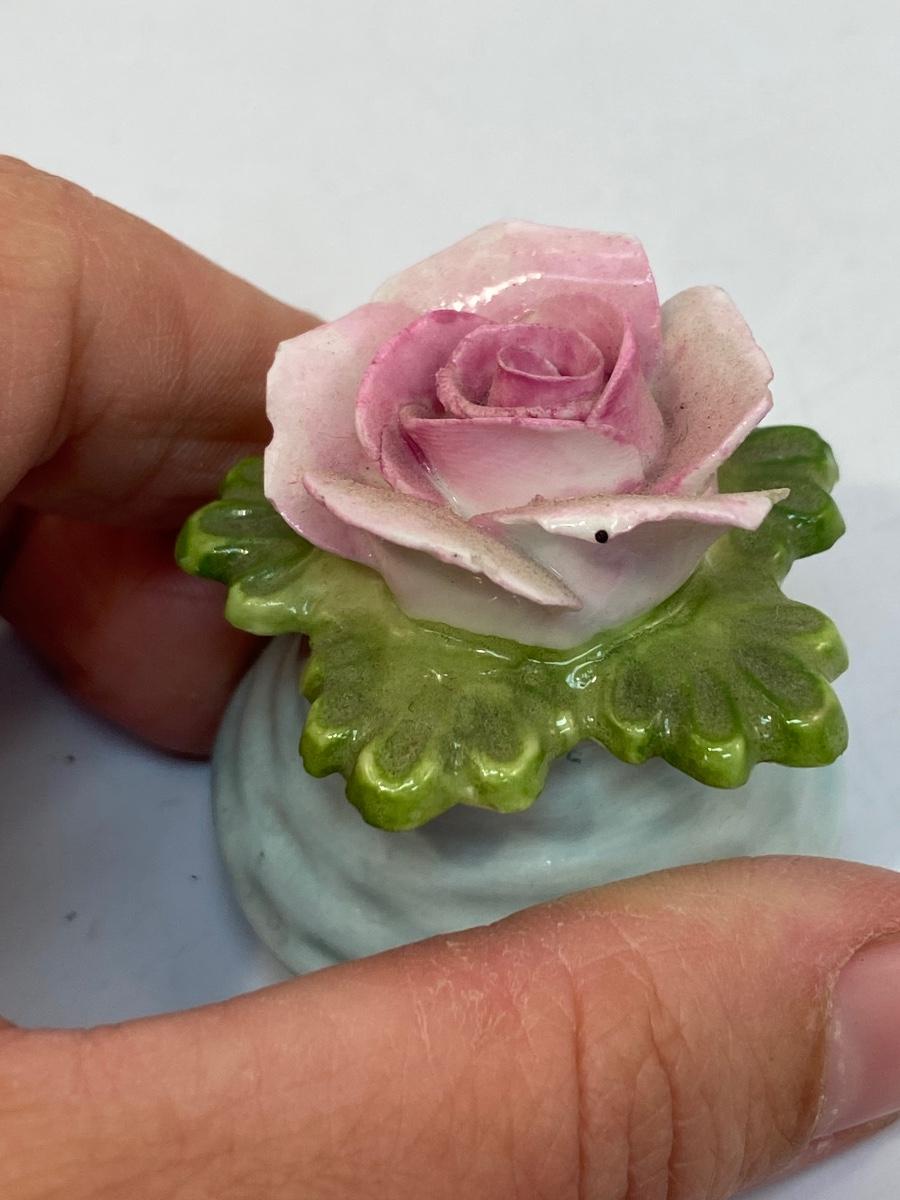 Vintage Aynsley Pink Rose Fine Bone China Powder Salt Pepper Shaker. In good vintage condition. One single hole in the top. Has bottom plug. Small, about 1.5" size. There are some rough spots along the petal edges, but they don't really look like chips.