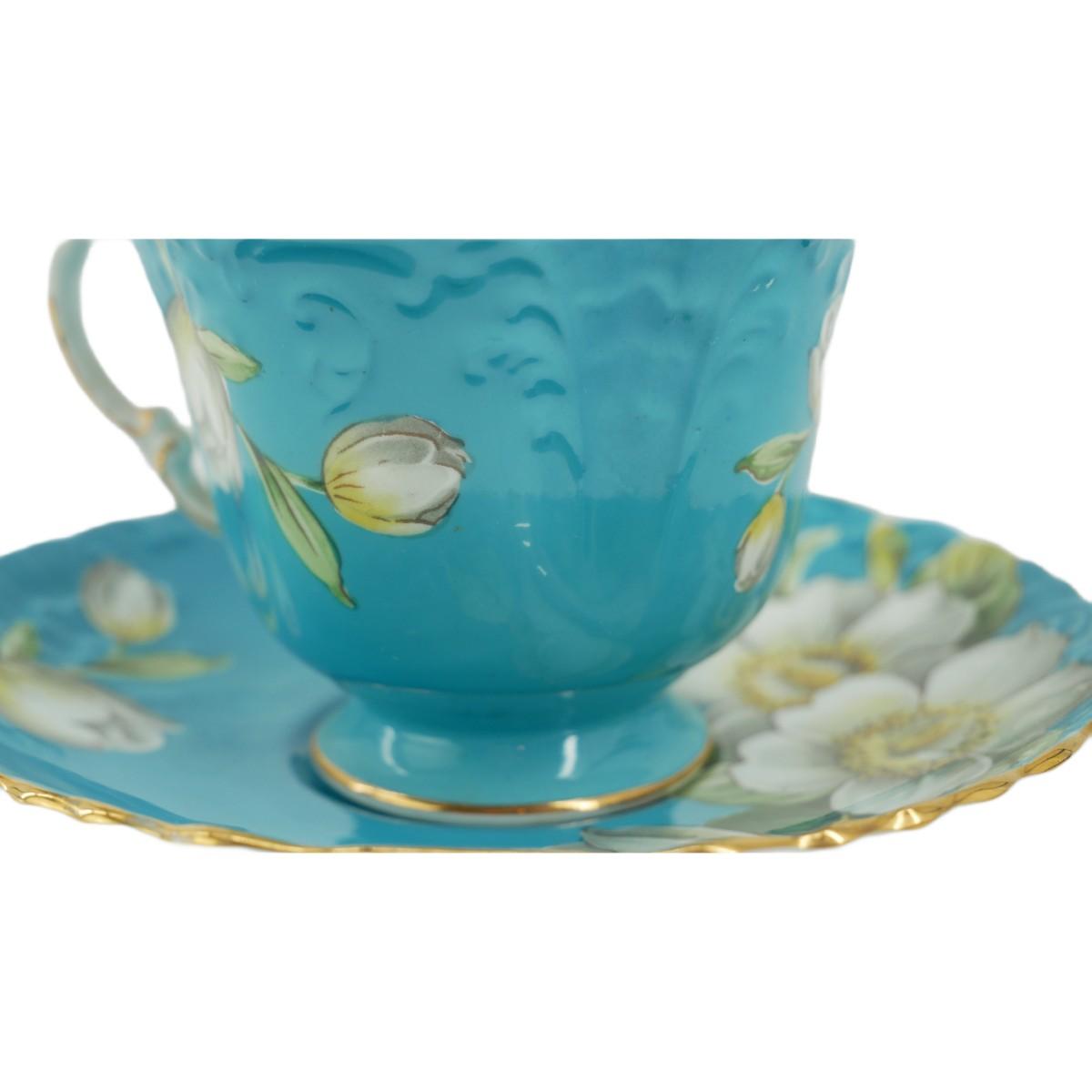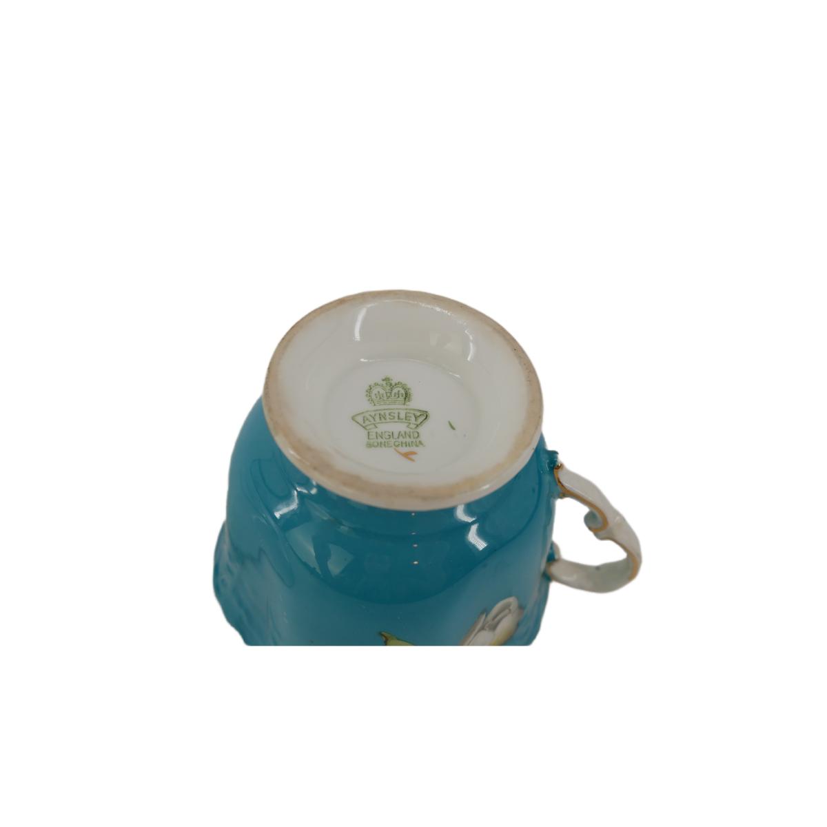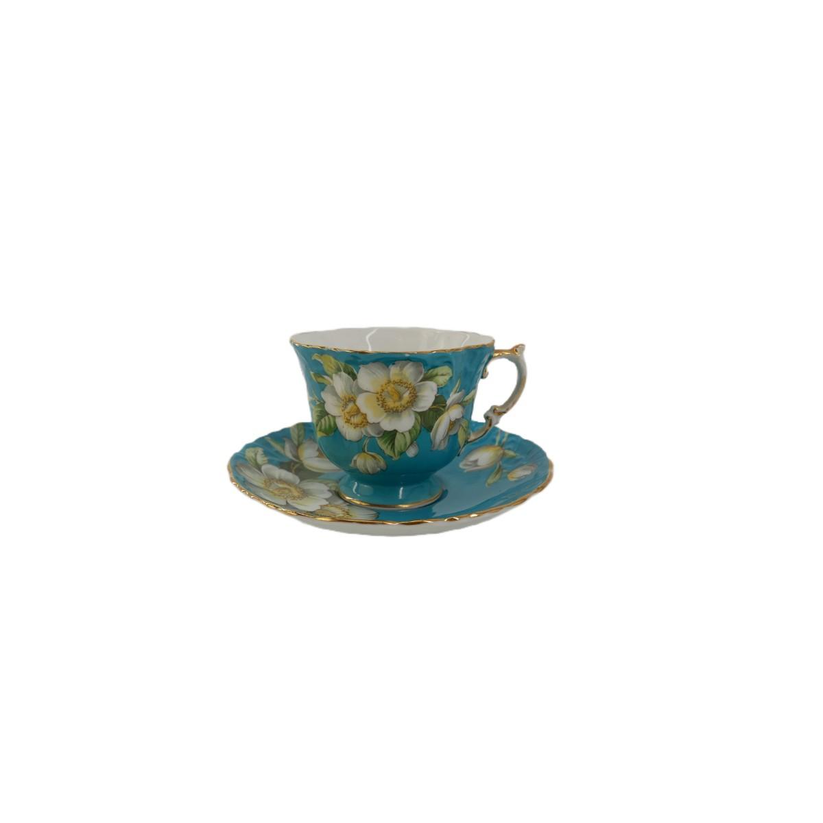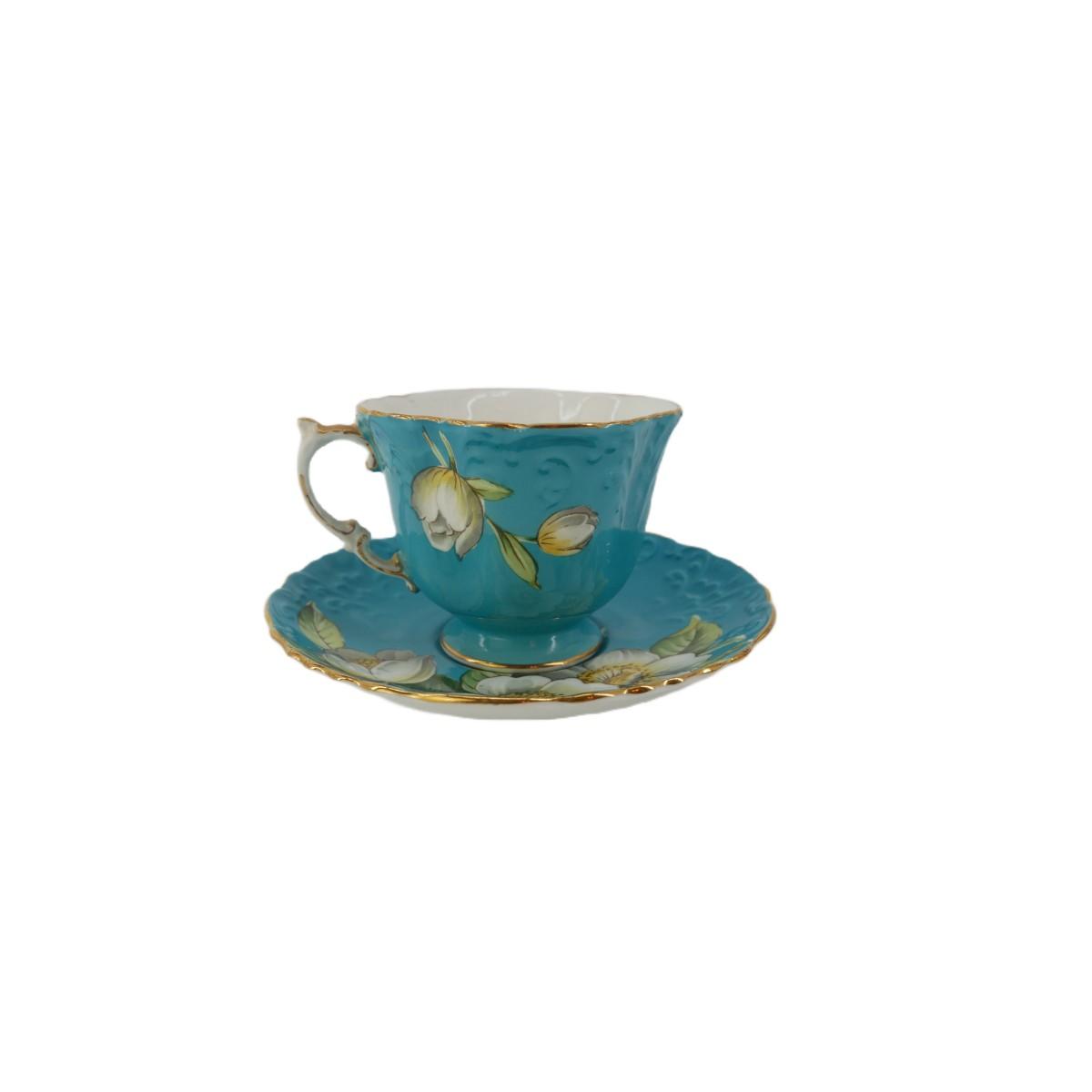 Absolutely stunning vintage Aynsley England Bone China teacup and saucer. Hand painted beautiful teal/turqouise blue color with gorgeous photo transfer white flowers. Scalloped gold brushed edges. Slight wear to paint (see photos). Excellent condition overall. Cup measures approximately 3.25" in diameter and 2.75" in height. Saucer measures 5.5" in diameter. Lot weighs 8.1 oz. (G5)