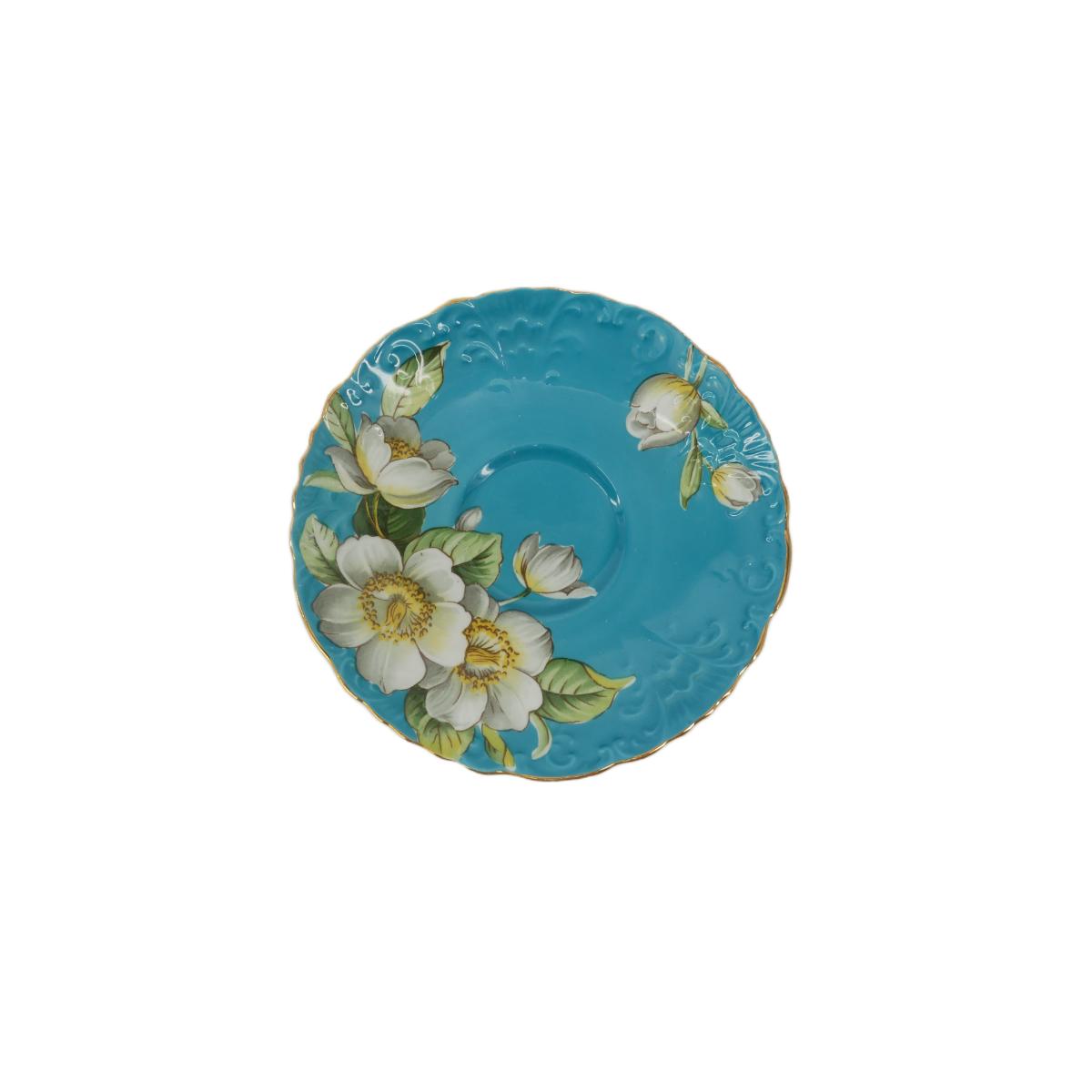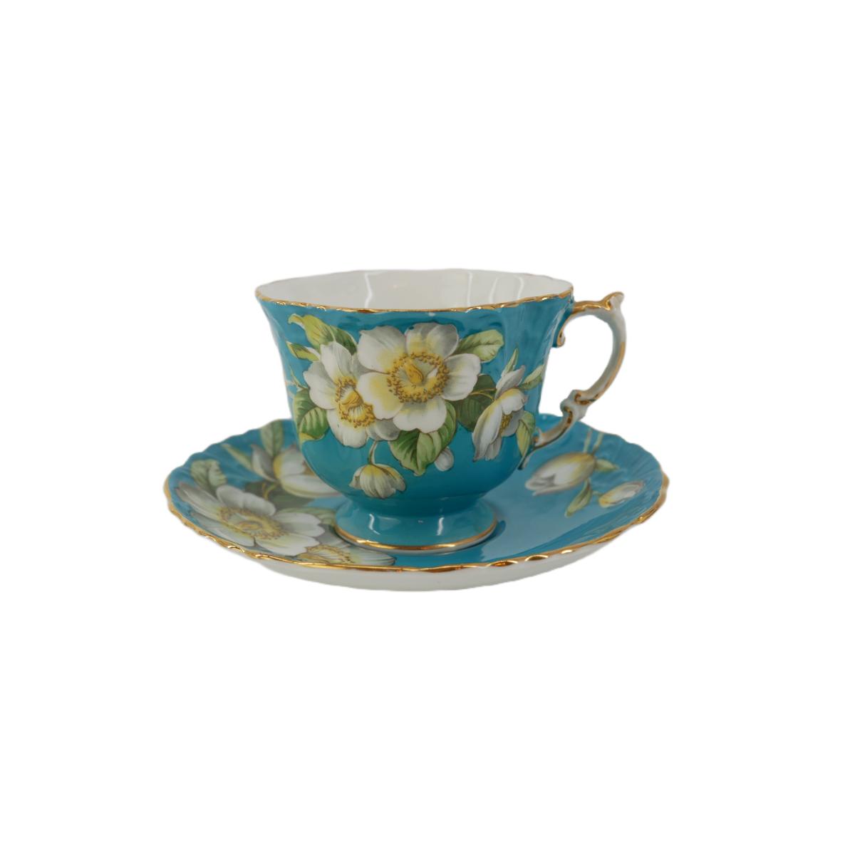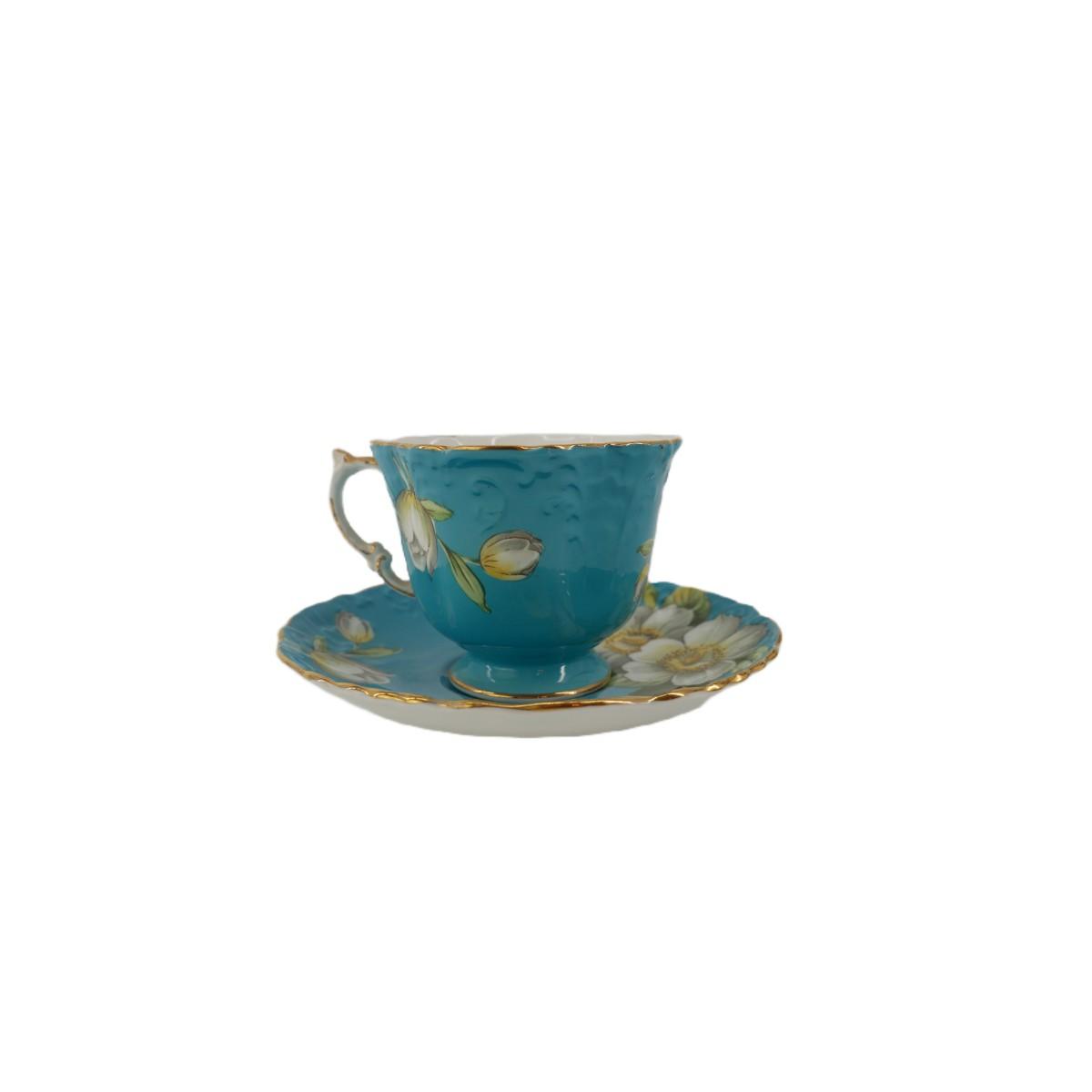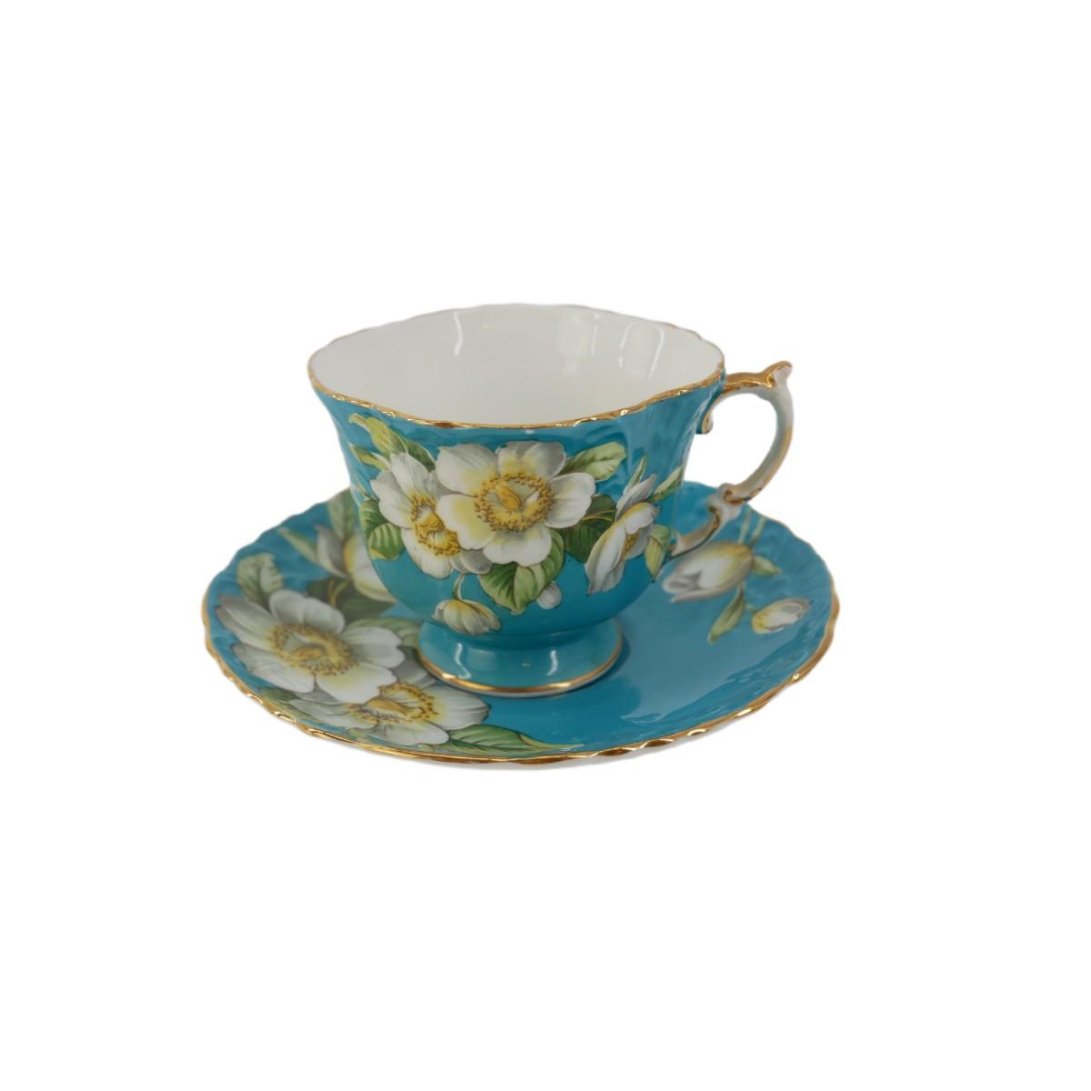 Absolutely stunning vintage Aynsley England Bone China teacup and saucer. Hand painted beautiful teal/turqouise blue color with gorgeous photo transfer white flowers. Scalloped gold brushed edges. Slight wear to paint (see photos). Excellent condition overall. Cup measures approximately 3.25" in diameter and 2.75" in height. Saucer measures 5.5" in diameter. Lot weighs 8.1 oz. (G5)
