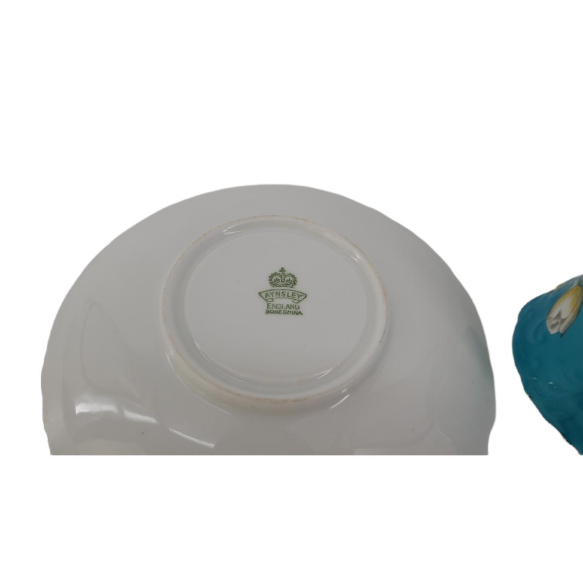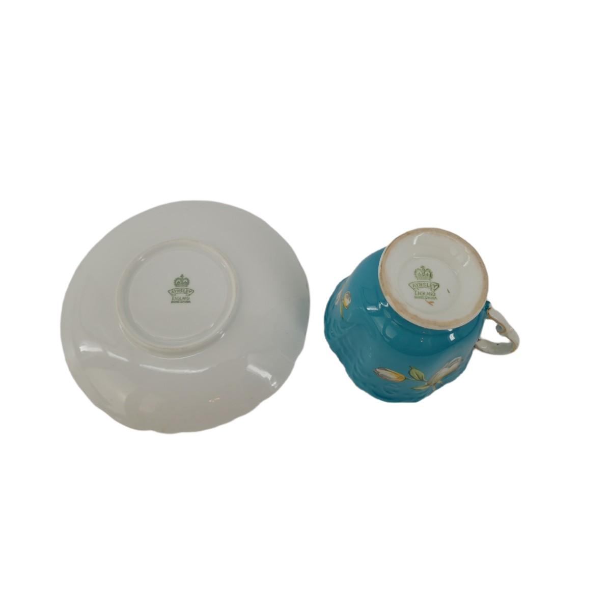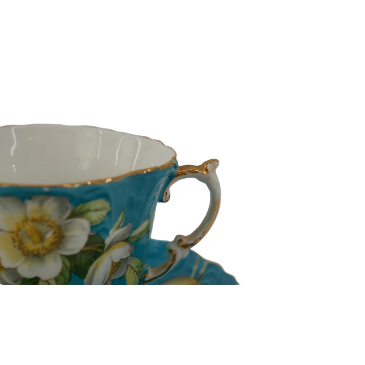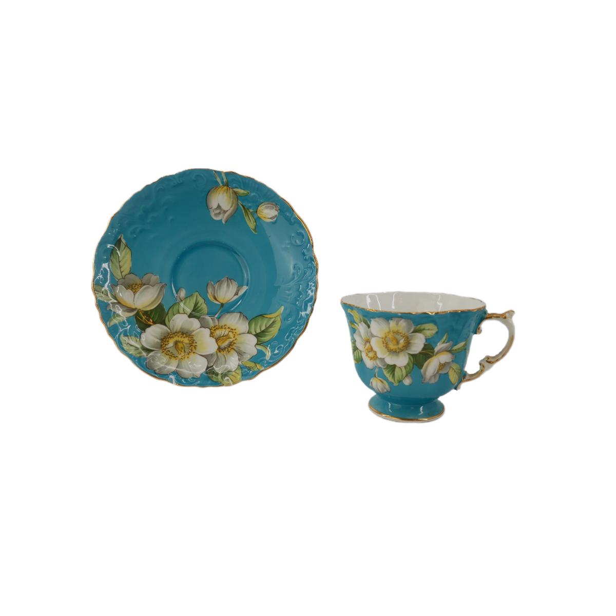 Absolutely stunning vintage Aynsley England Bone China teacup and saucer. Hand painted beautiful teal/turqouise blue color with gorgeous photo transfer white flowers. Scalloped gold brushed edges. Slight wear to paint (see photos). Excellent condition overall. Cup measures approximately 3.25" in diameter and 2.75" in height. Saucer measures 5.5" in diameter. Lot weighs 8.1 oz. (G5)
