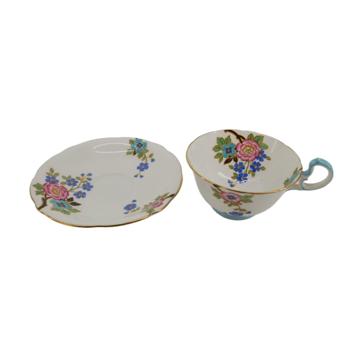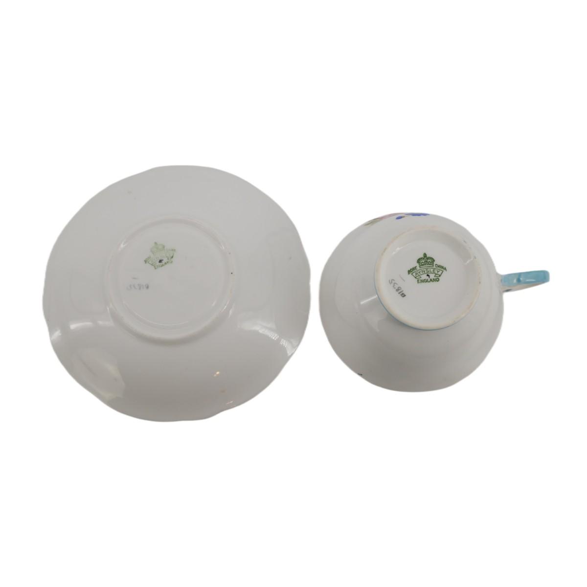 Gorgeous Aynsley England pink. and blue floral teacup and saucer. Amazing condition, no issues found. Measures 2.5" x. 3.5" and saucer measures 7.7 oz.