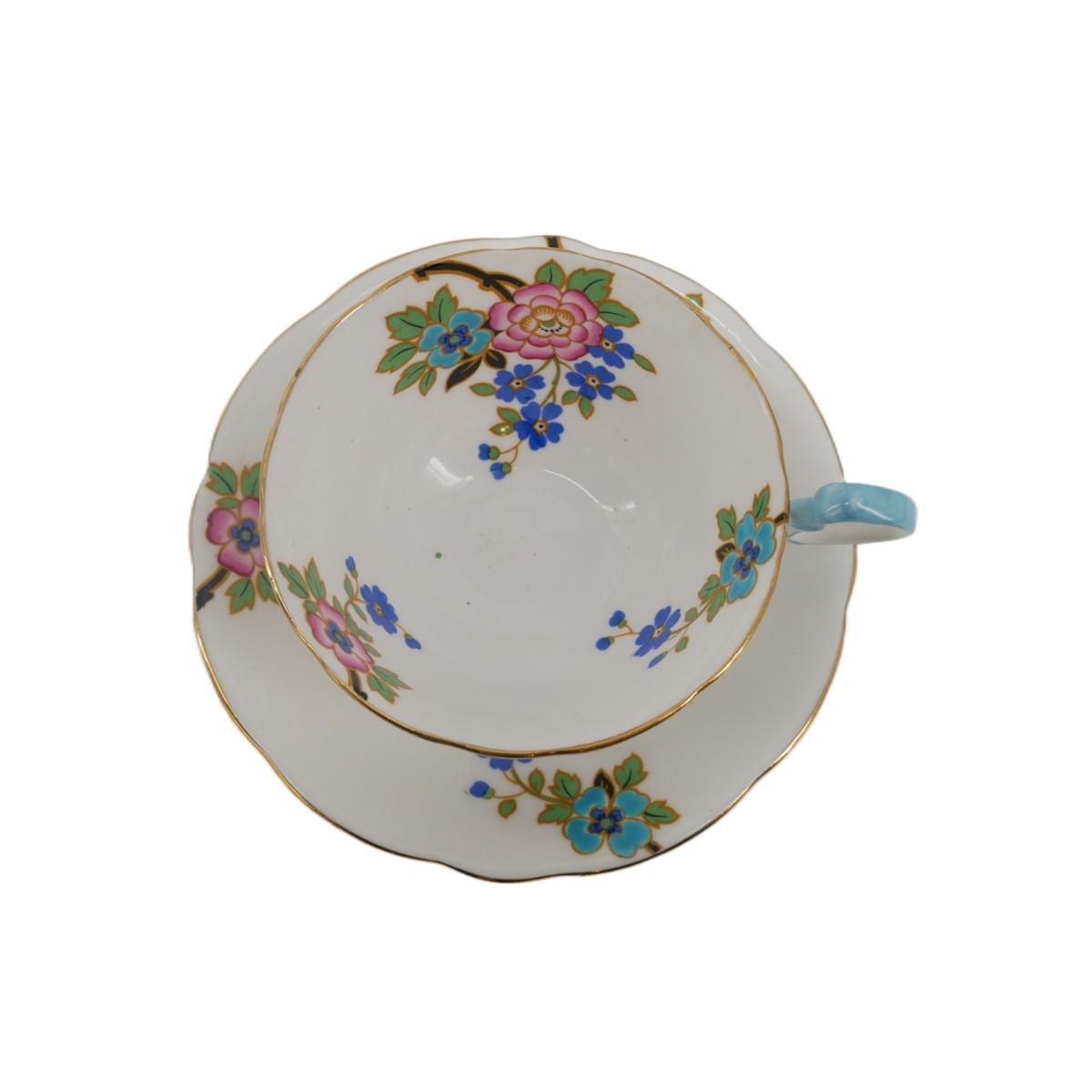 Gorgeous Aynsley England pink. and blue floral teacup and saucer. Amazing condition, no issues found. Measures 2.5" x. 3.5" and saucer measures 7.7 oz.