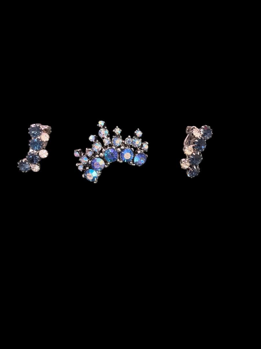 Vintage B. David Blue Aurora Borealis Rhinestone Brooch with Silver Tone Metal Set and Earrings