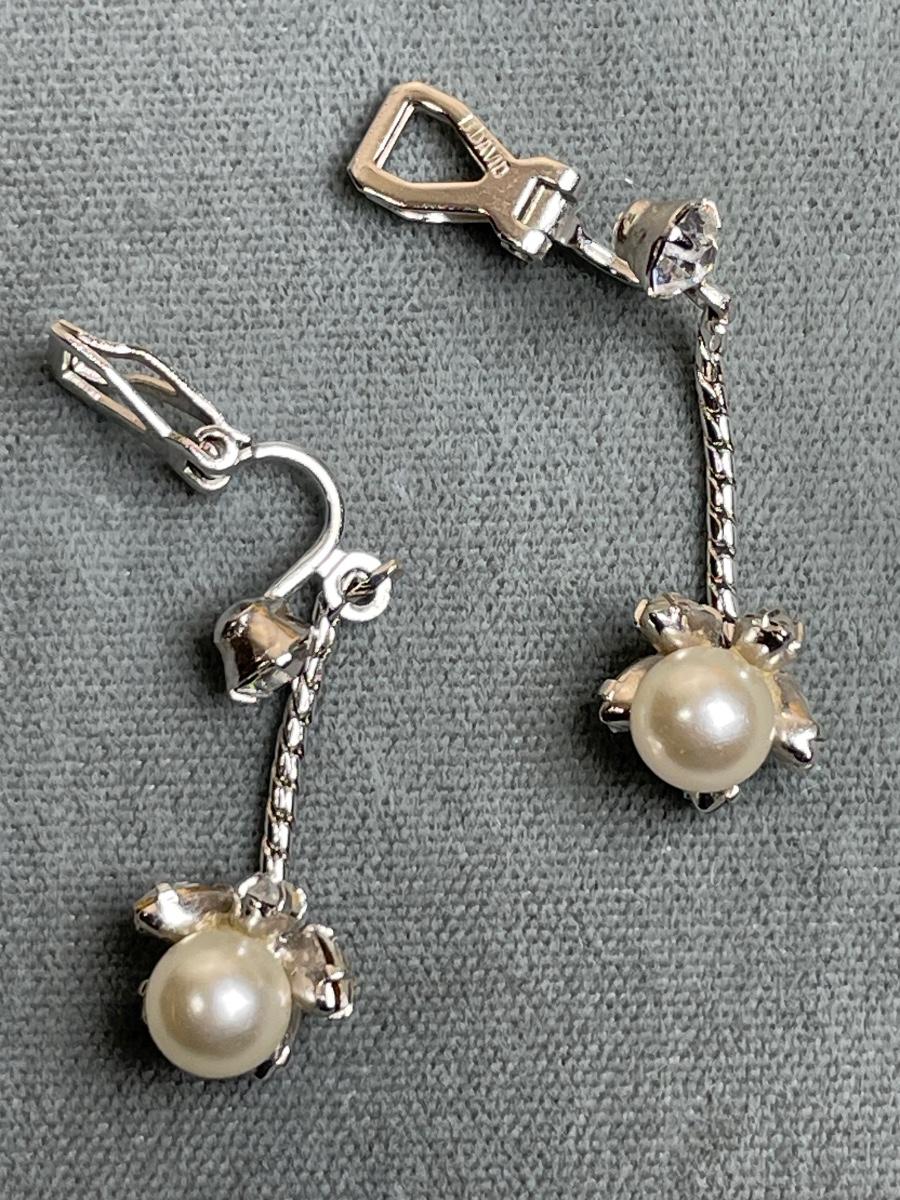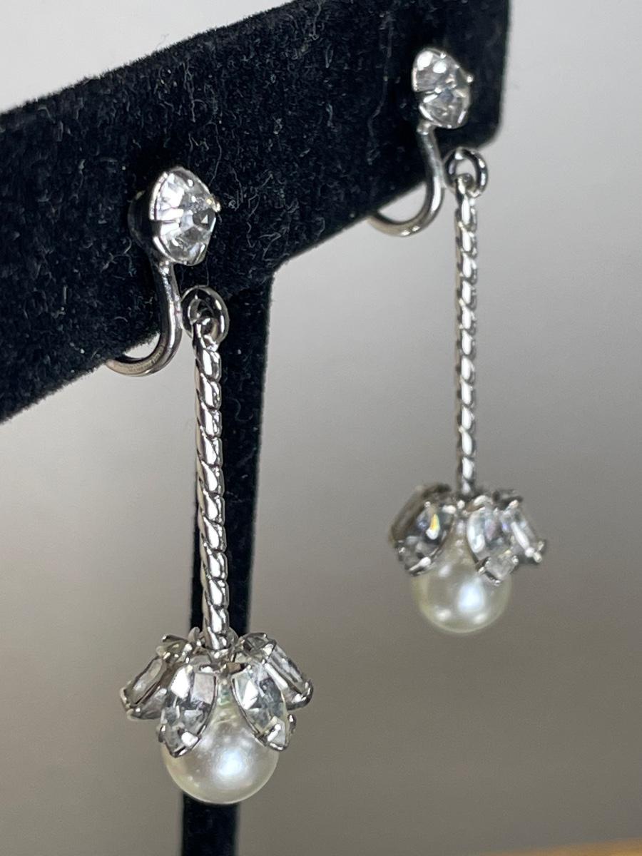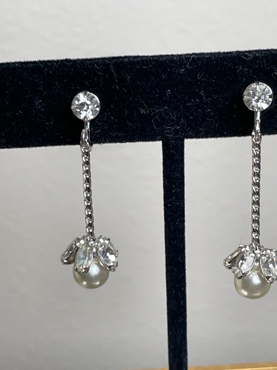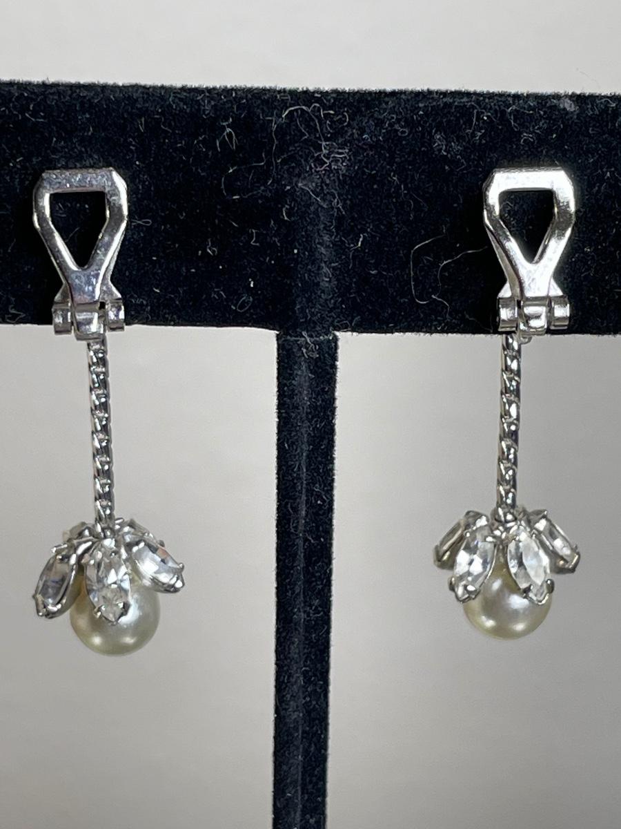 With faux pearls and clear rhinestones in silver tone metal. 1 1/2” long.