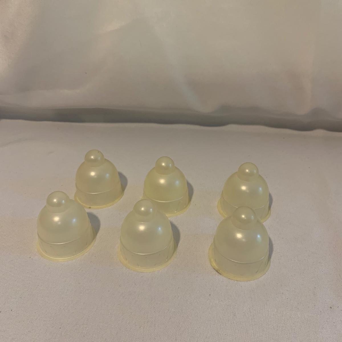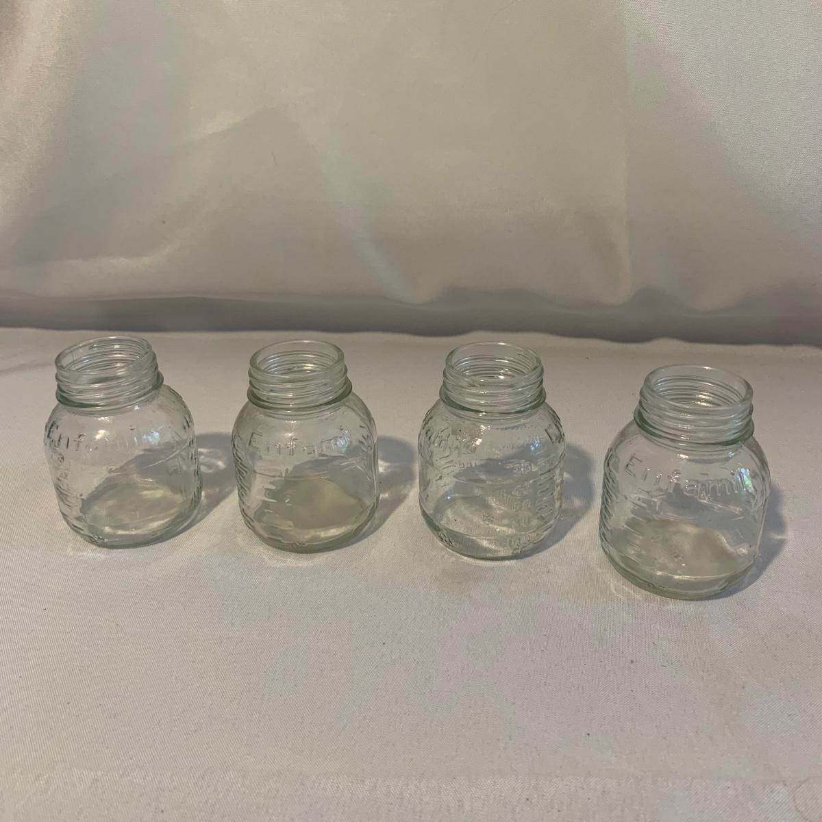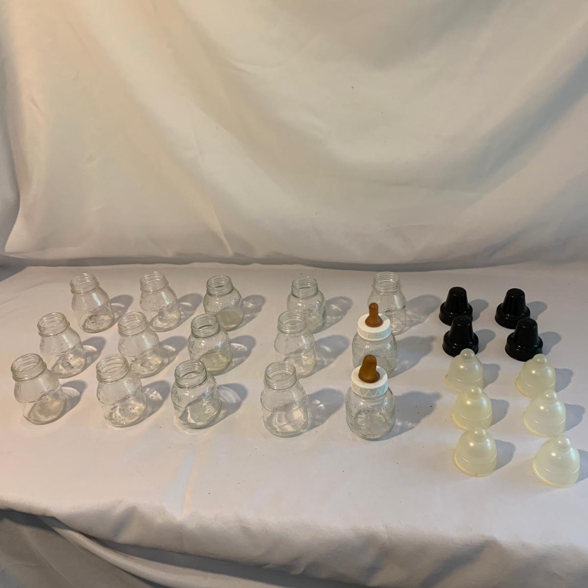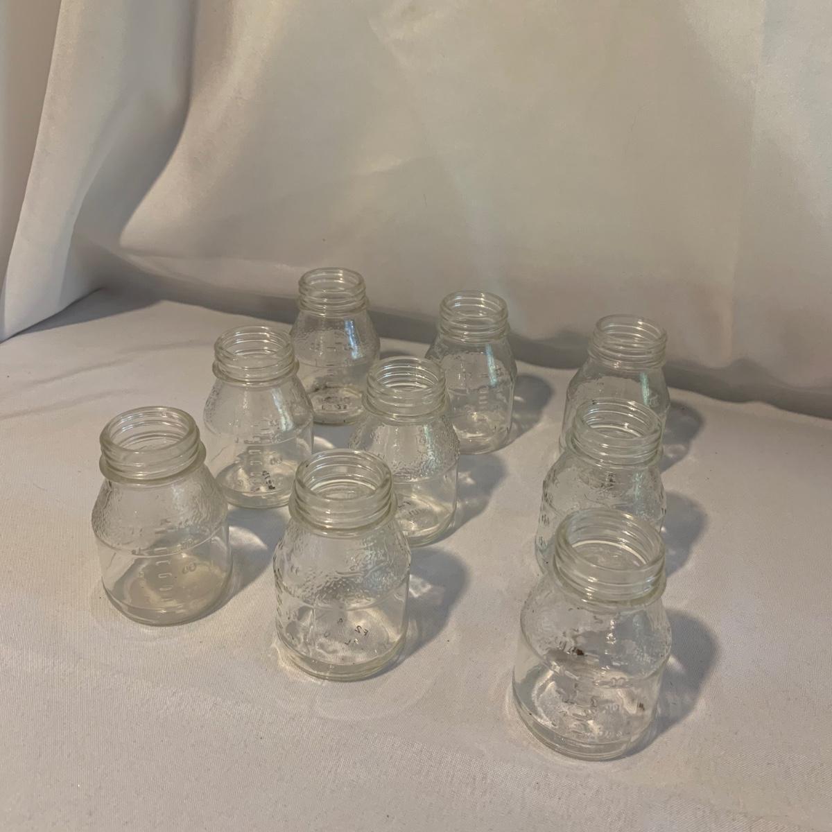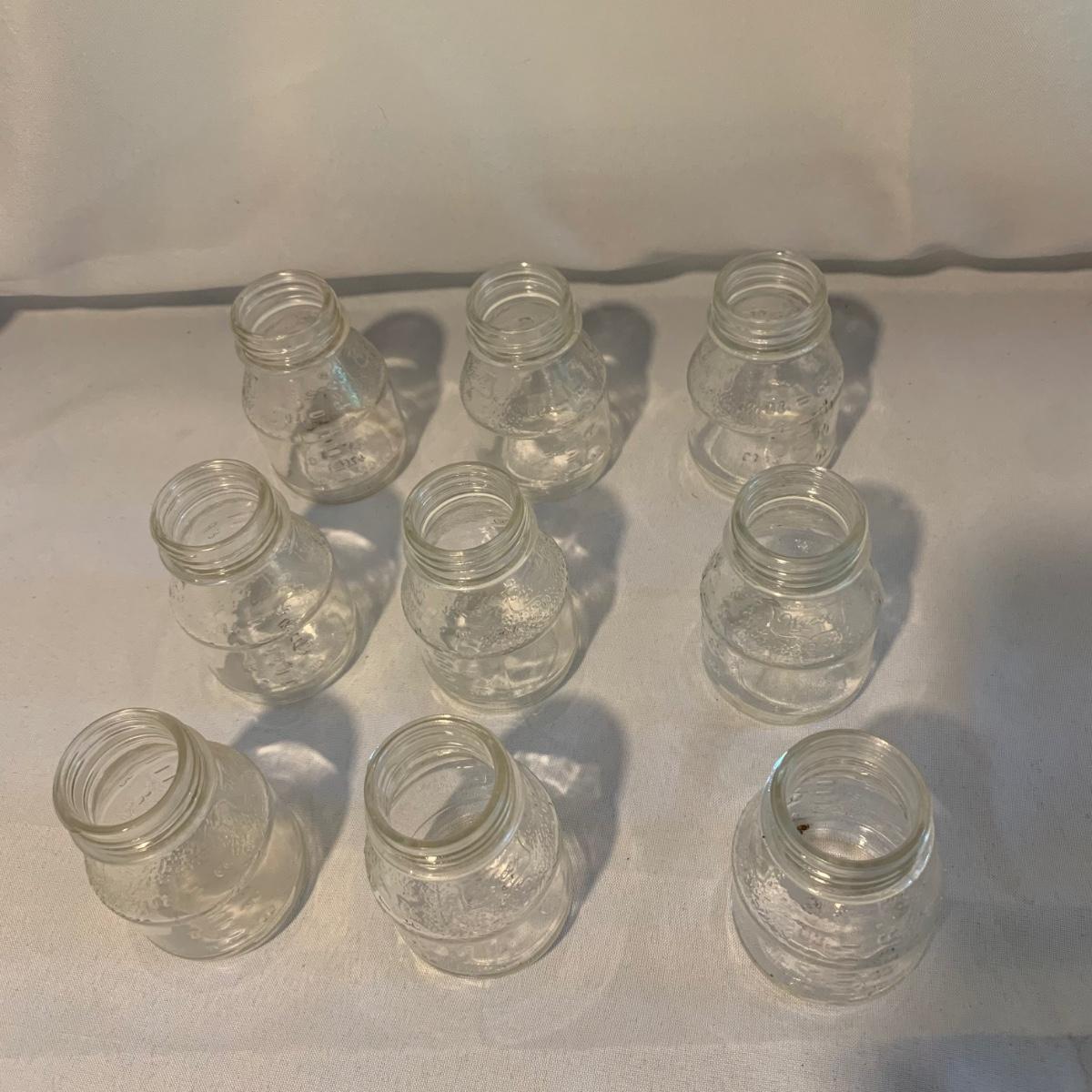 This lot includes 15 glass baby bottles, plastic lids, and two lids with nipples. The bottles are by the brands Enfamil and Wyeth. The bottles range from excellent to good condition with some of the bottles needing to be cleaned. A singular bottle measures about 3.5". Shipping available.
