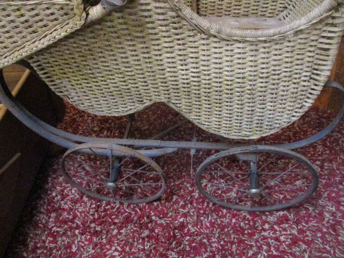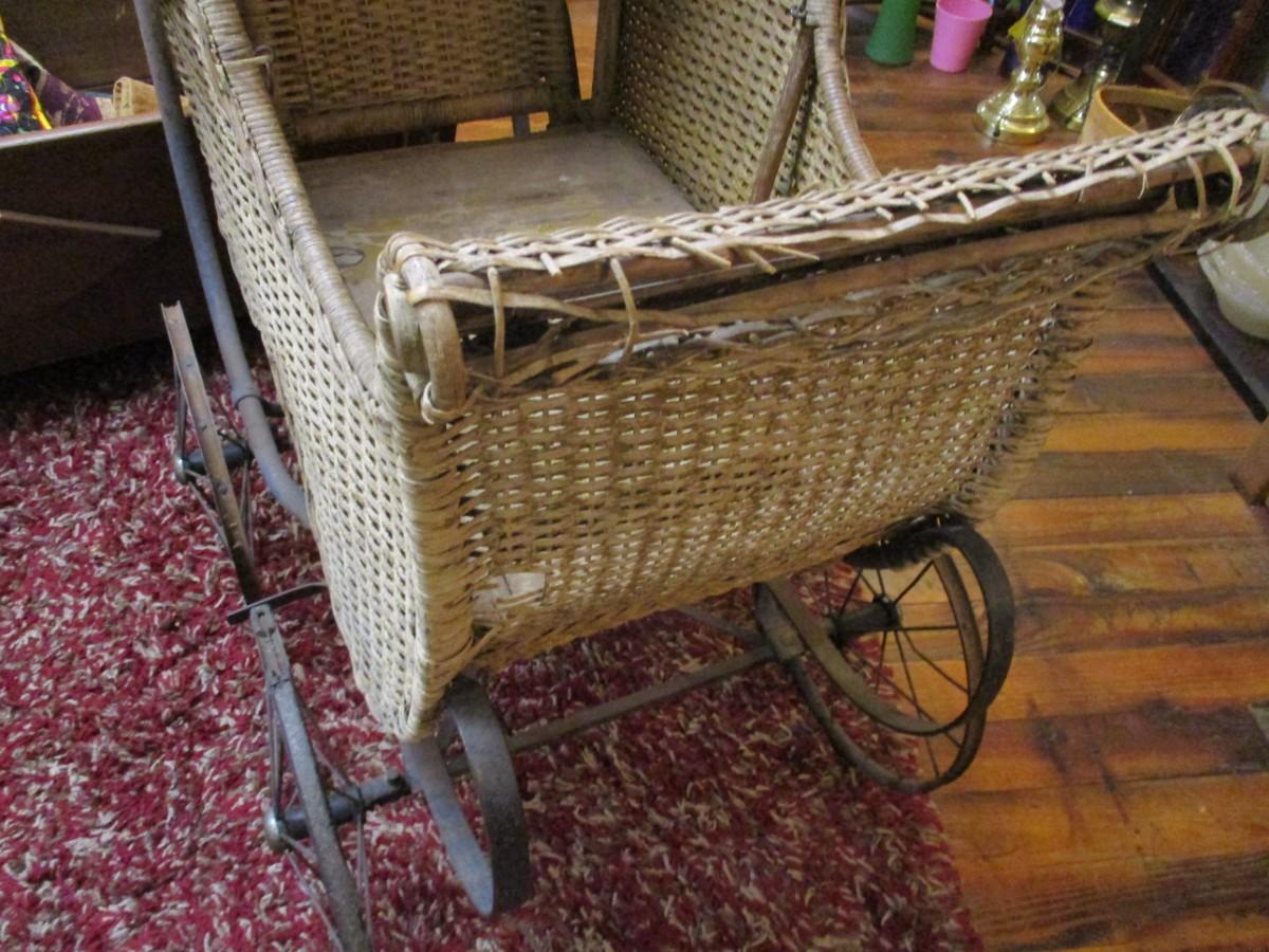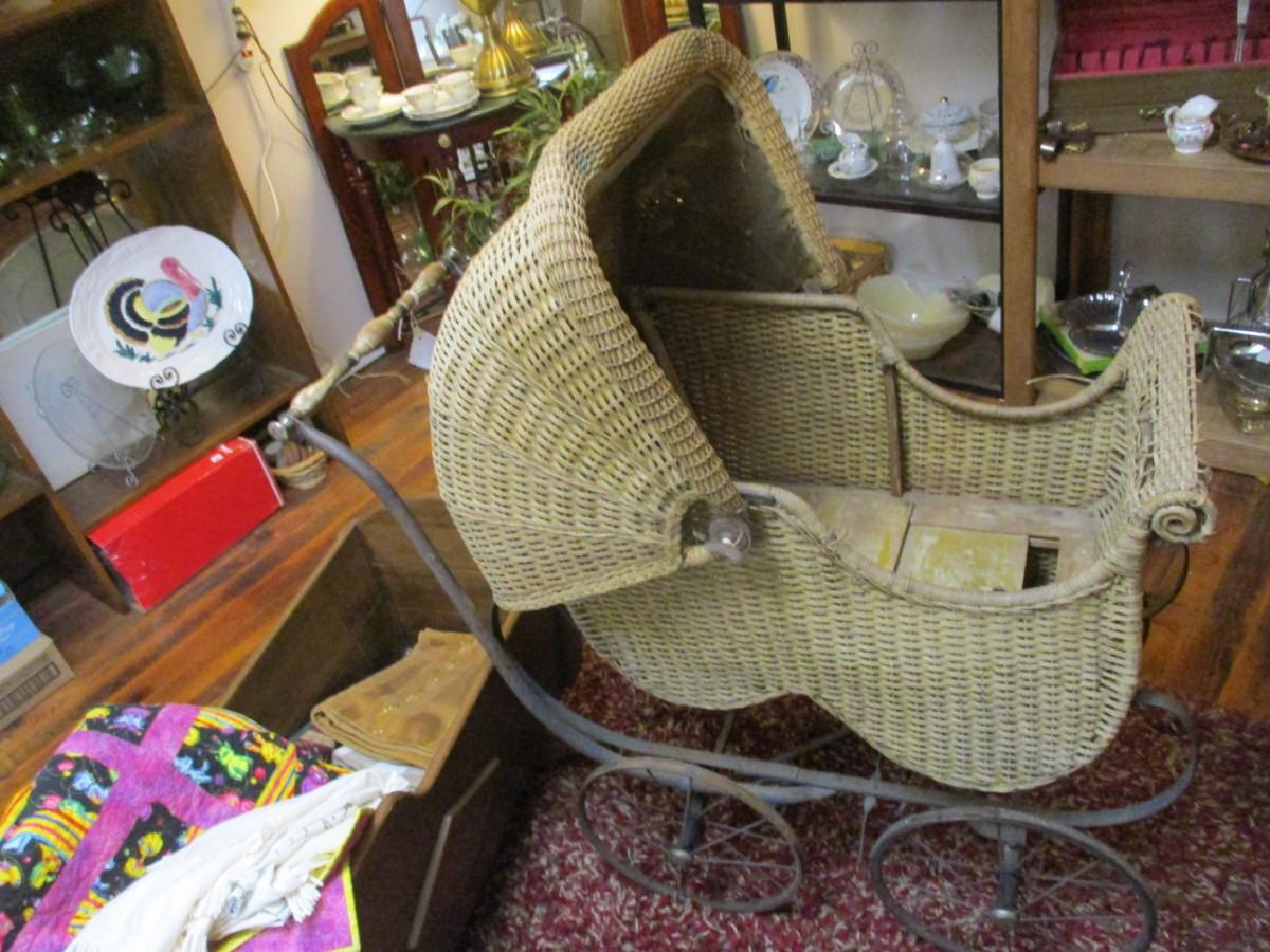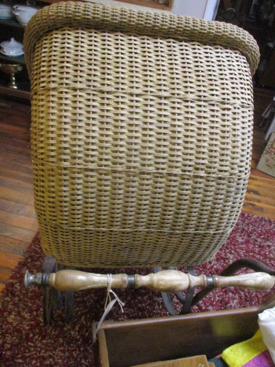Vintage Wicker Push Baby Carriage with Bonnet - F