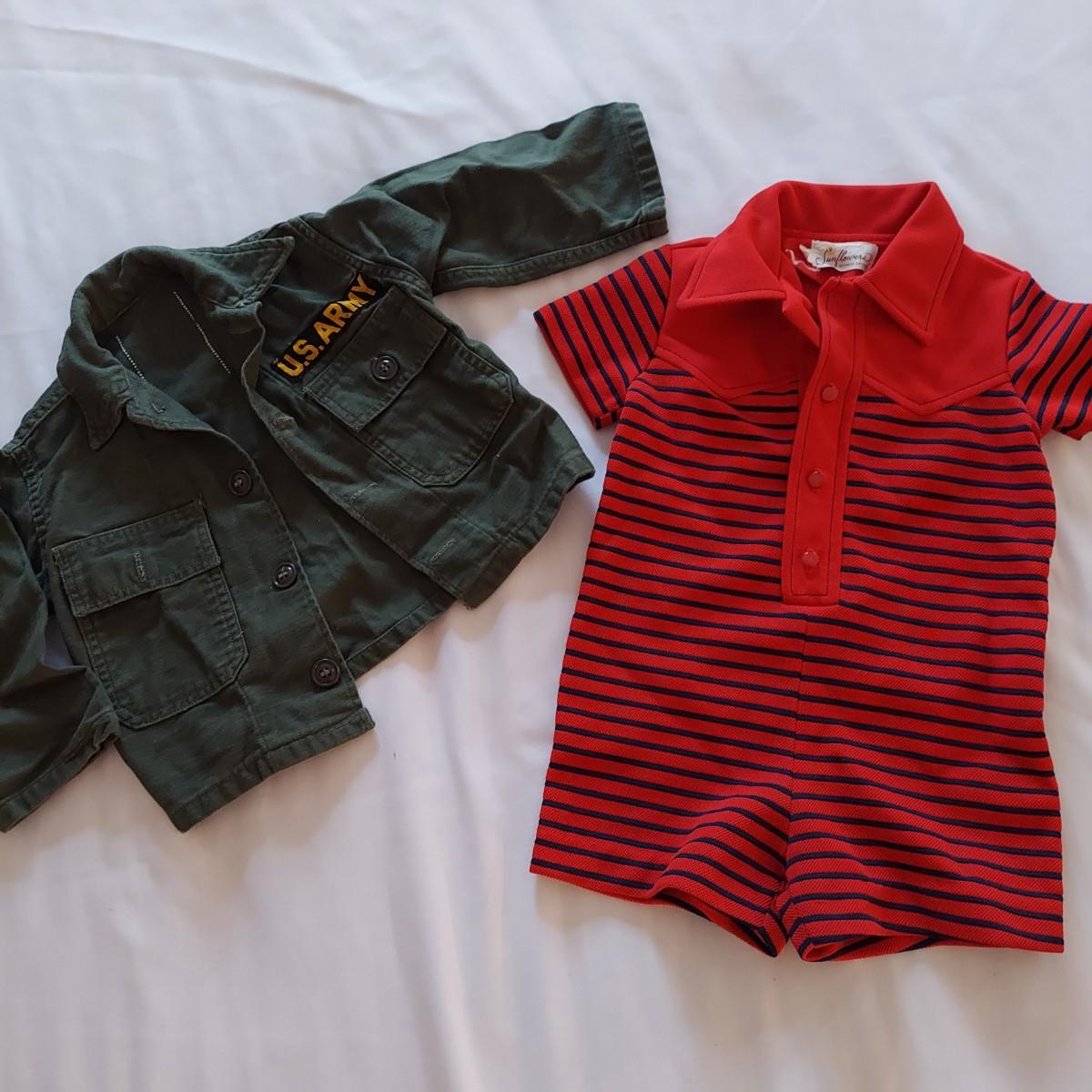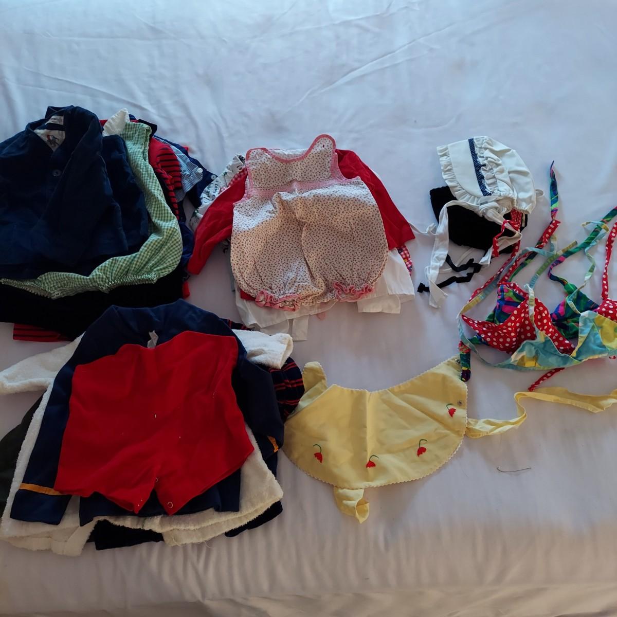 Lot includes 20+ pieces of vintage baby clothes including jackets, dresses, bonnets and swim tops. All pieces are baby sized, approximately 24 months average. Some overall wear due to age. Shipping available