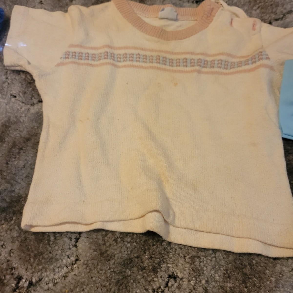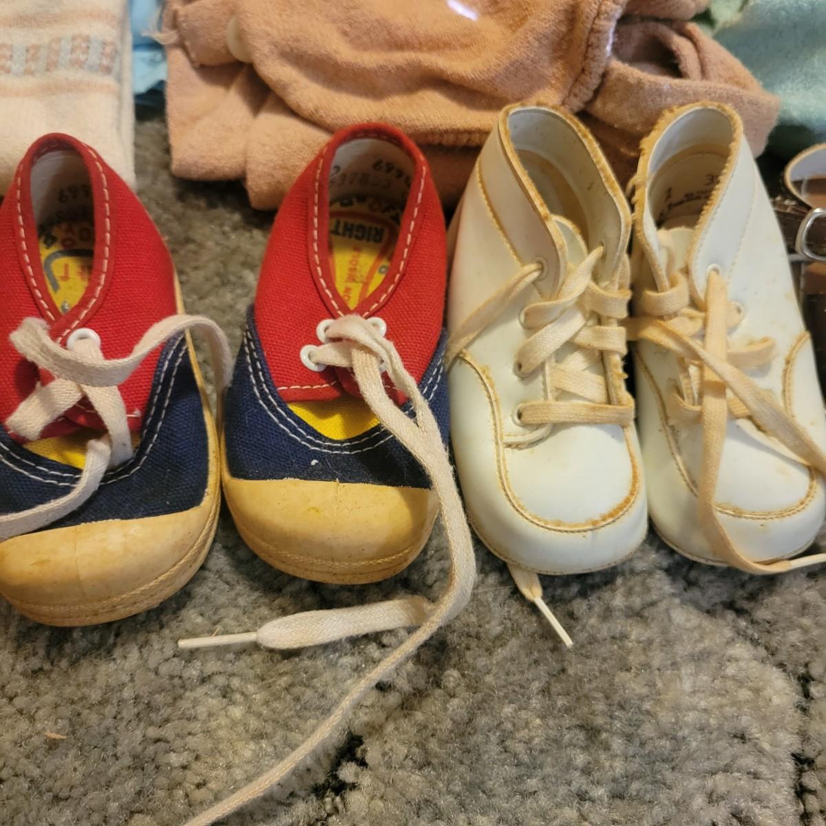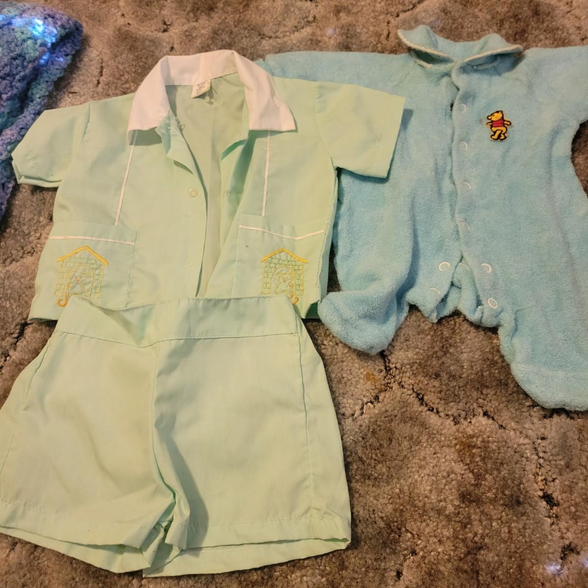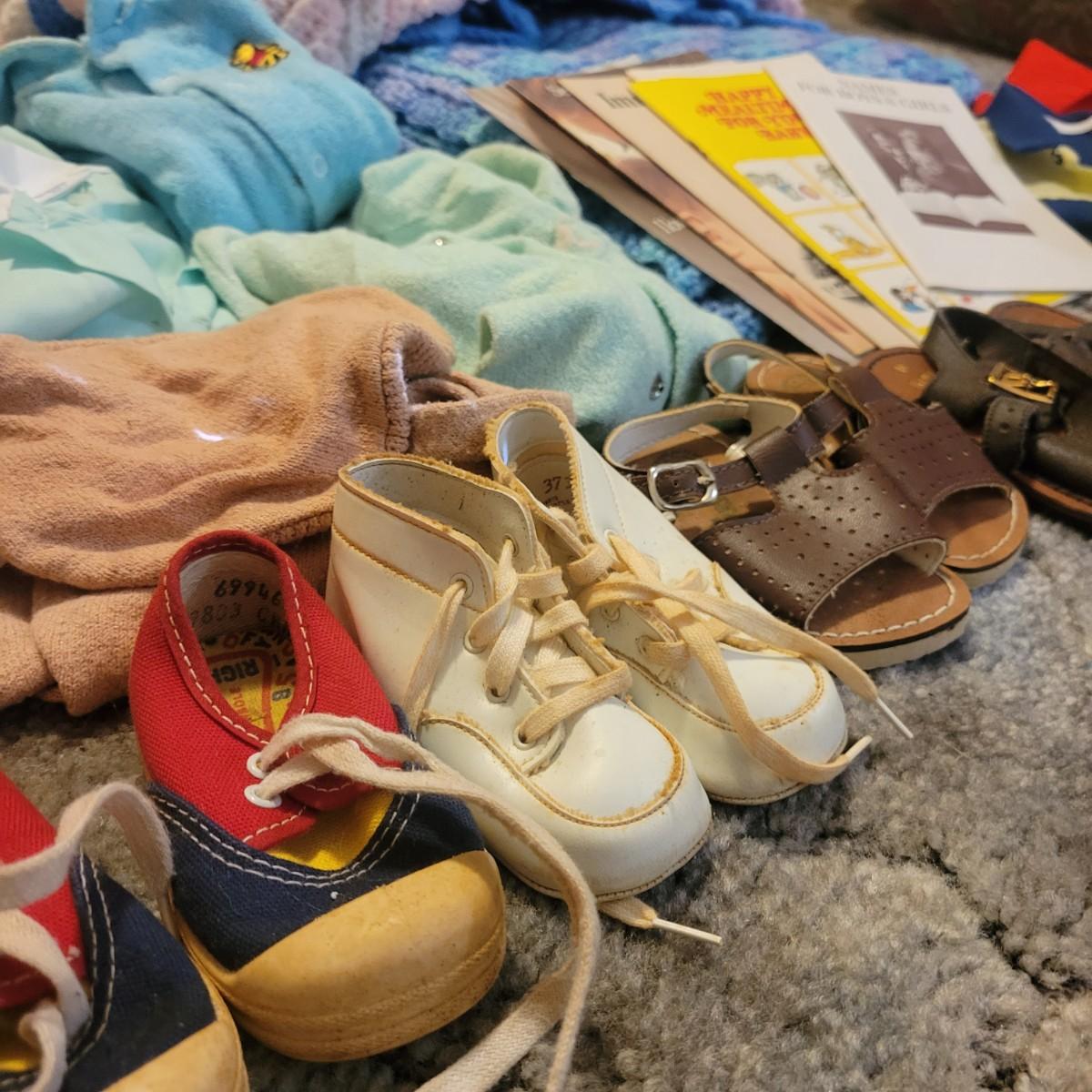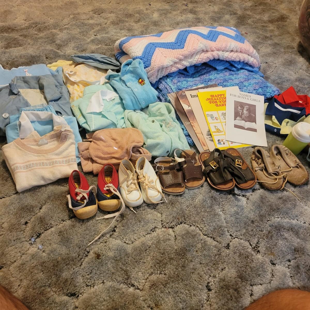 A collection of vintage baby and toddler clothes in good condition. Some items have minor stains. Includes shirts, shorts, jumpers, jackets and more. Also includes shoes, sandals and a pair of moccasins. Two handcrafted afghans are also in this lot. Both are in excellent condition. Blue and purple afghan measures approximately 34" x 50". Shoes are size 3 and 4. Shipping available