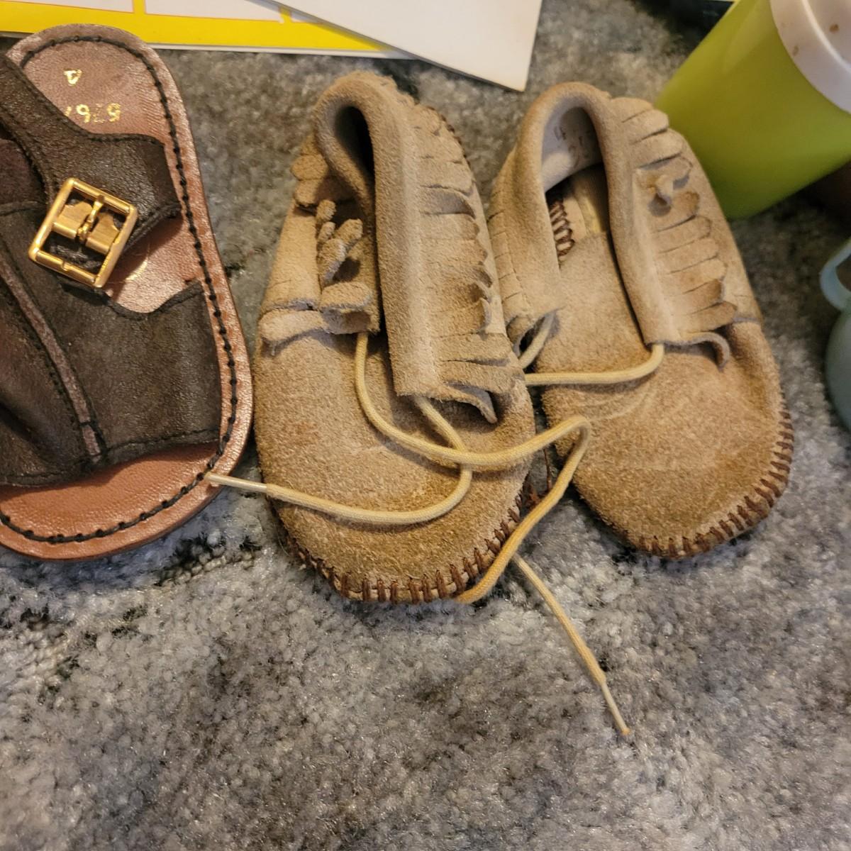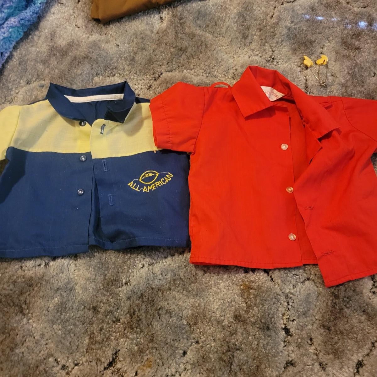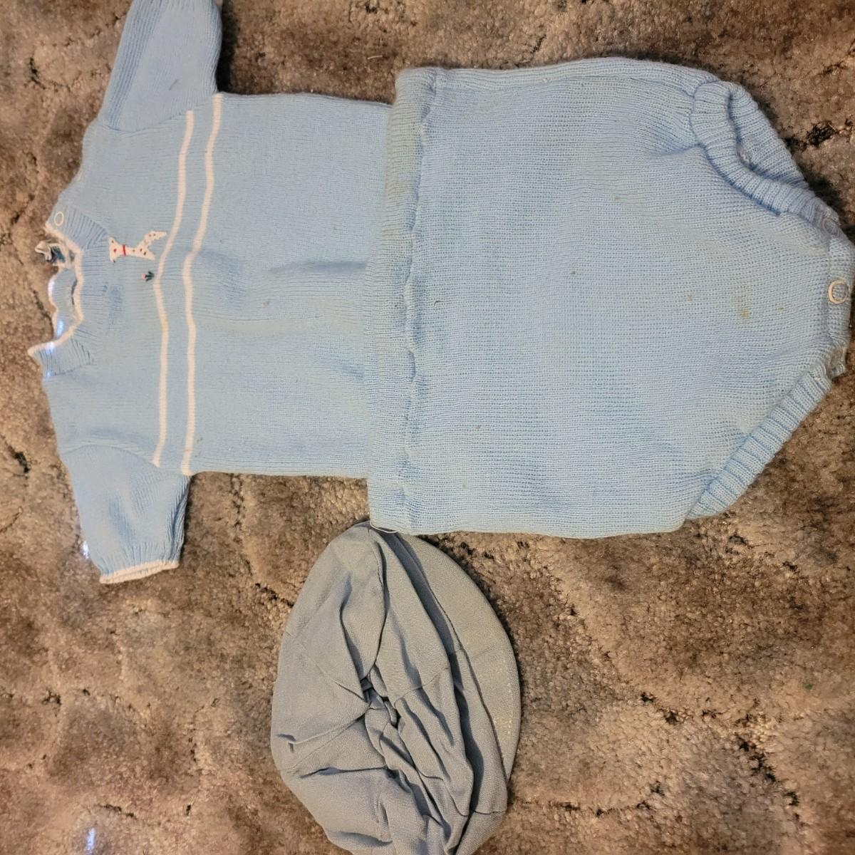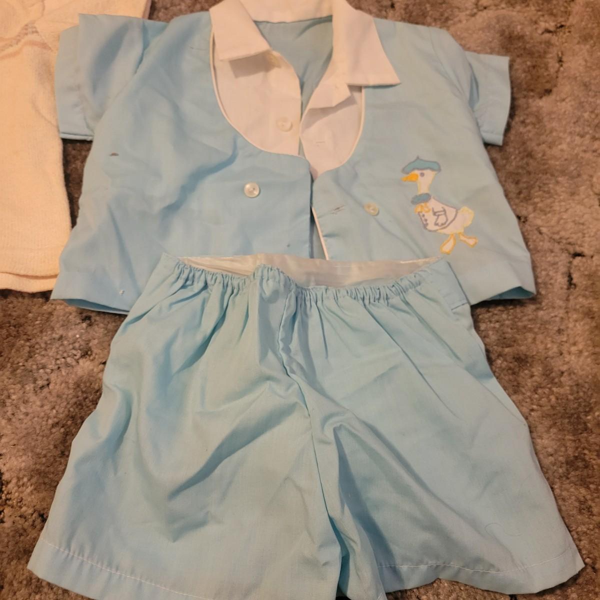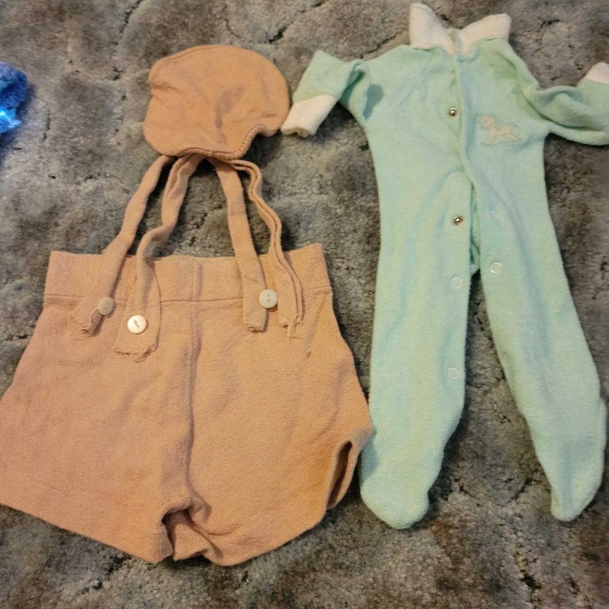 A collection of vintage baby and toddler clothes in good condition. Some items have minor stains. Includes shirts, shorts, jumpers, jackets and more. Also includes shoes, sandals and a pair of moccasins. Two handcrafted afghans are also in this lot. Both are in excellent condition. Blue and purple afghan measures approximately 34" x 50". Shoes are size 3 and 4. Shipping available