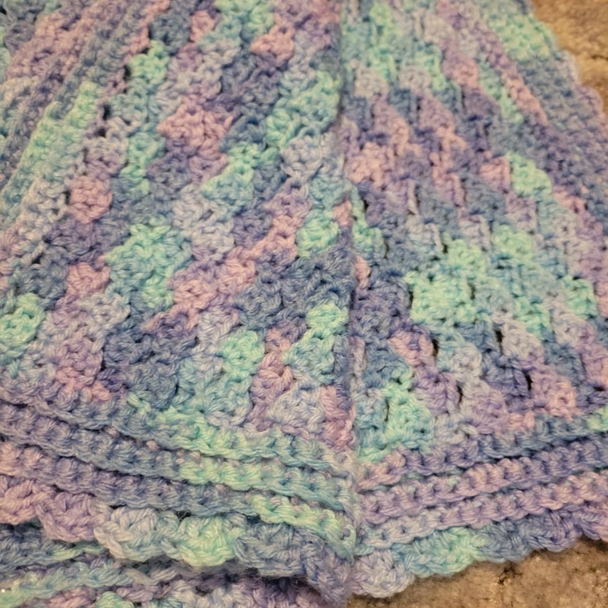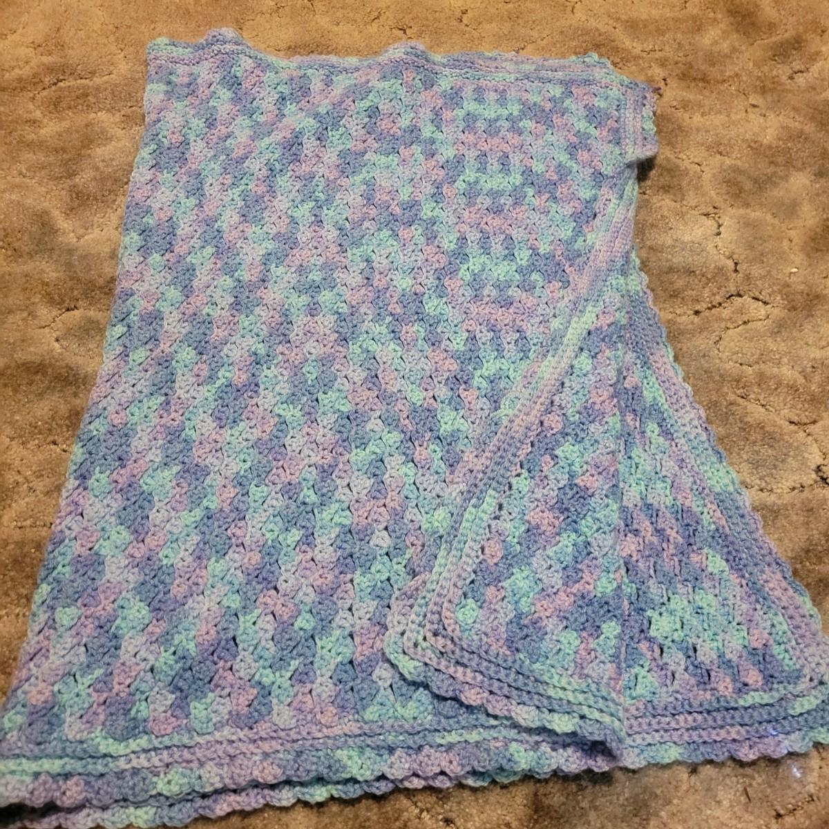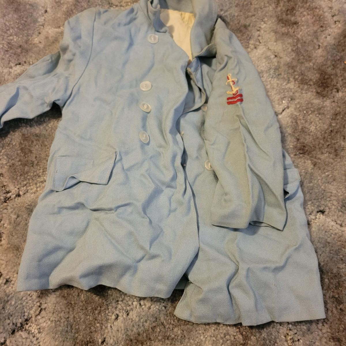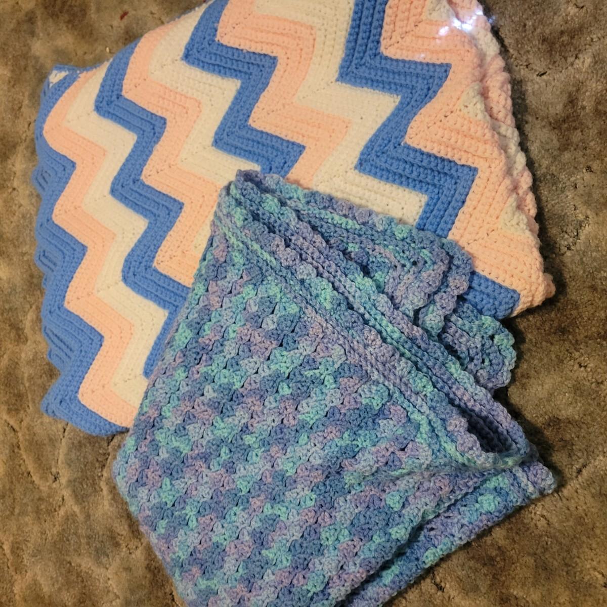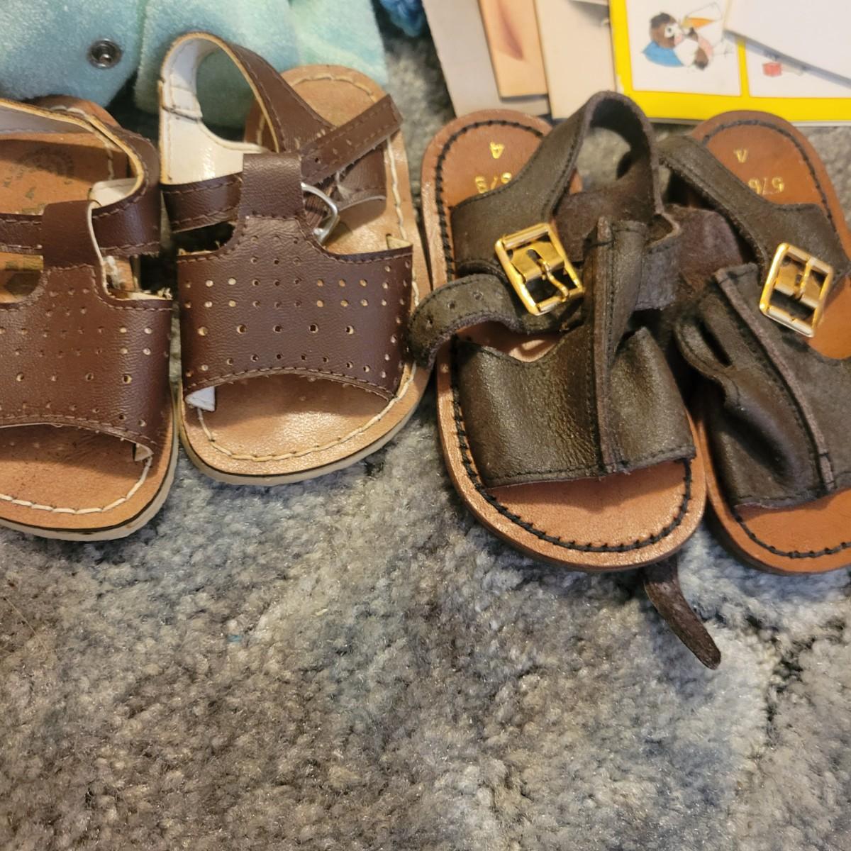 A collection of vintage baby and toddler clothes in good condition. Some items have minor stains. Includes shirts, shorts, jumpers, jackets and more. Also includes shoes, sandals and a pair of moccasins. Two handcrafted afghans are also in this lot. Both are in excellent condition. Blue and purple afghan measures approximately 34" x 50". Shoes are size 3 and 4. Shipping available