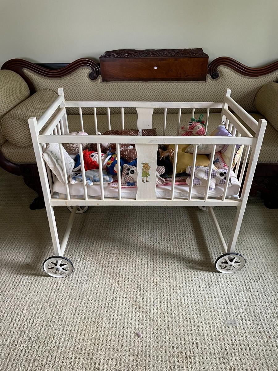 Vintage Baby Crib with Wheels with Vintage Dolls/Toys