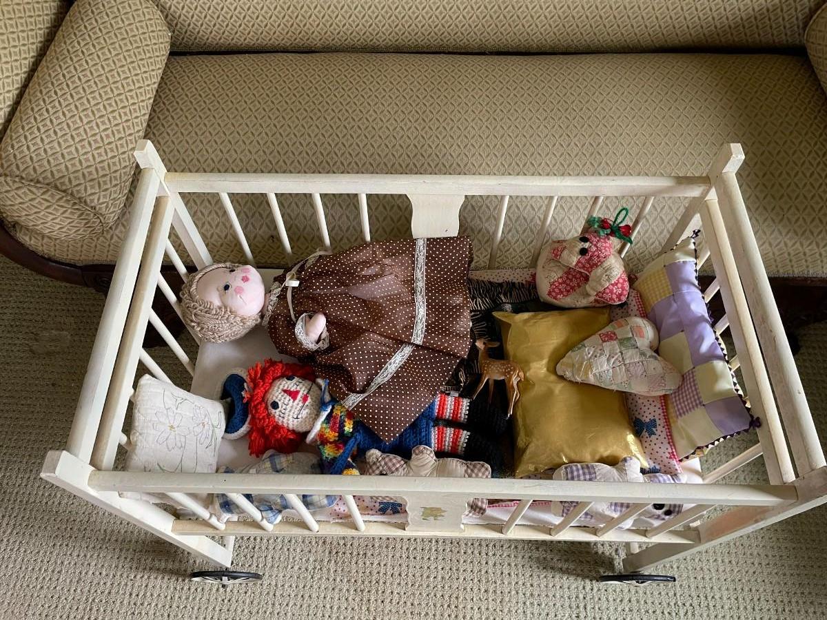 Crib is in good condition with minor wearing. Lot includes vintage dolls, toys, quilt, and pillow. 35'l x 20"w x 32"h.