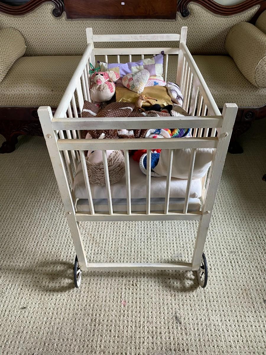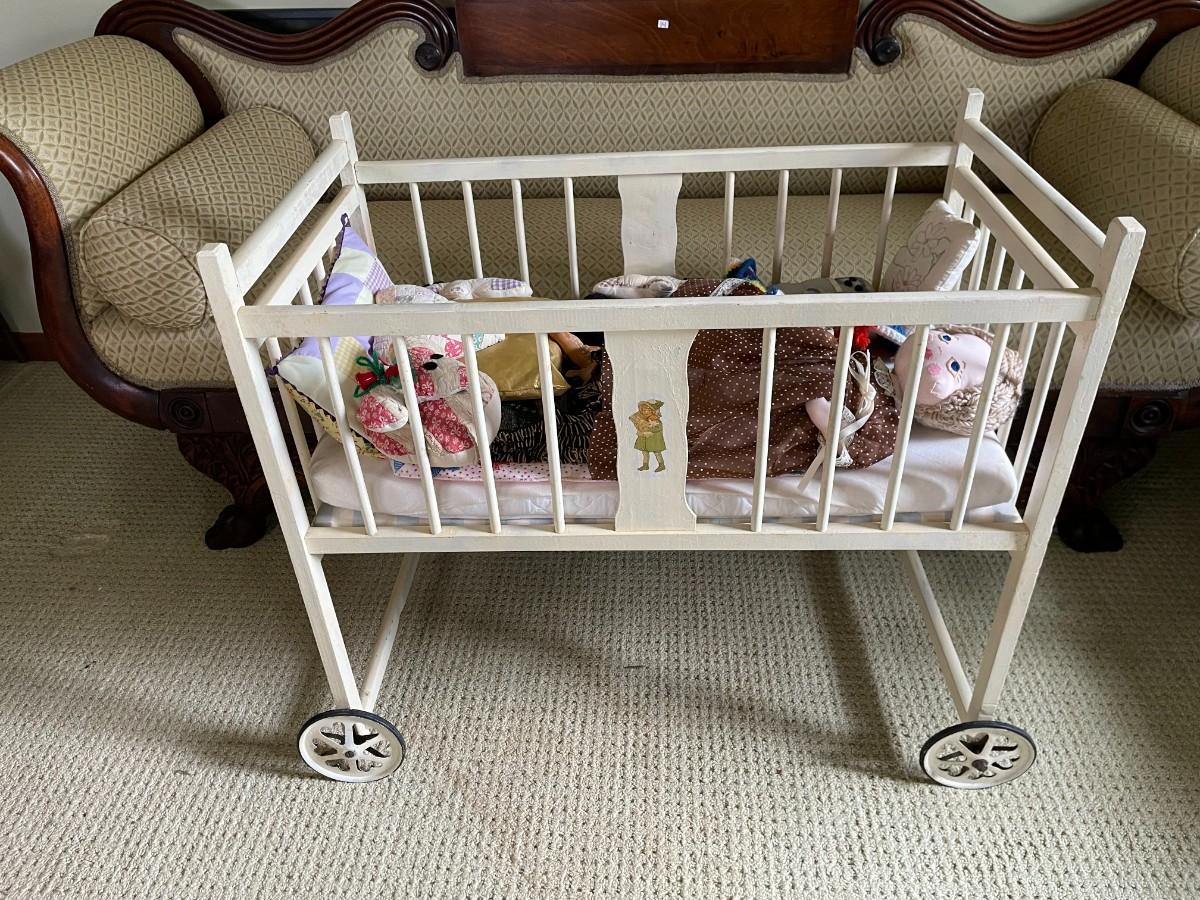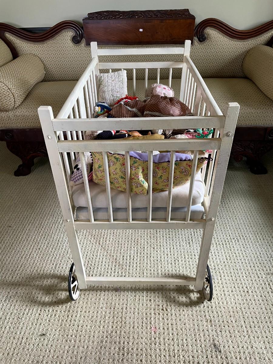 Vintage Baby Crib with Wheels with Vintage Dolls/Toys