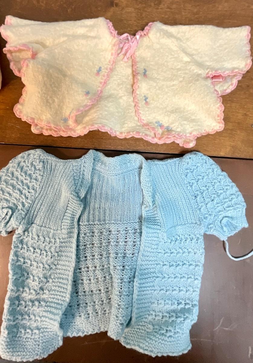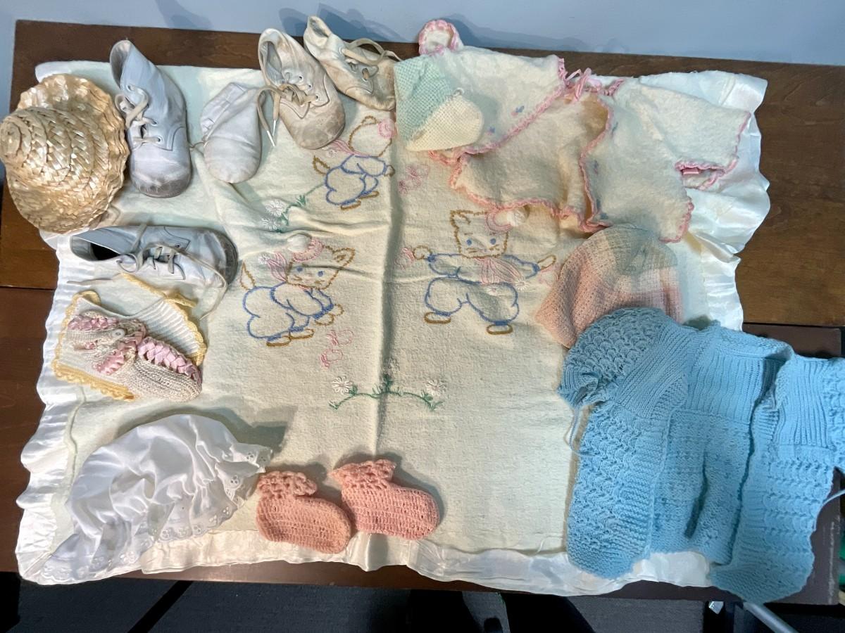 VIntage Baby Doll Clothes - Blanket, Bib, 2 Tops, Hats, Booties, & Shoes
