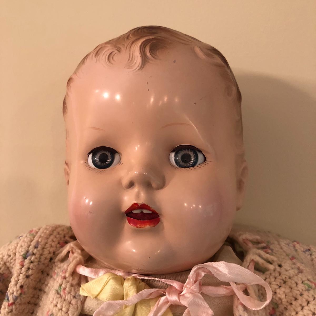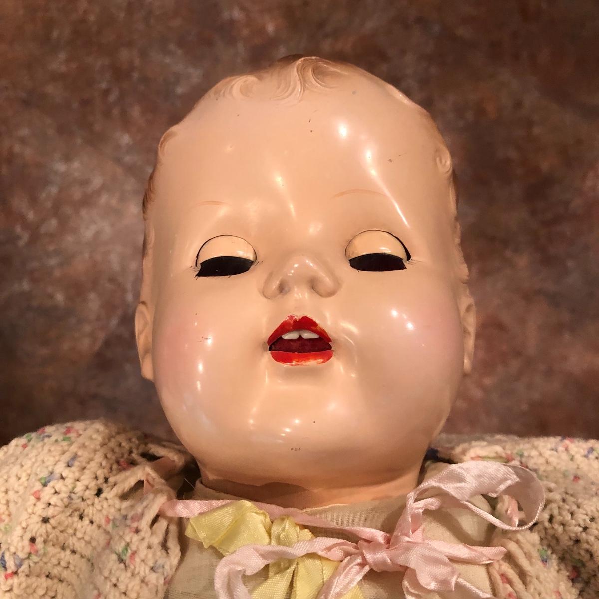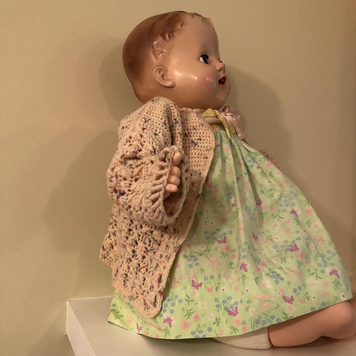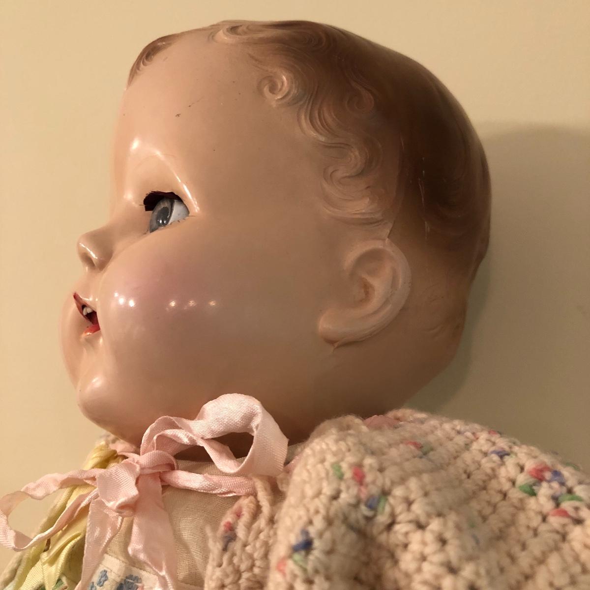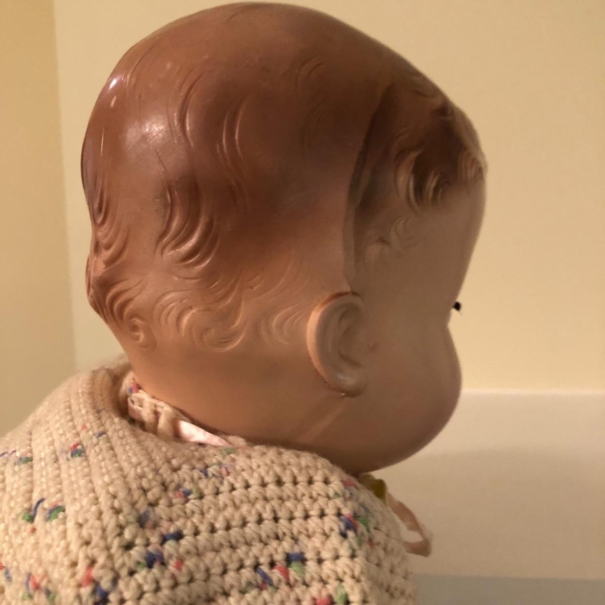 The doll has eyes that open/shut and has a plastic head with plastic like arms and legs. The body is a soft material with a hard plastic sound box inside. The baby’s jacket is crocheted. There is a stamp on the back of her neck which appears to be “650” backwards. She does make a faint noise when moved. The baby measures 16” in a sitting position. Shipping Available.