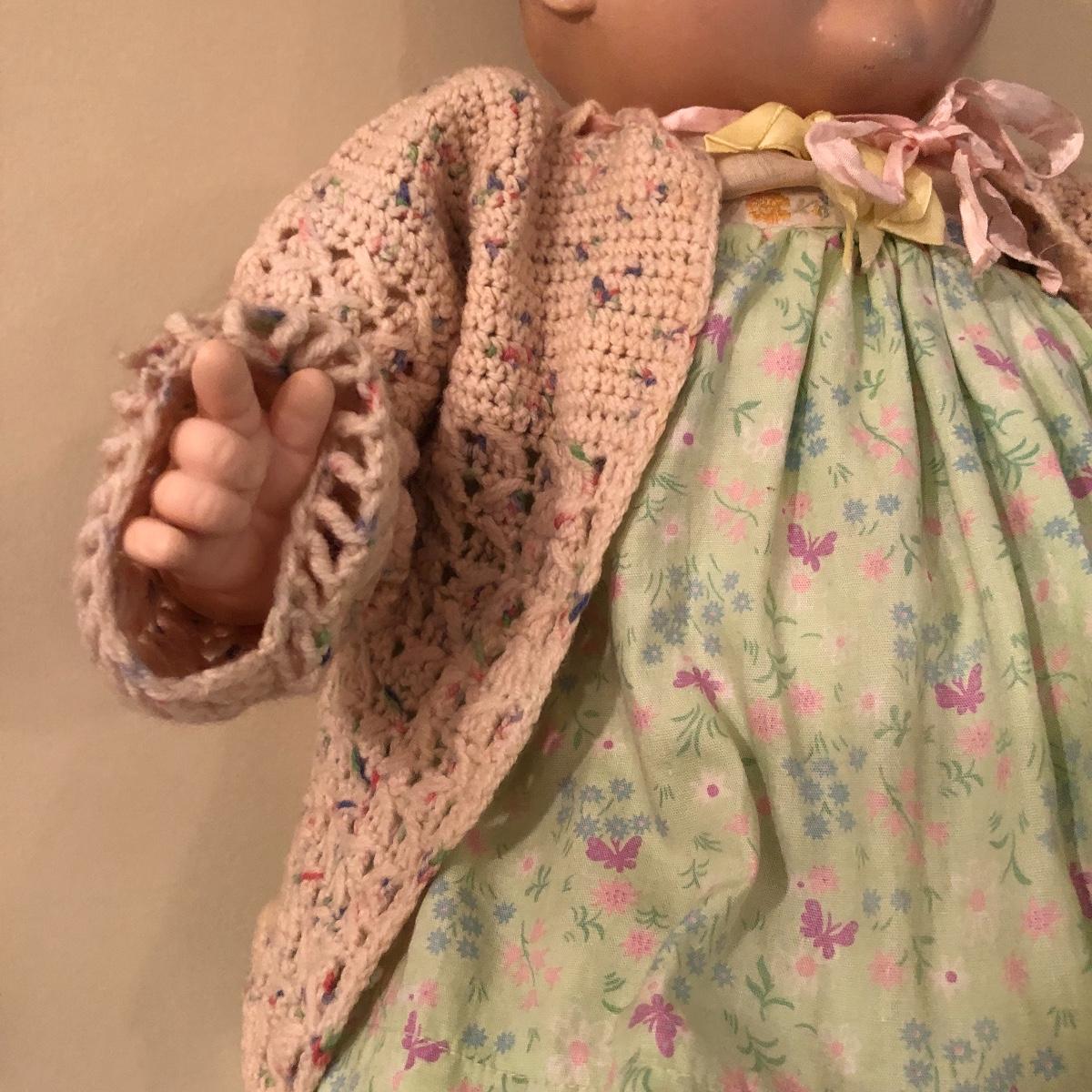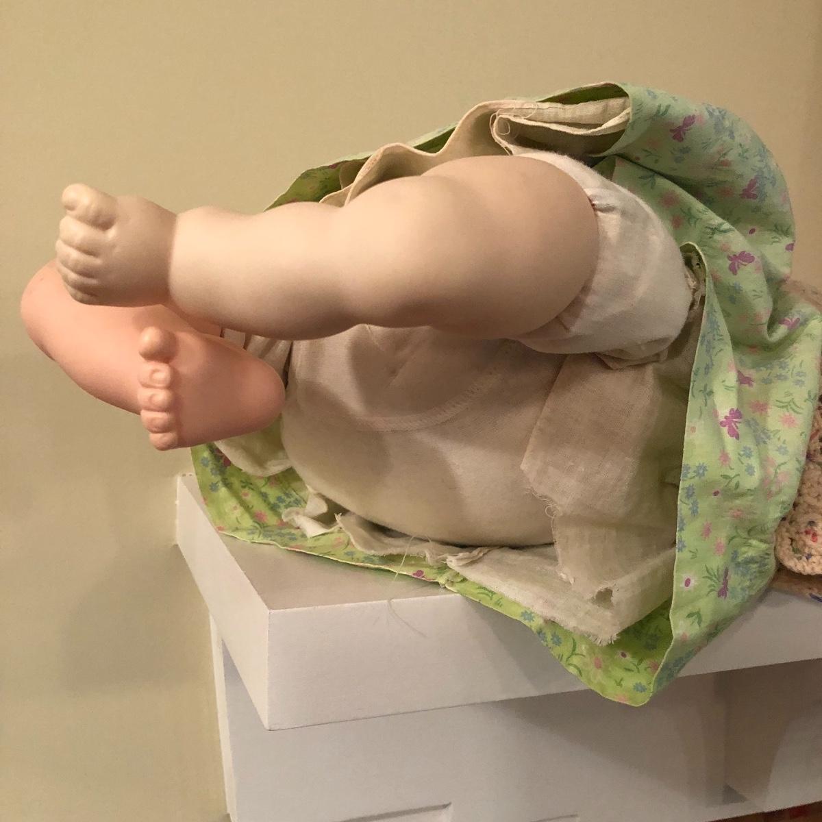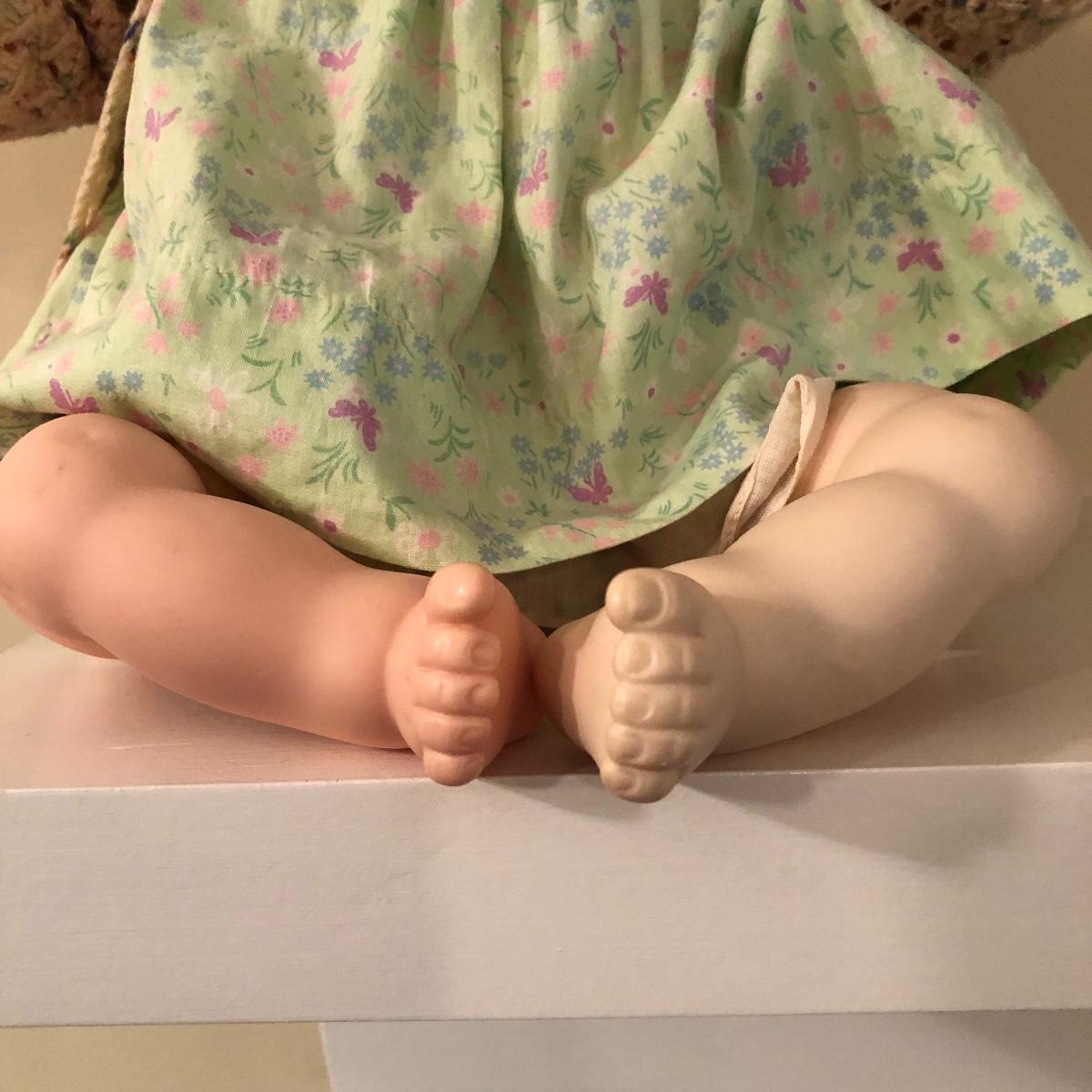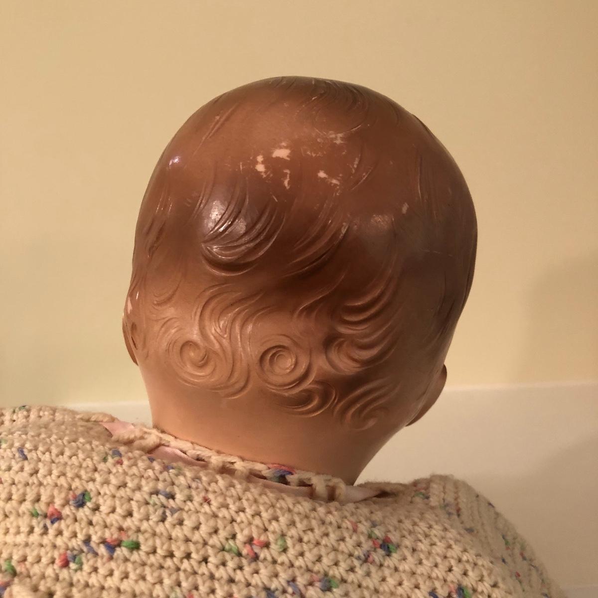 The doll has eyes that open/shut and has a plastic head with plastic like arms and legs. The body is a soft material with a hard plastic sound box inside. The baby’s jacket is crocheted. There is a stamp on the back of her neck which appears to be “650” backwards. She does make a faint noise when moved. The baby measures 16” in a sitting position. Shipping Available.