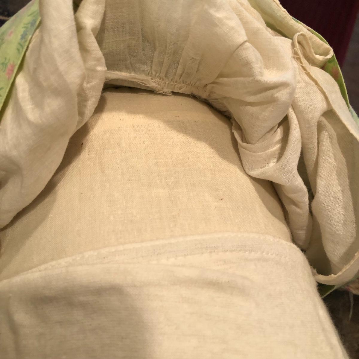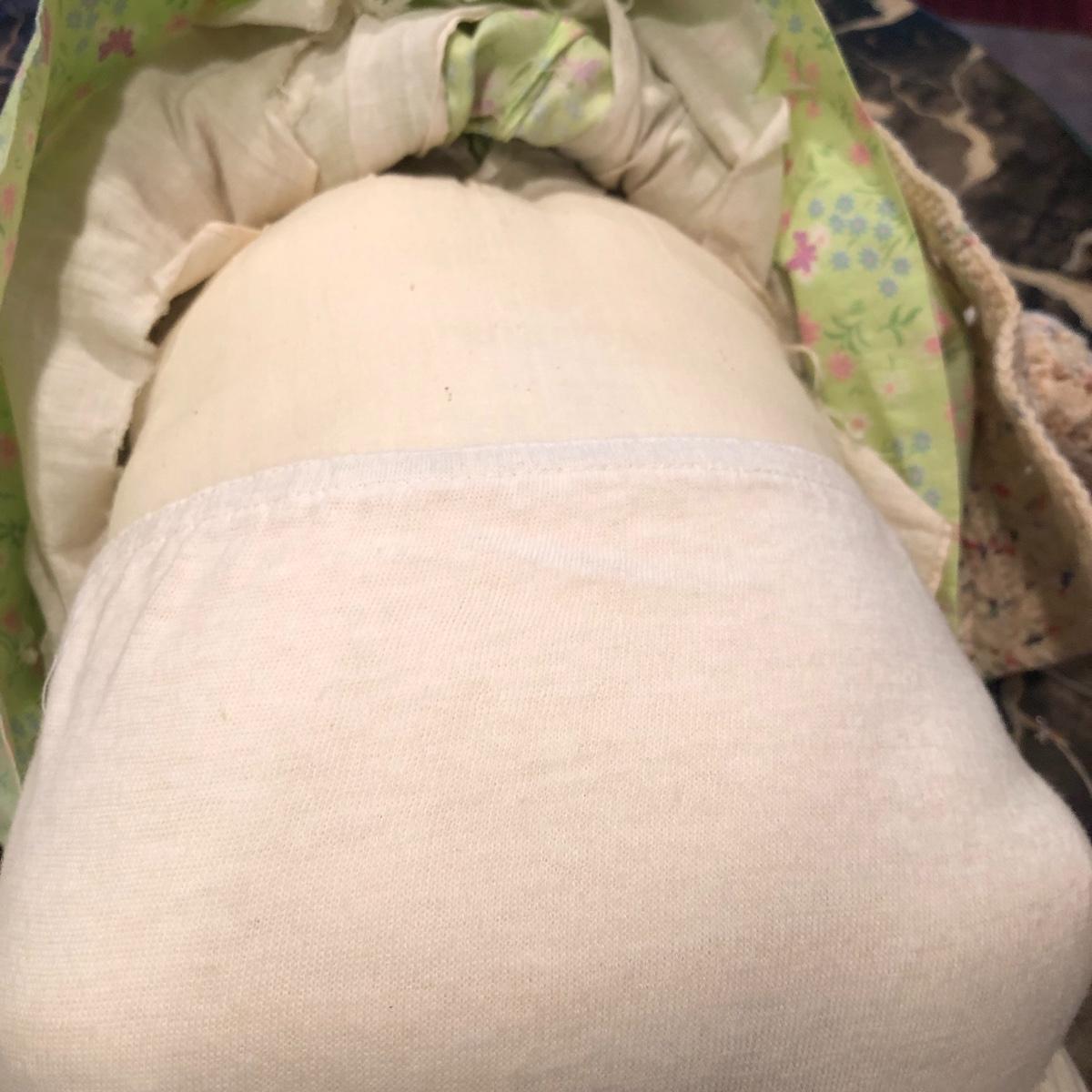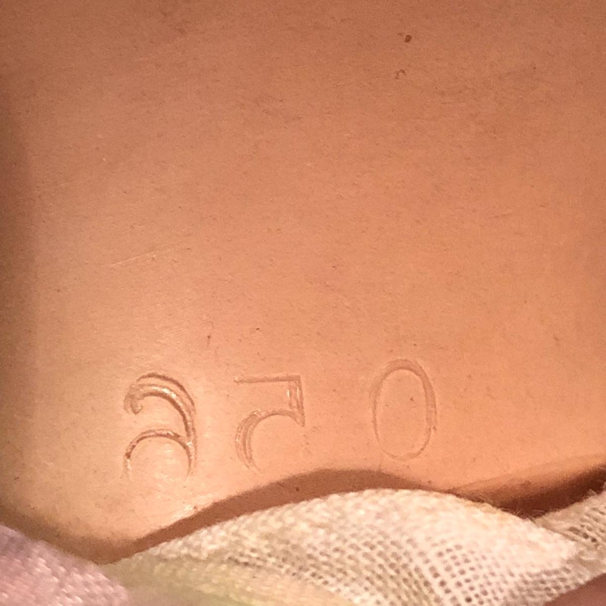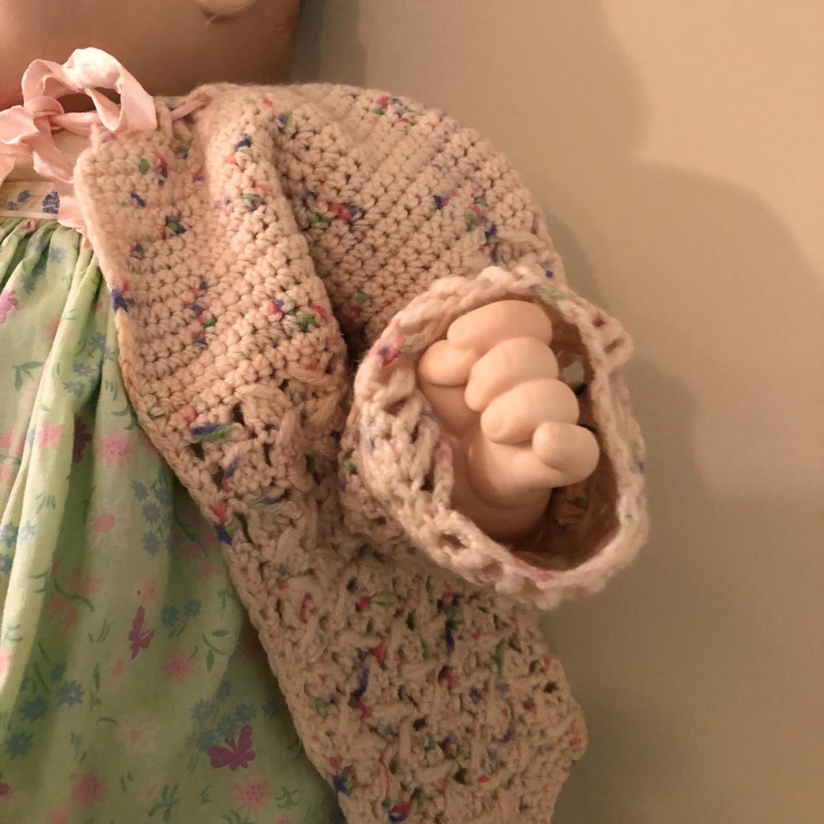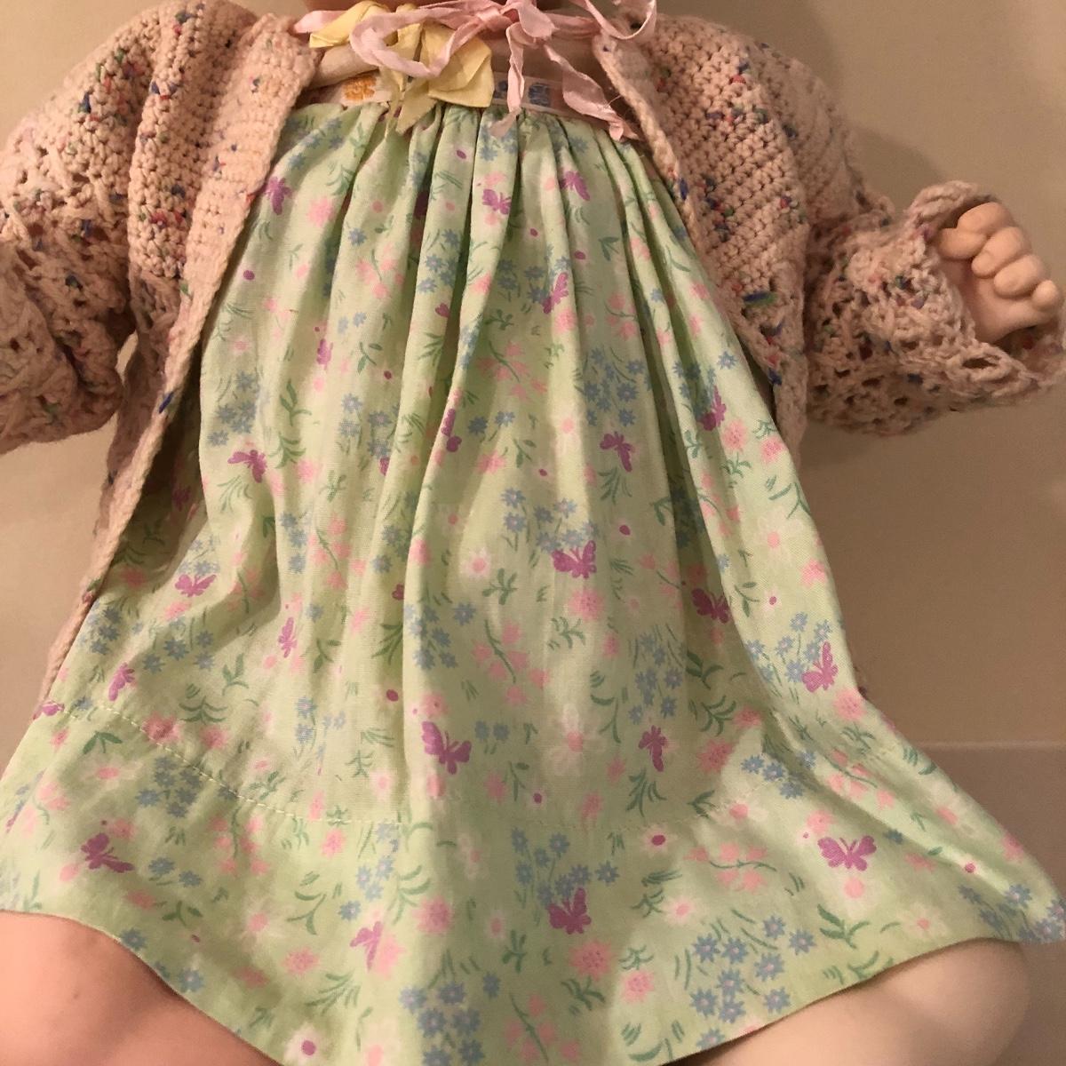 The doll has eyes that open/shut and has a plastic head with plastic like arms and legs. The body is a soft material with a hard plastic sound box inside. The baby’s jacket is crocheted. There is a stamp on the back of her neck which appears to be “650” backwards. She does make a faint noise when moved. The baby measures 16” in a sitting position. Shipping Available.