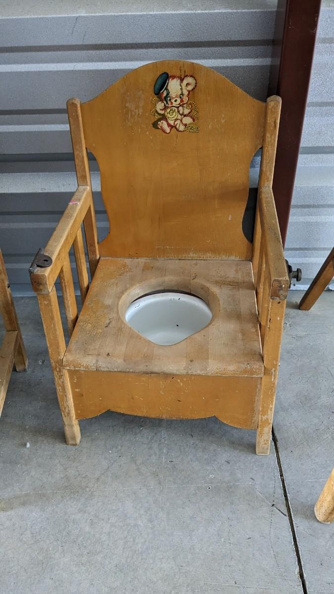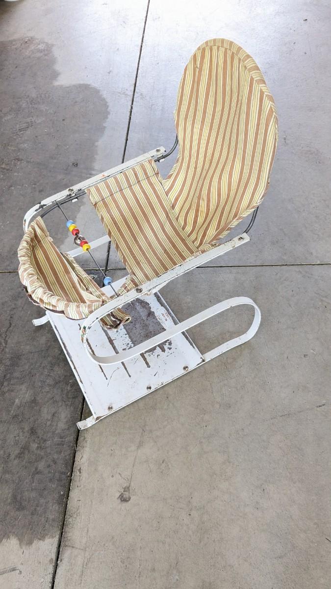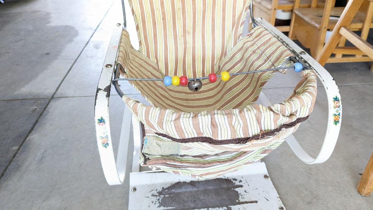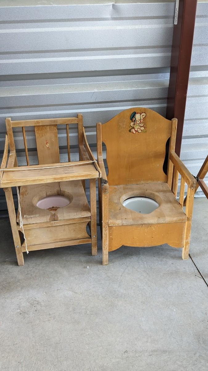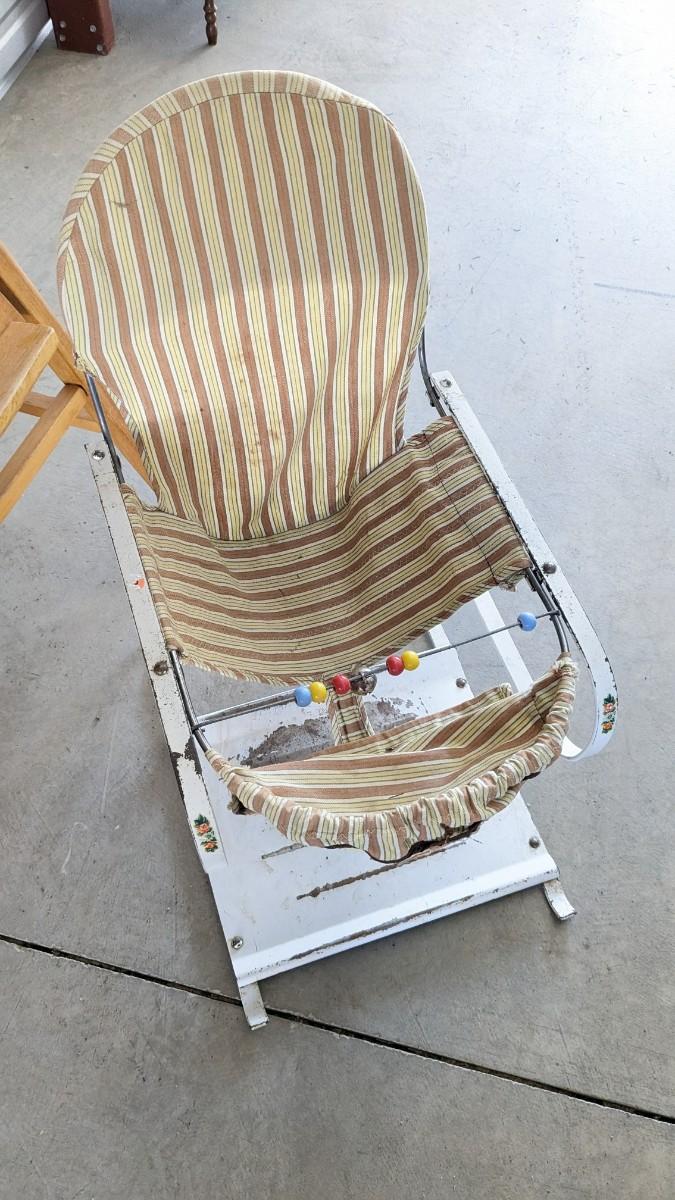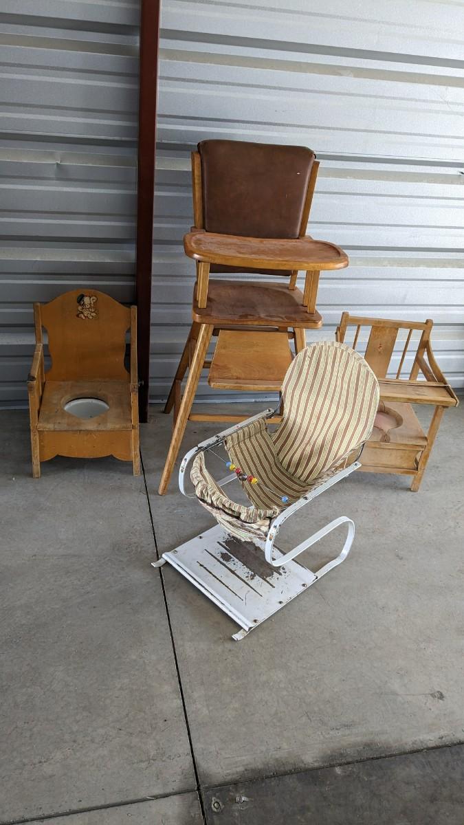 a lovely little array of vintage baby gear. Includes 2 potty training chairs with enamel pans. A beautiful solid wood and leather seat high chair, and the original bouncer with original toy. Wear noted to all pieces, but overall, they are in good shape with a ton of potential! No shipping. 2616
