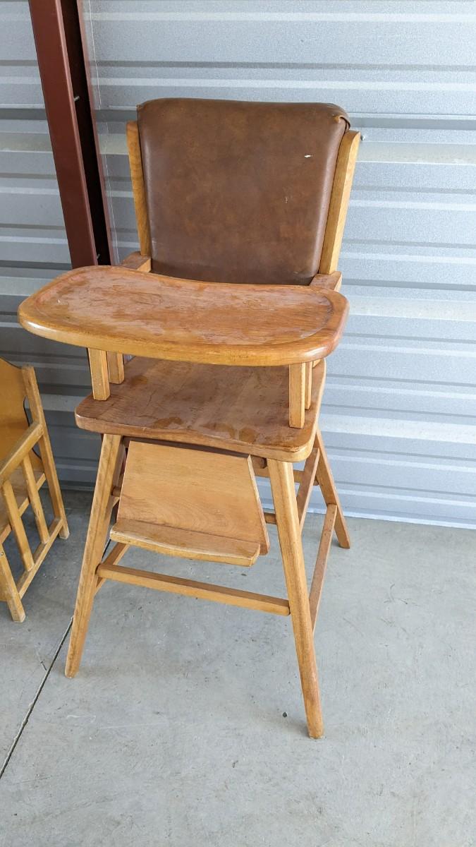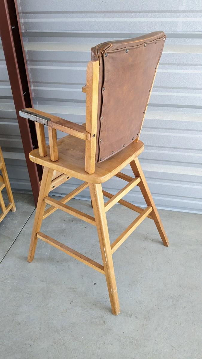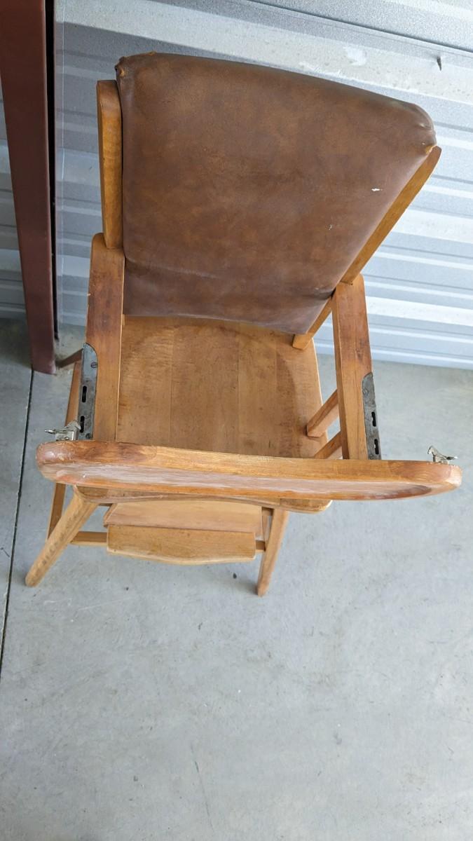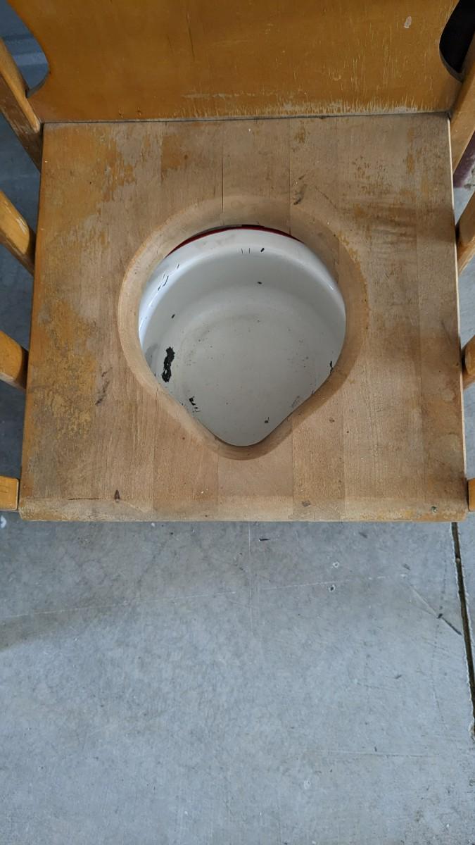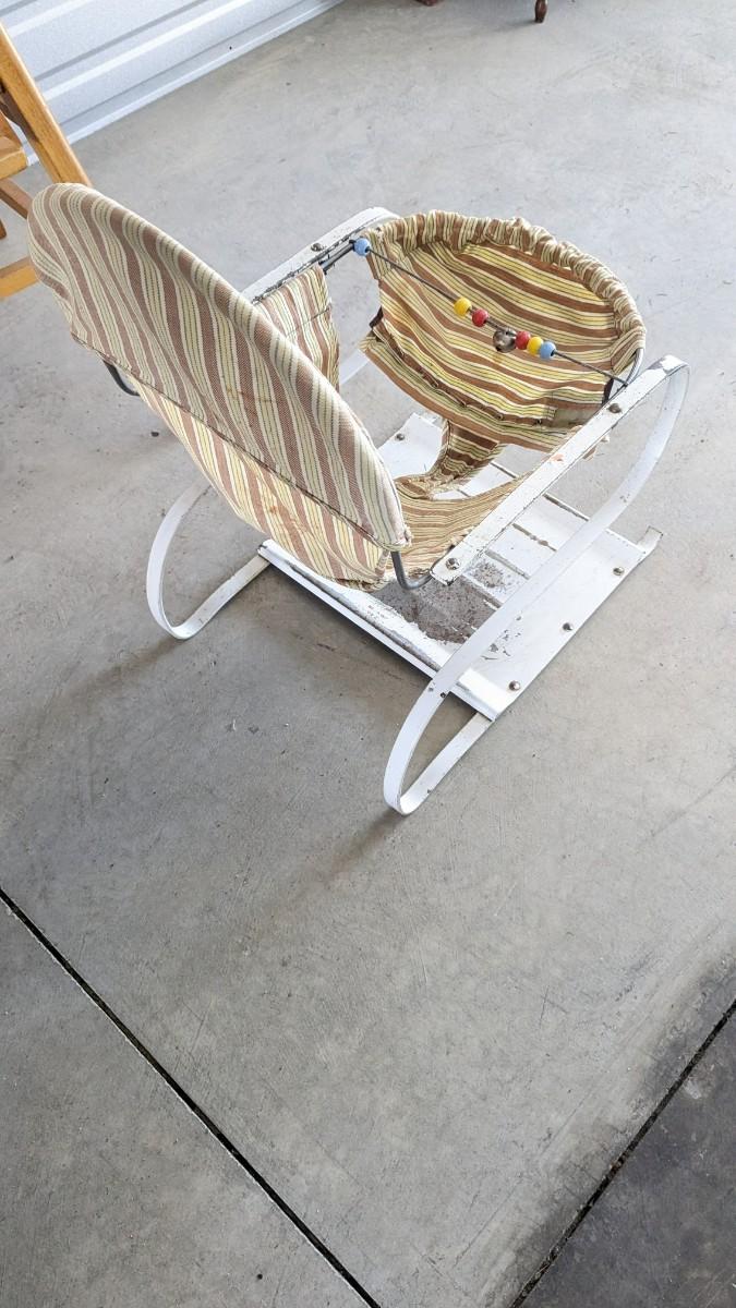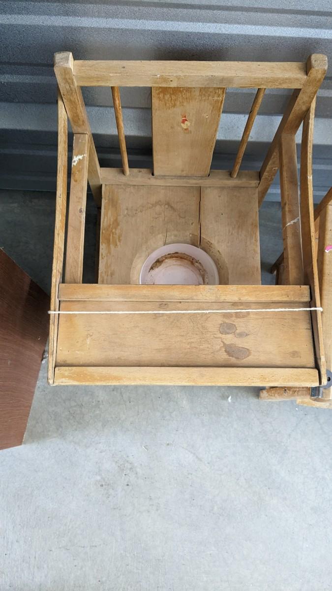 a lovely little array of vintage baby gear. Includes 2 potty training chairs with enamel pans. A beautiful solid wood and leather seat high chair, and the original bouncer with original toy. Wear noted to all pieces, but overall, they are in good shape with a ton of potential! No shipping. 2616