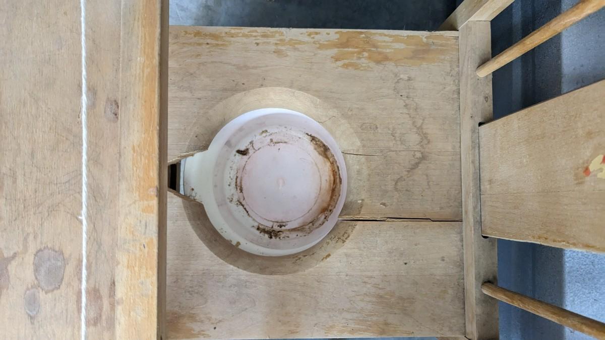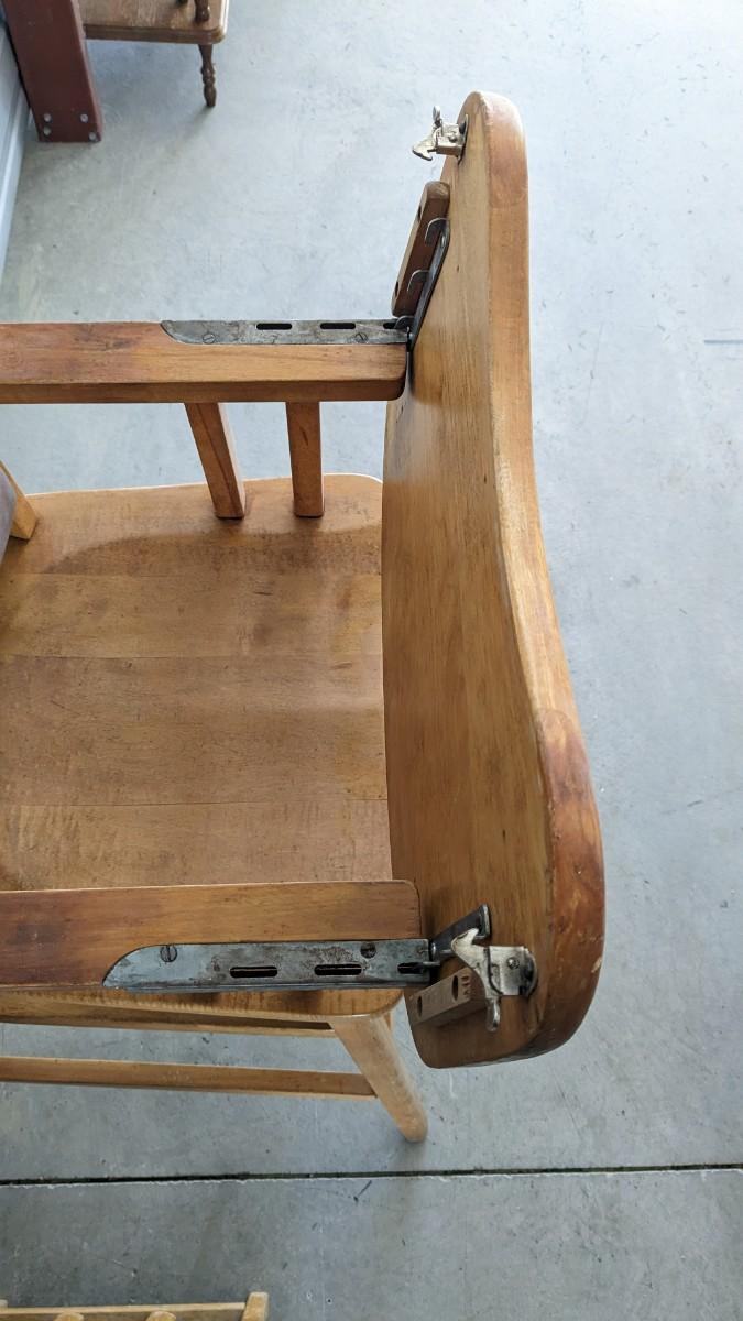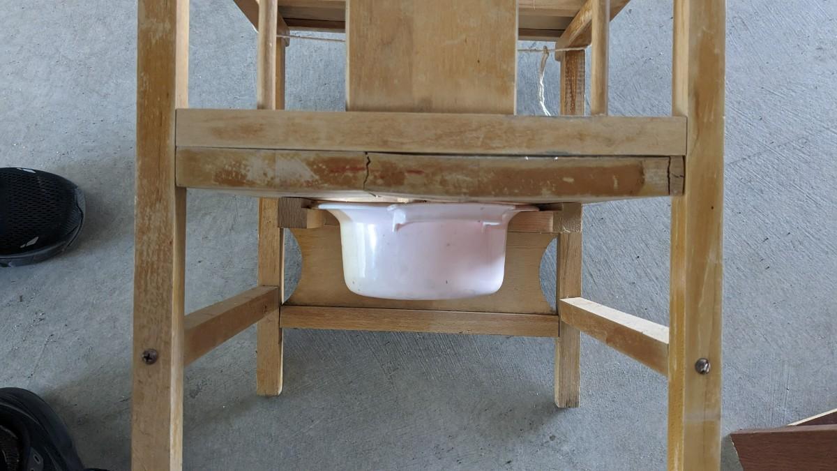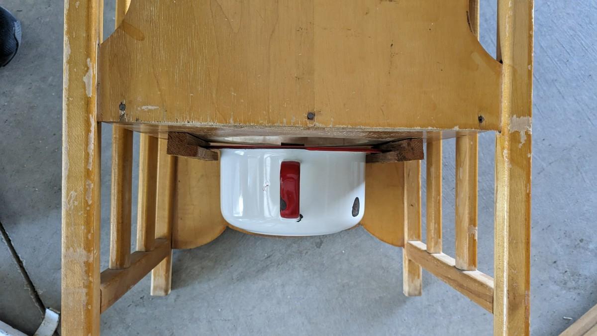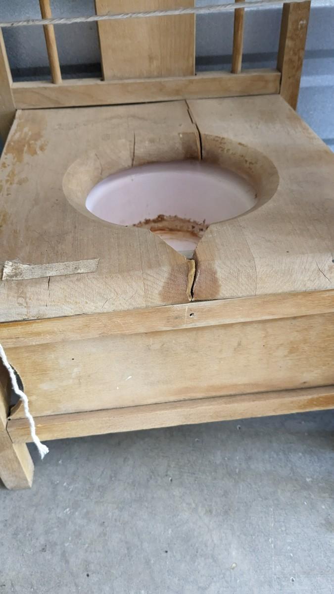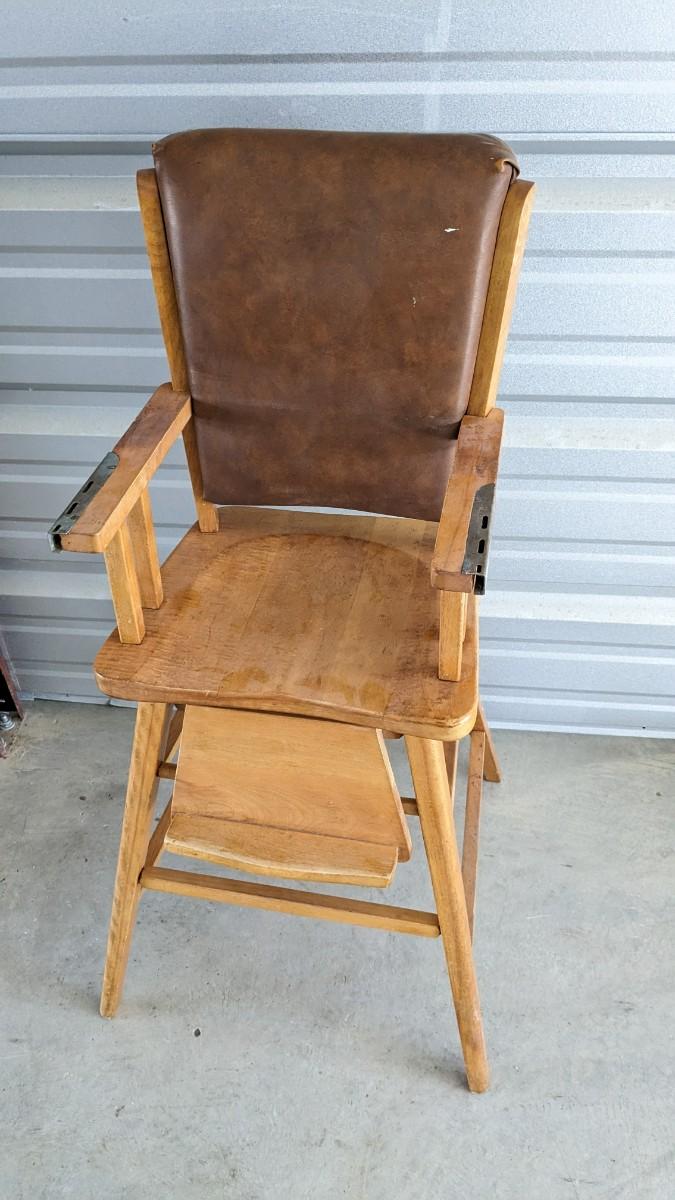 a lovely little array of vintage baby gear. Includes 2 potty training chairs with enamel pans. A beautiful solid wood and leather seat high chair, and the original bouncer with original toy. Wear noted to all pieces, but overall, they are in good shape with a ton of potential! No shipping. 2616