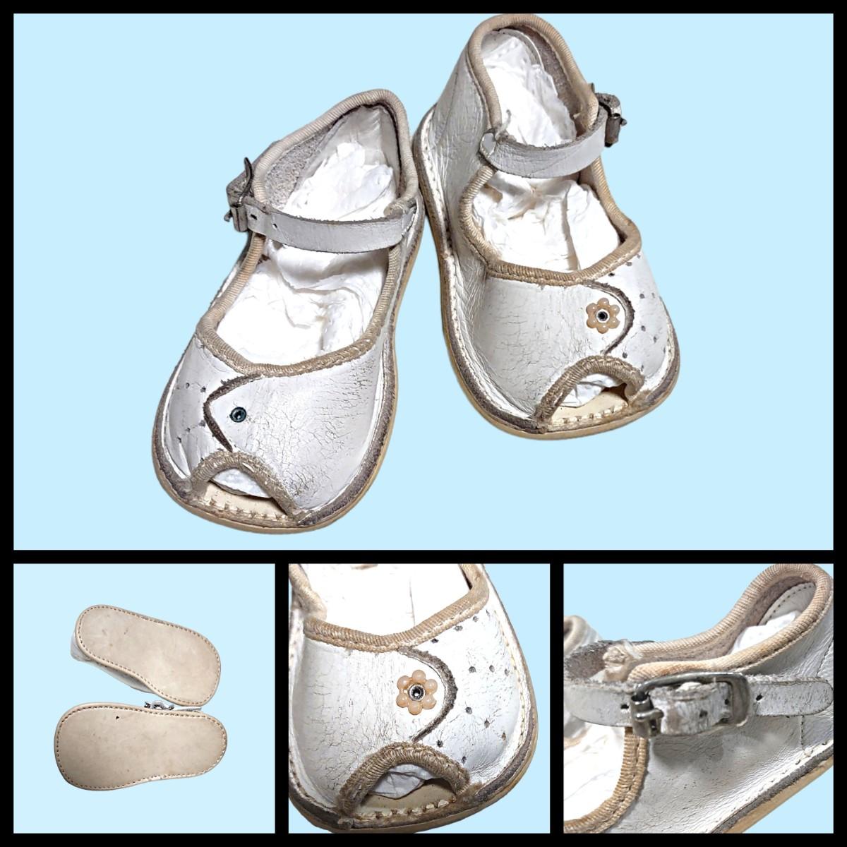 2. White Leather Baby Shoes w/ Floral Bead Detail (missing on ne shoe) & Buckles