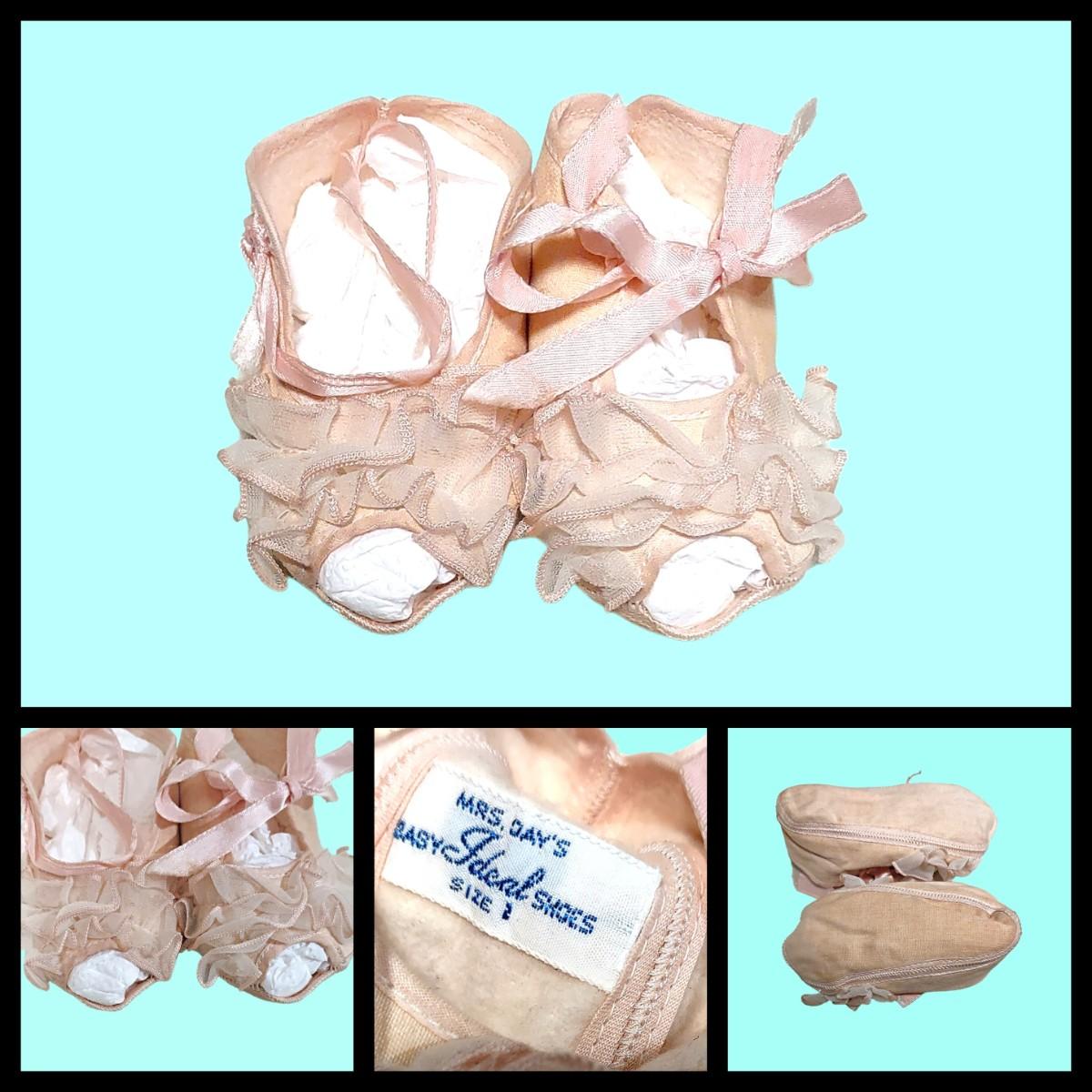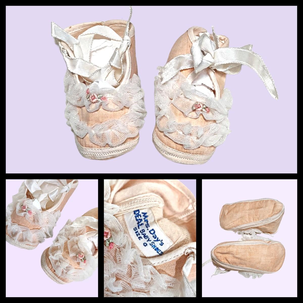 3. Mrs. Day's Pink Fabric Ideal Baby Shoes w/ lace, floral applique and white satin tie ribbons. Size 0