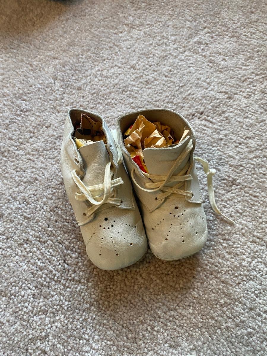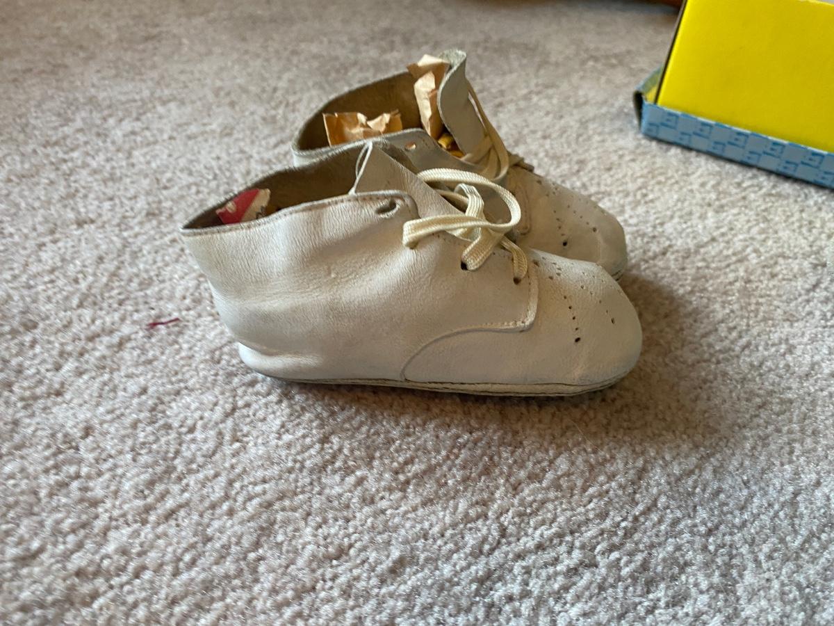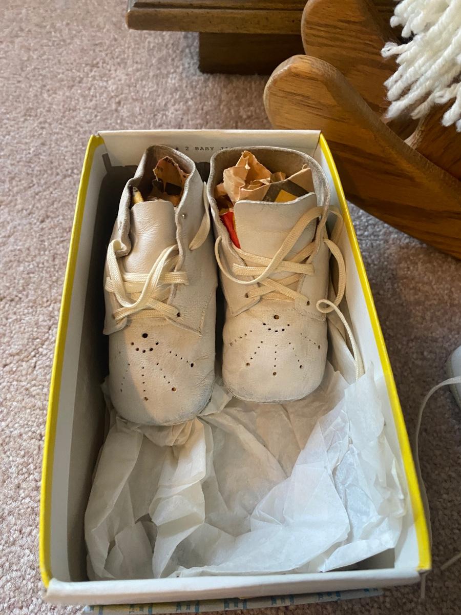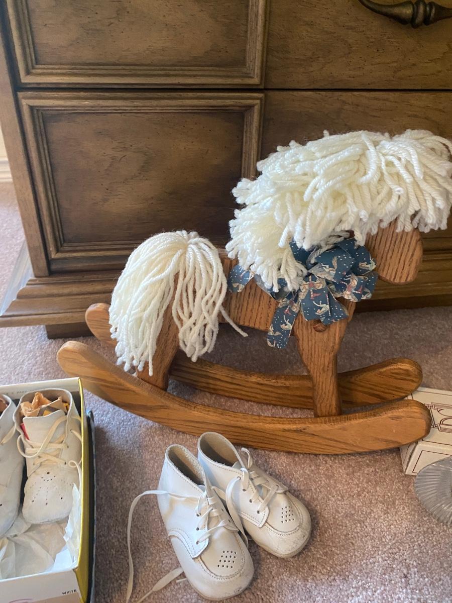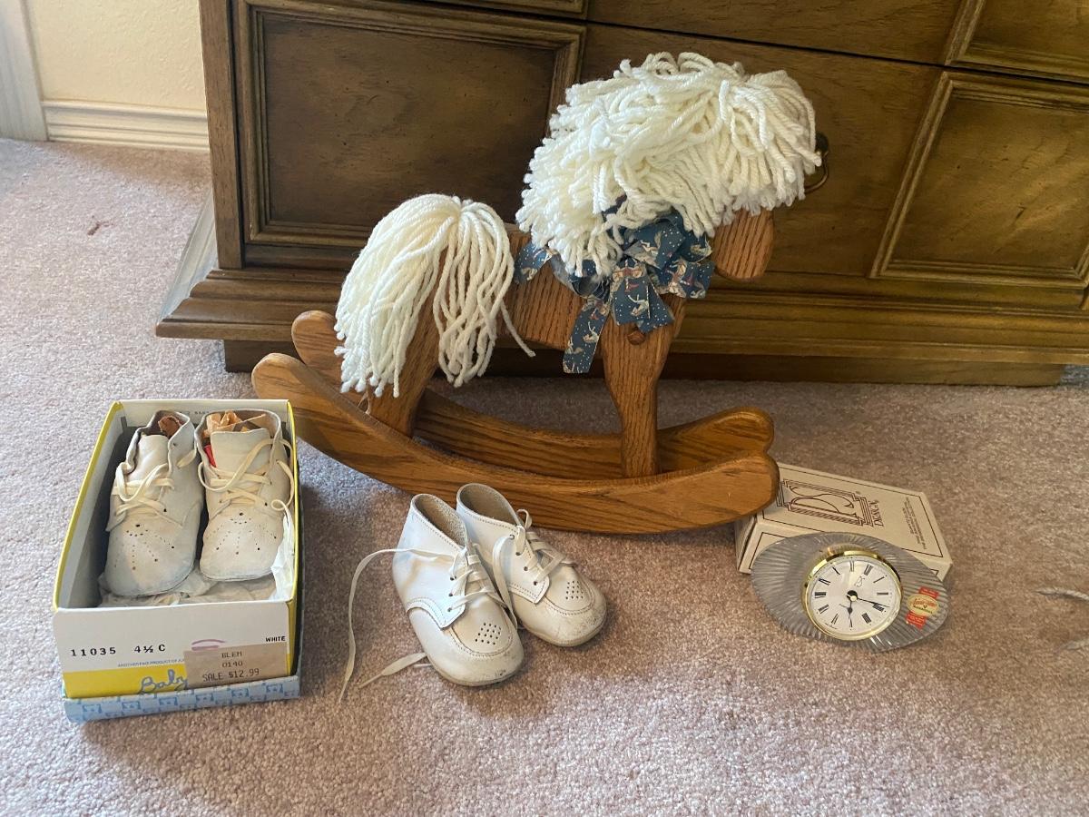 VINTAGE BABY SHOES, DECORATIVE ROCKING HORSE AND CLOCK