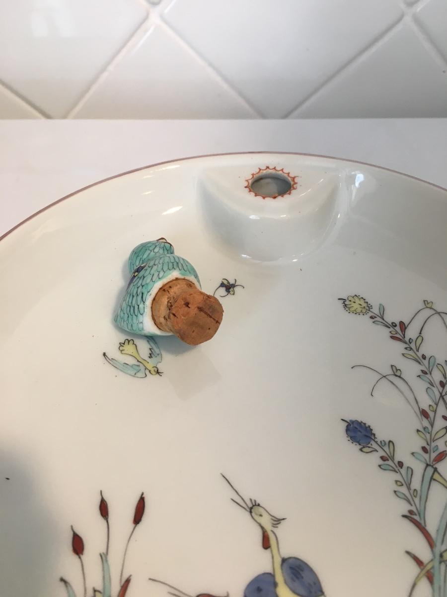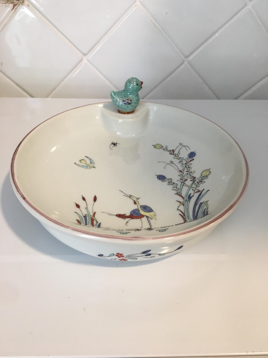 Small birdie keeps the warmth in this vintage bowl that keeps baby's food warm. Made in France.