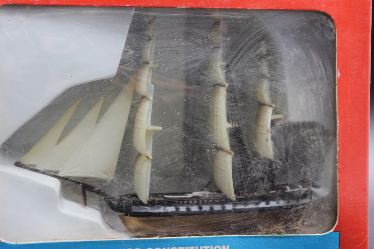 Vintage Bachmann Mini-Ships USS Constitution Vessel Ship Model, there is some vintage wear to the packaging and the plastic cover is coming off, but there is no other significant damage to the piece and is in good collectible condition. Check pictures for more details and for sizing.