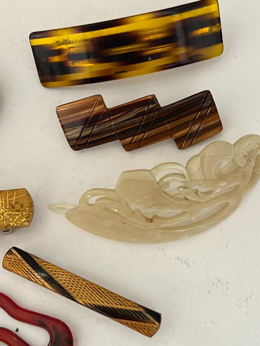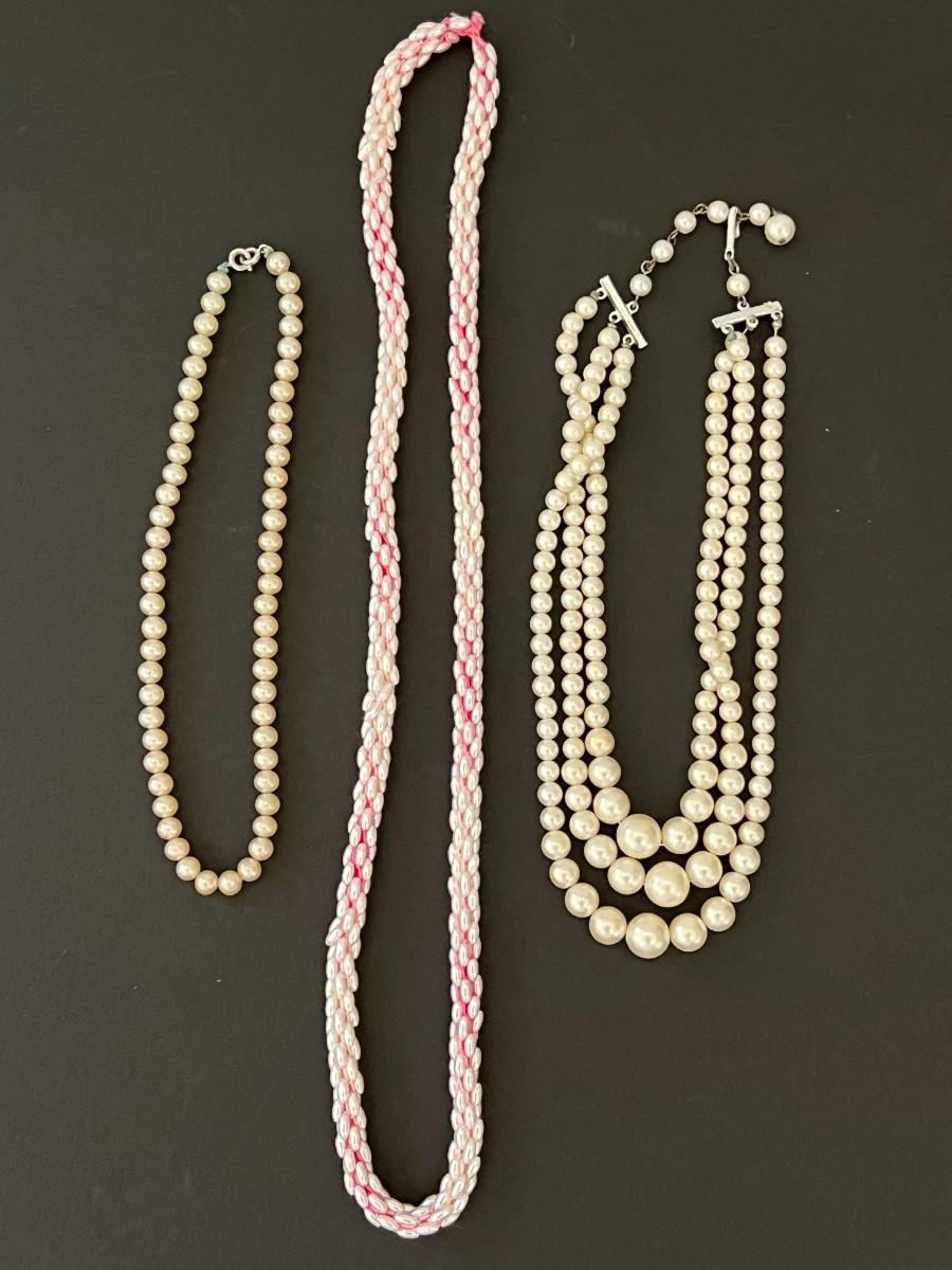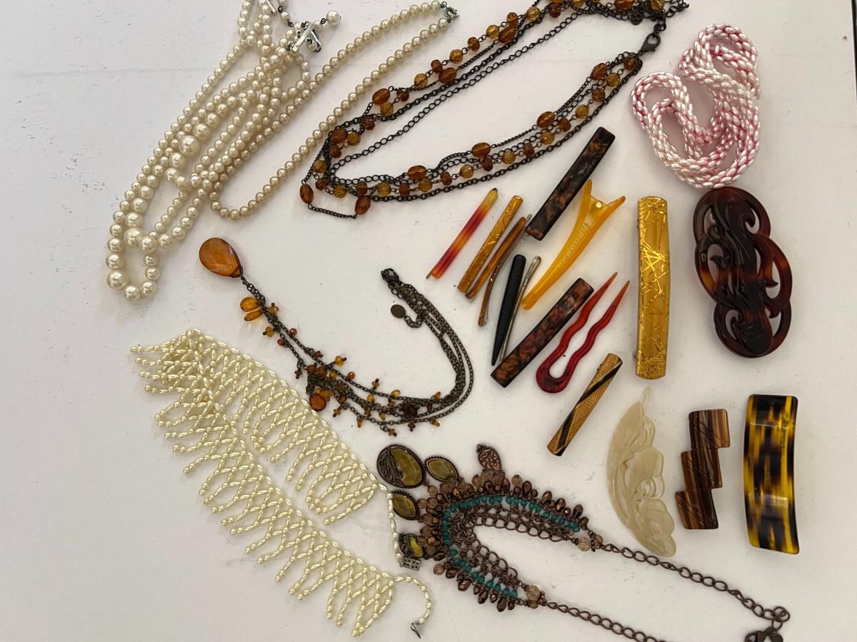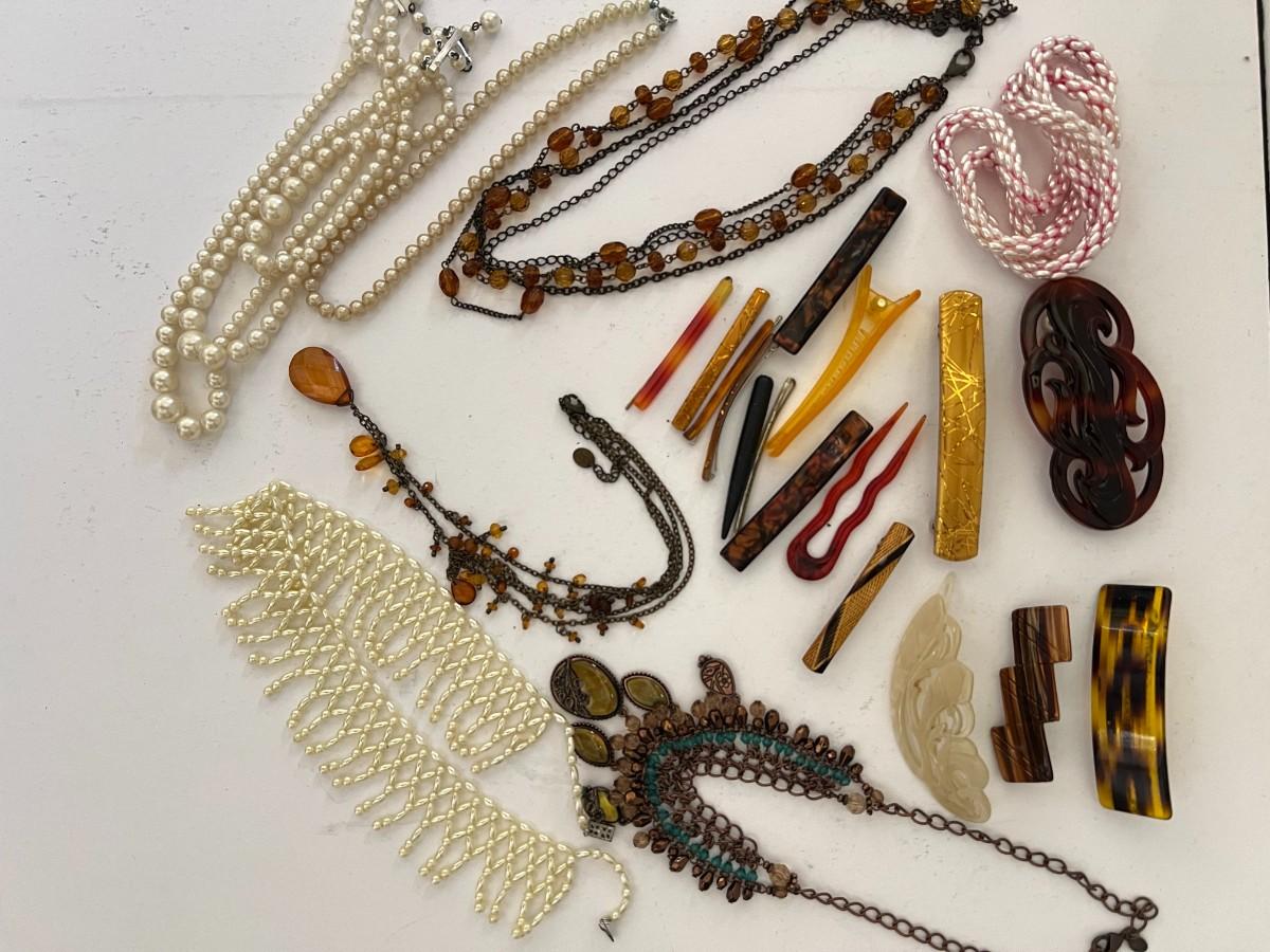 Mid century barrettes and vintage style necklaces. Range from 18" to 24". Some bakelite. Uncertain if genuine pearls. One piece is a pearl style collar.
