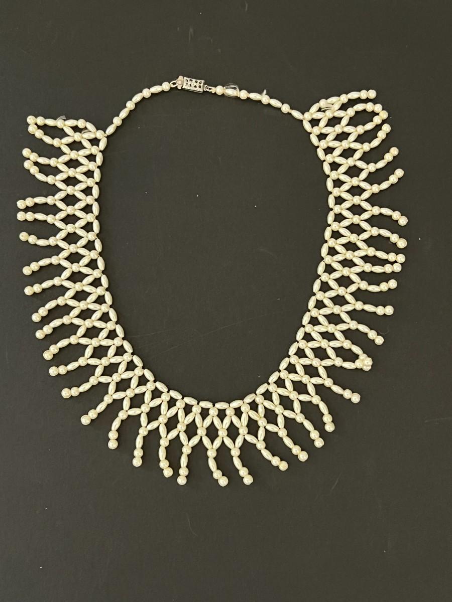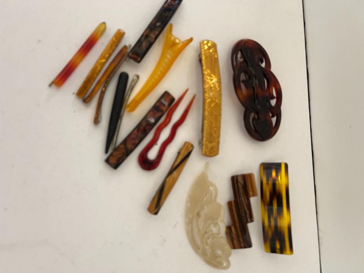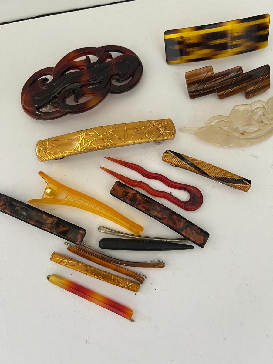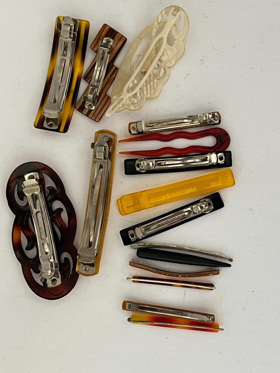 Mid century barrettes and vintage style necklaces. Range from 18" to 24". Some bakelite. Uncertain if genuine pearls. One piece is a pearl style collar.