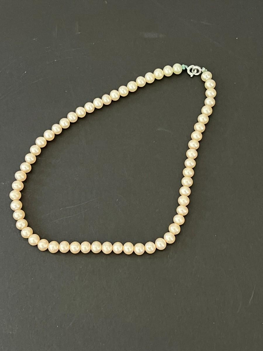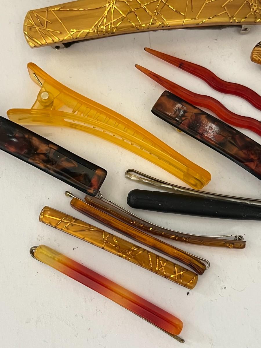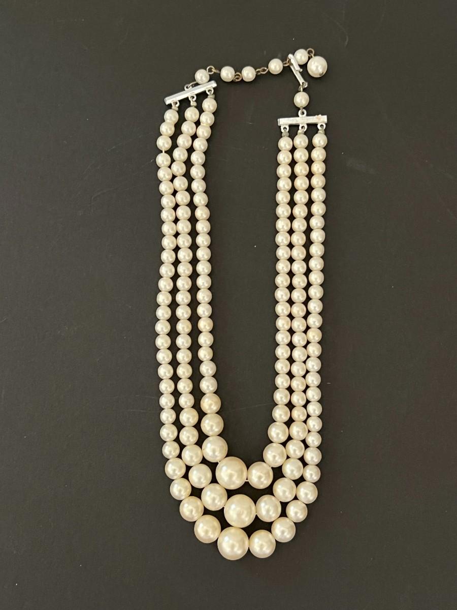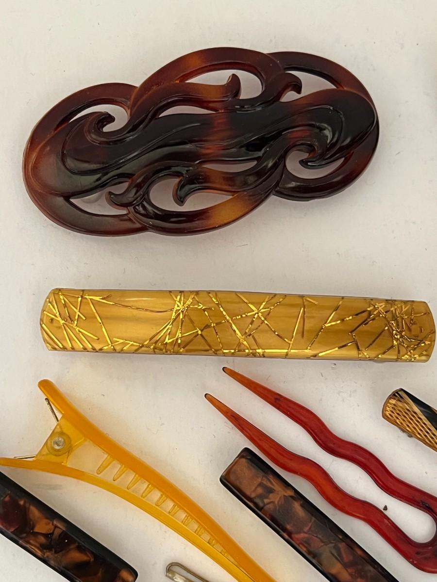 Mid century barrettes and vintage style necklaces. Range from 18" to 24". Some bakelite. Uncertain if genuine pearls. One piece is a pearl style collar.