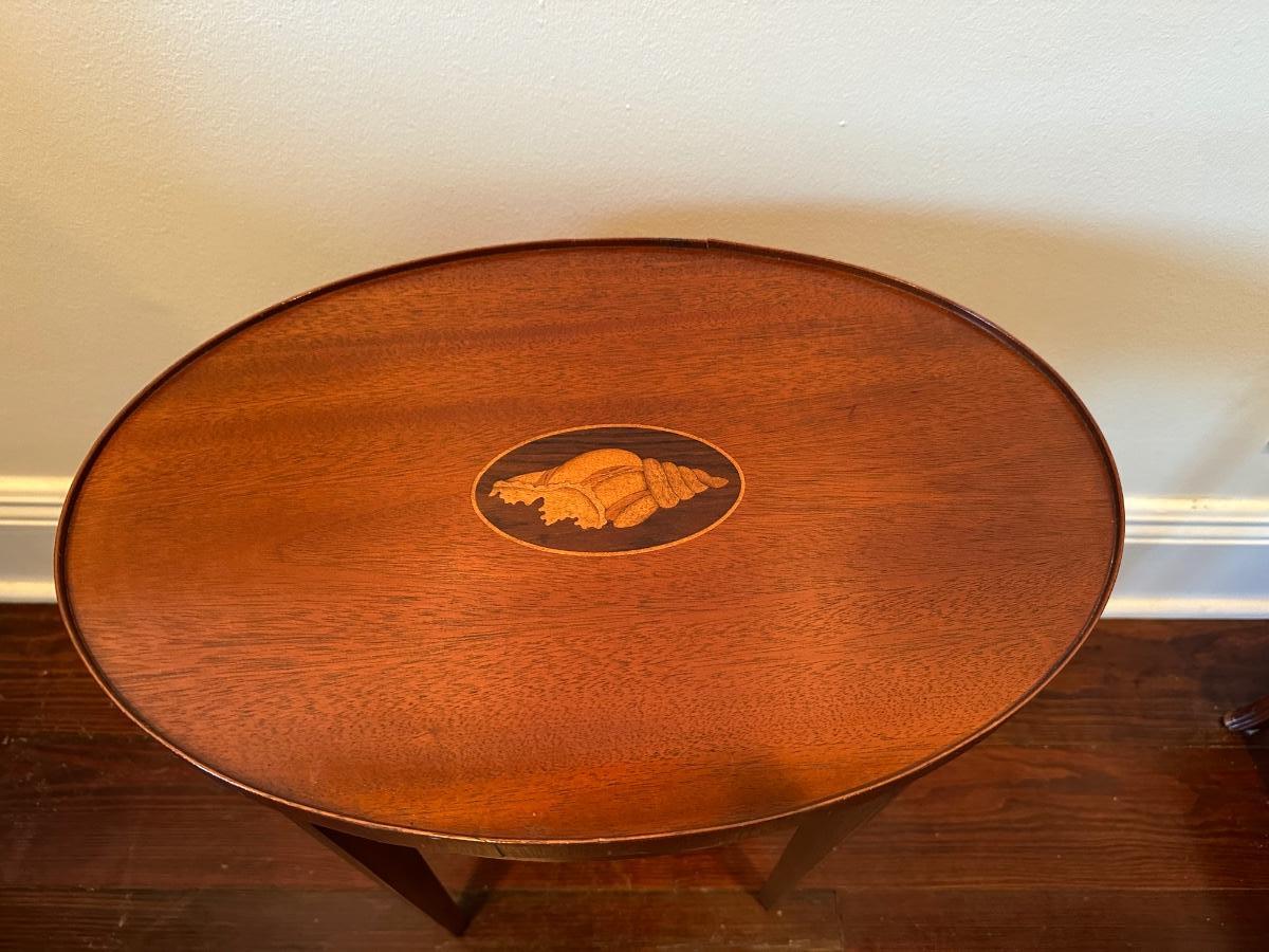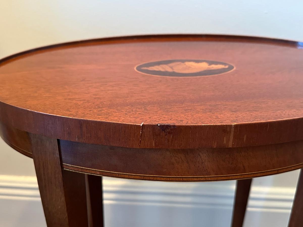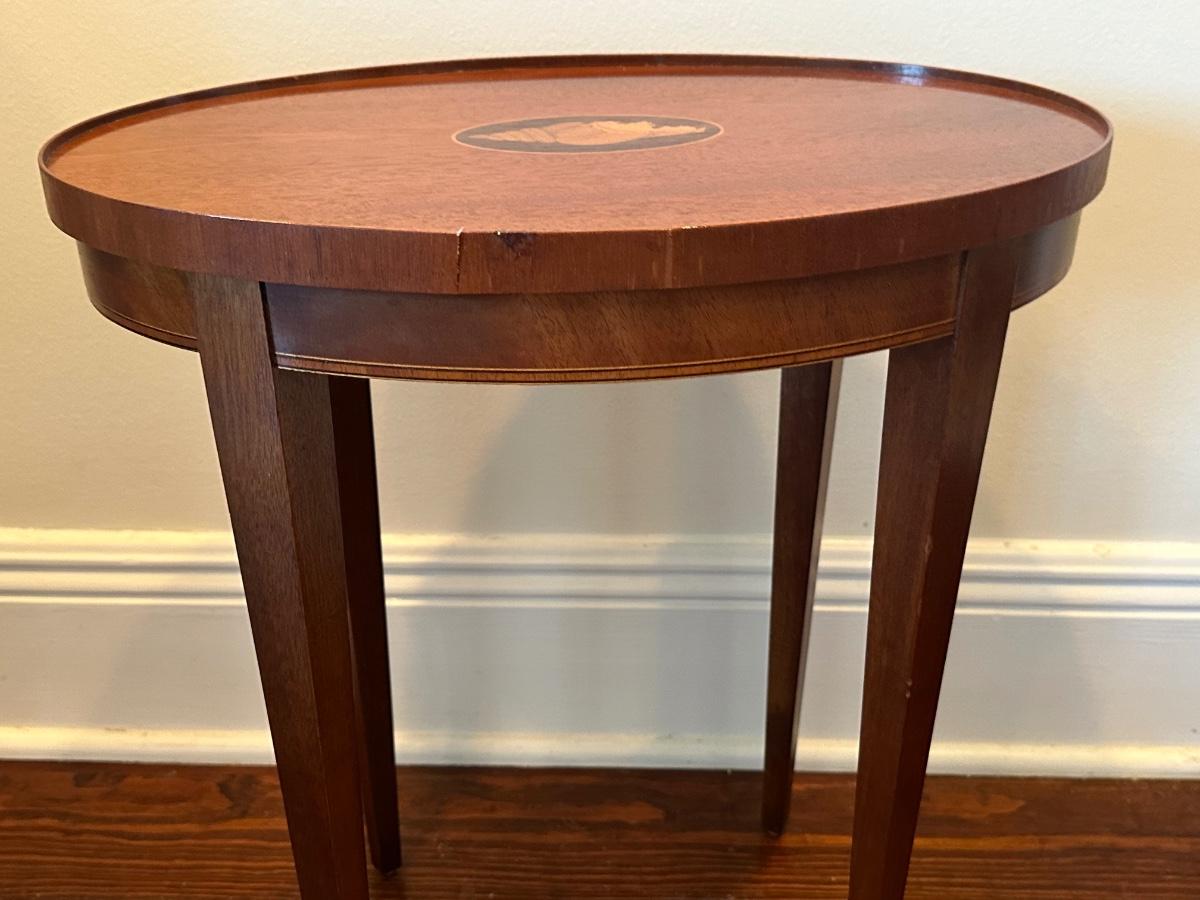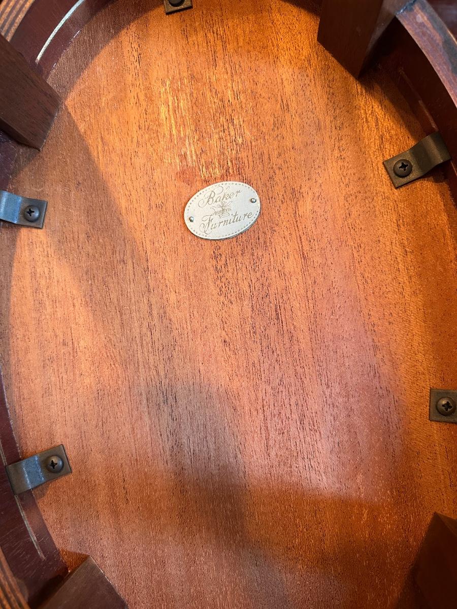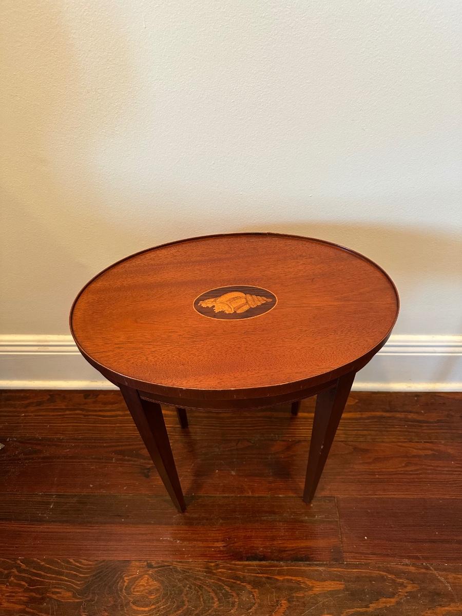 Vintage Baker Furniture Mahogany Wood Shell Inlay Side Table. Small veneer split/chip on the rim, as shown.