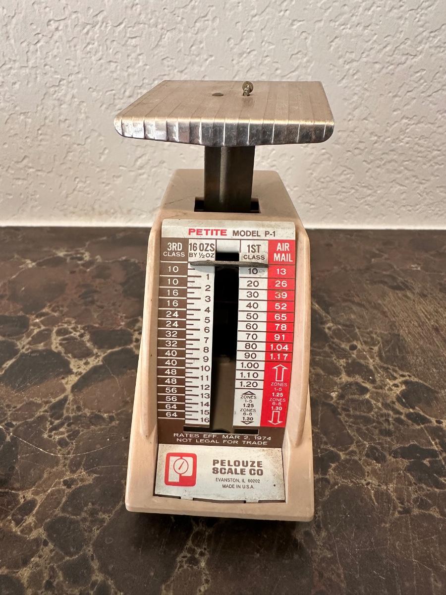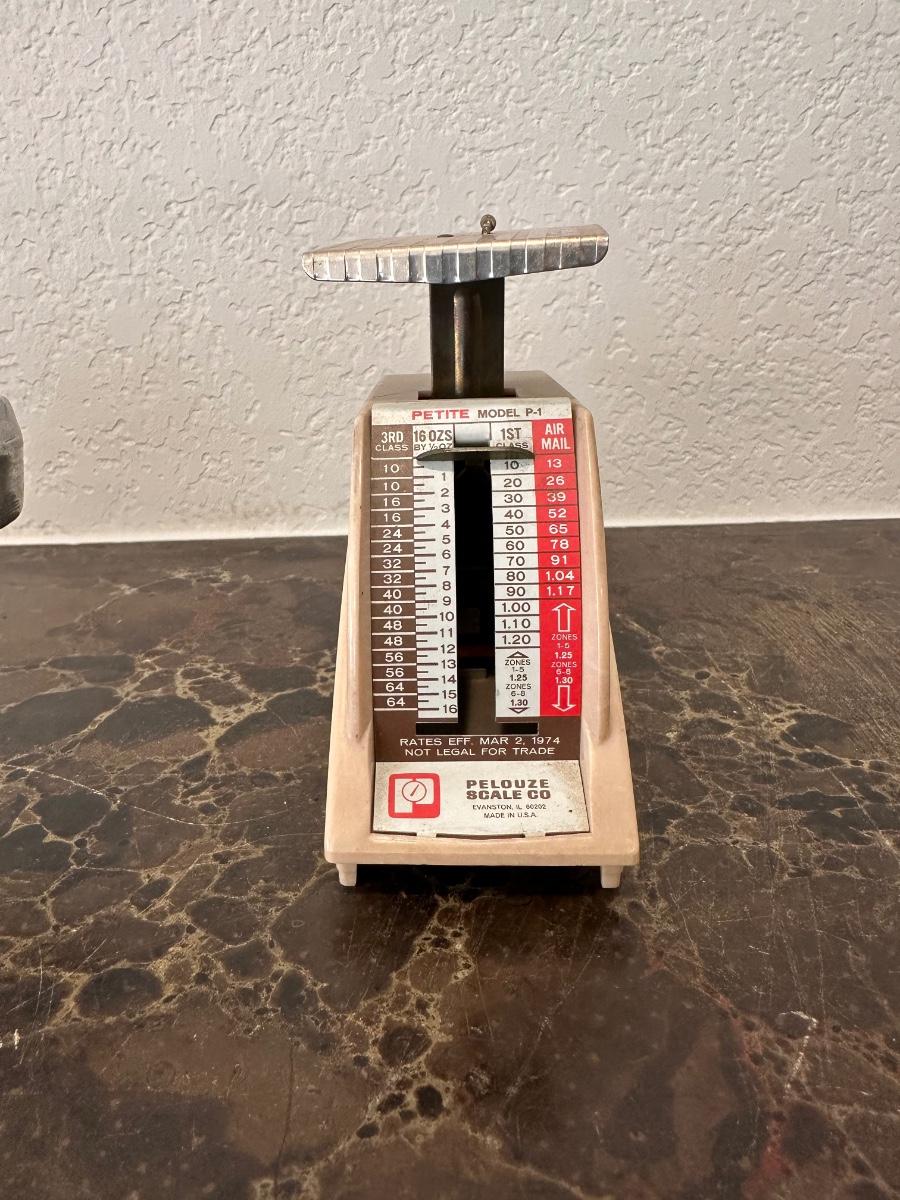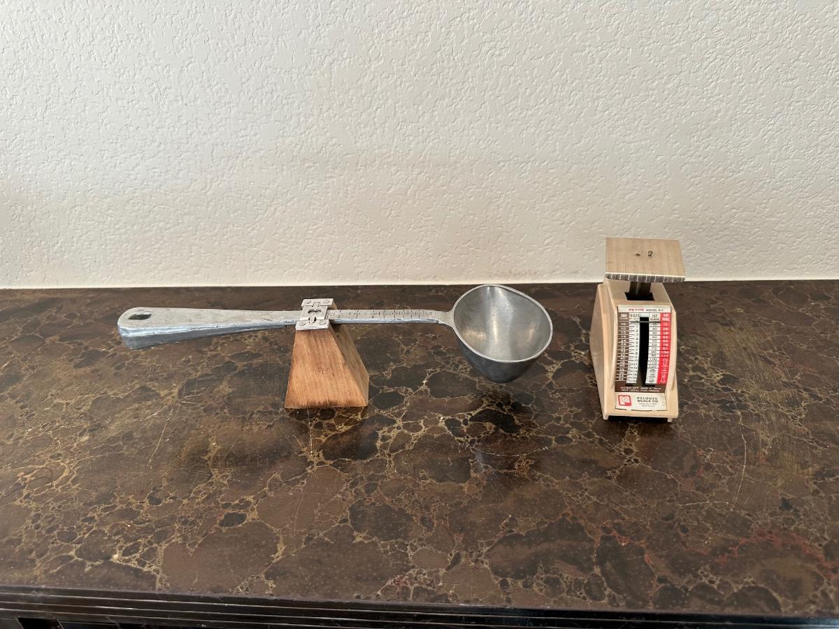 VINTAGE BALANCE MEASURING SPOON AND PELOUZE PETITE MODEL P-1 POSTAGE SCALE