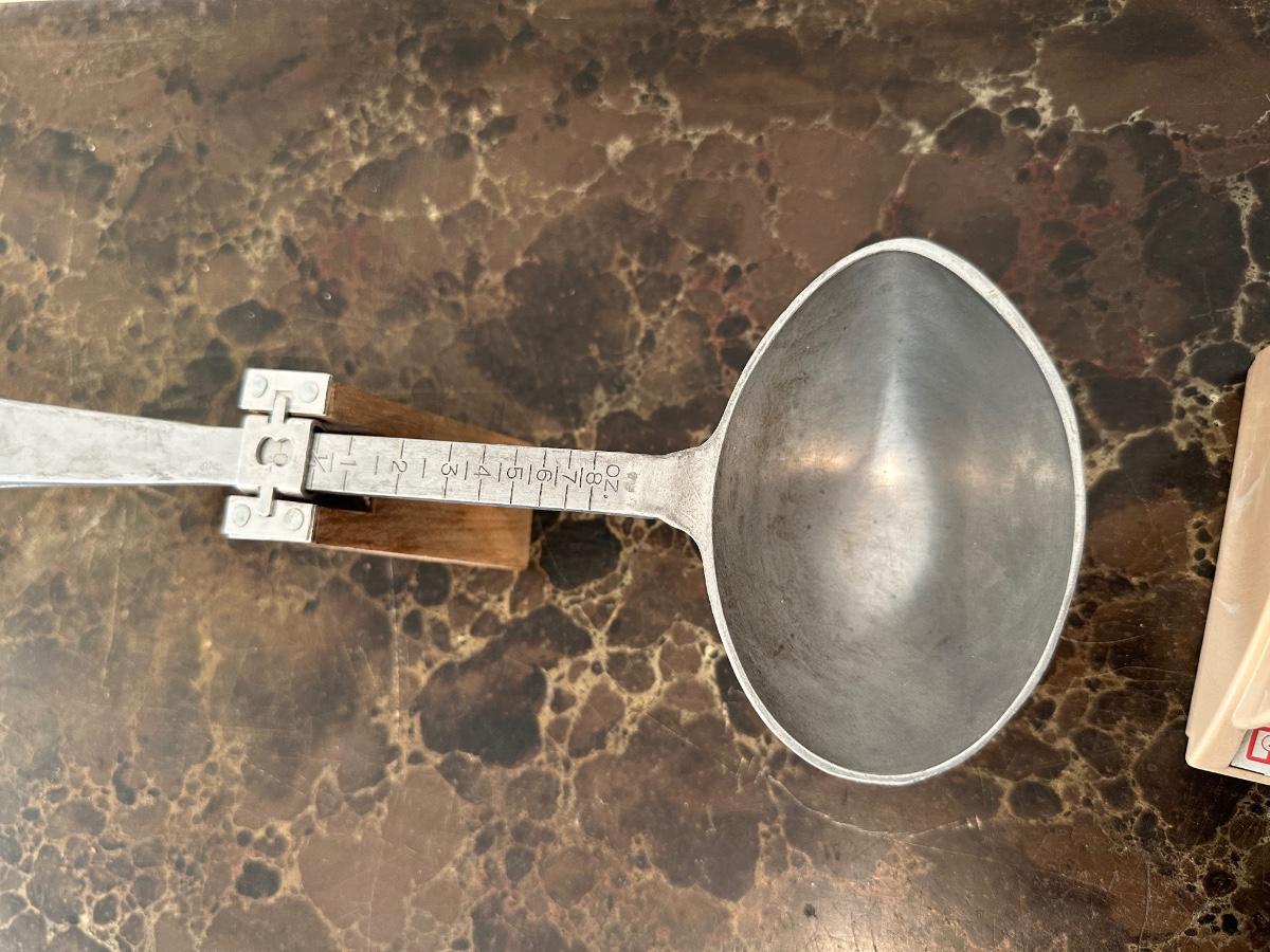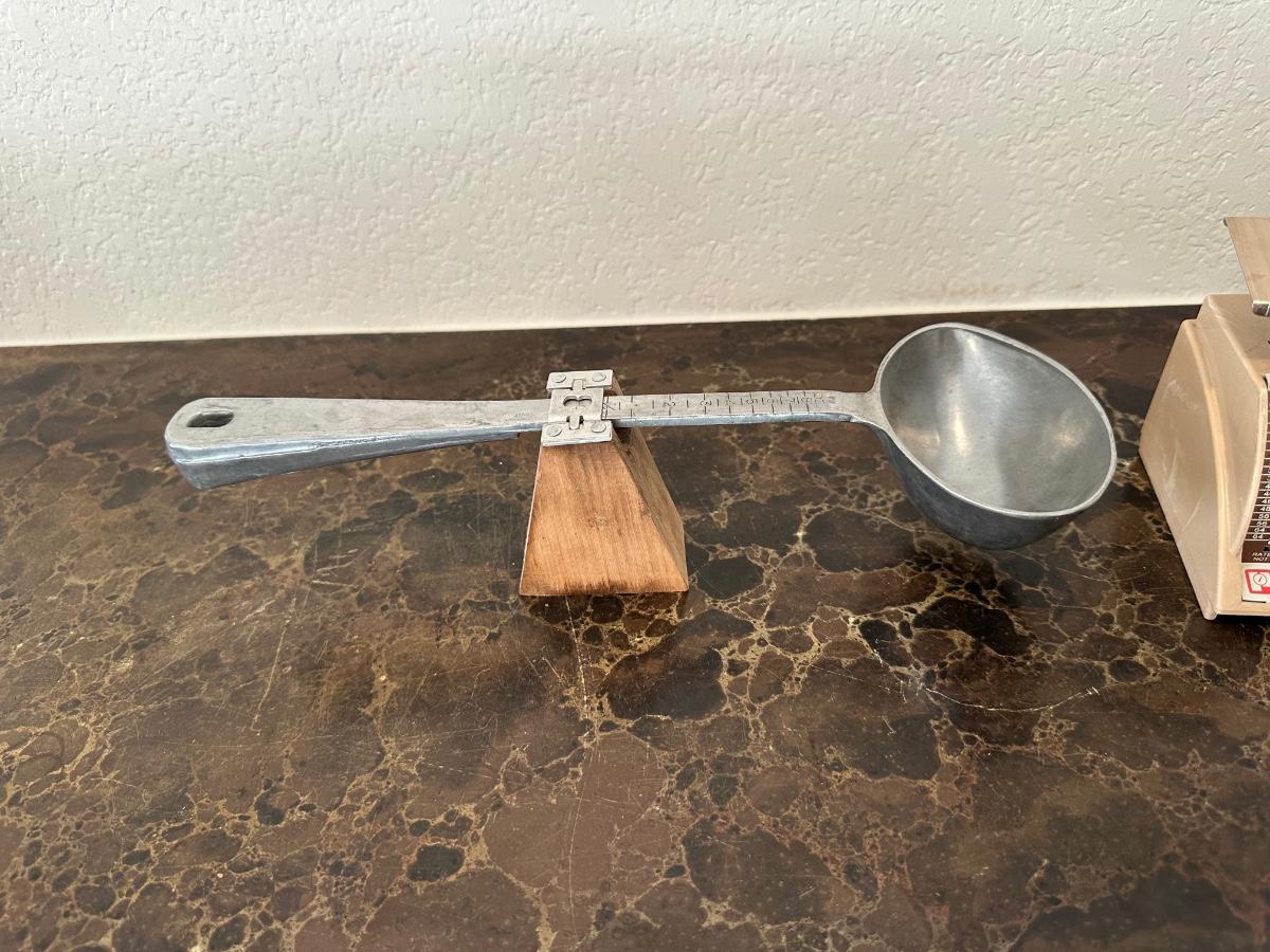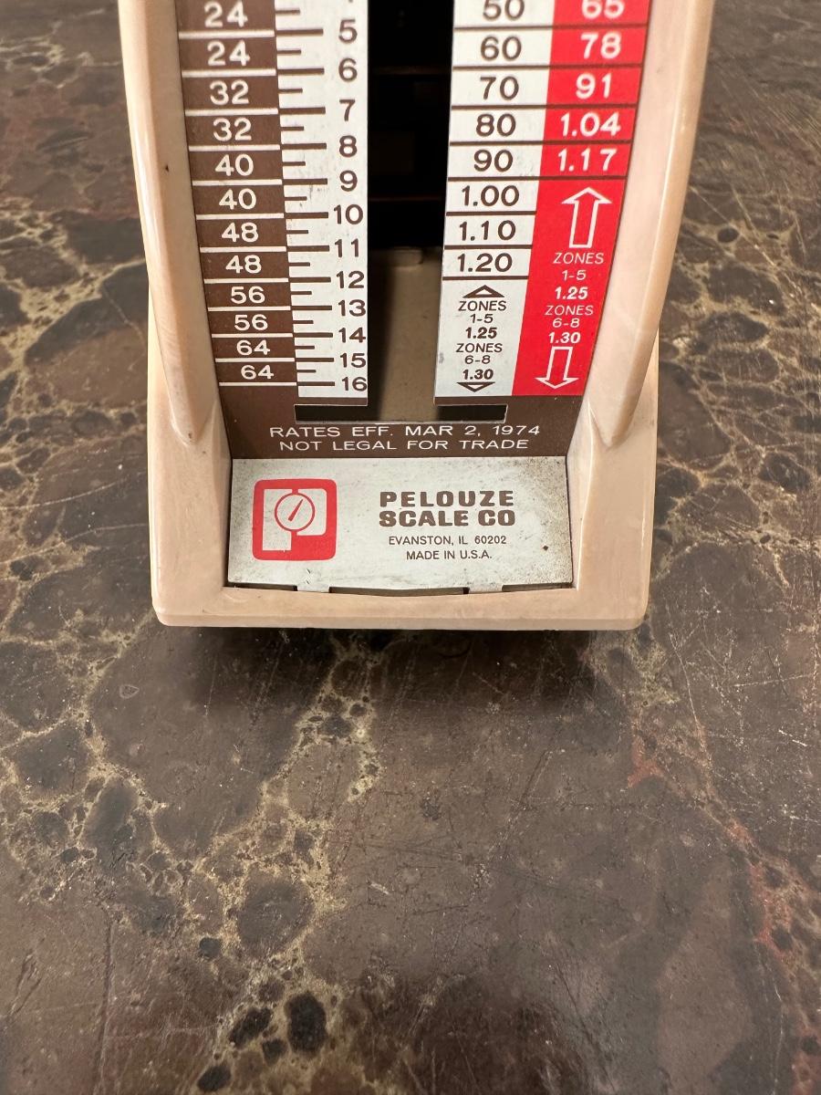 VINTAGE BALANCE MEASURING SPOON AND PELOUZE PETITE MODEL P-1 POSTAGE SCALE